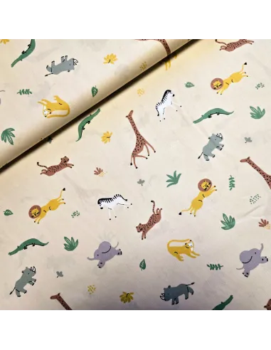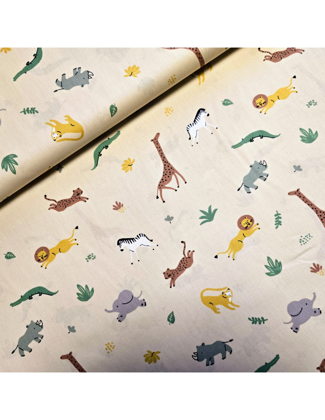Popeline de coton avec des animaux de la savane. Design exclusif POPPY. Tissu doux, résistant, facile à coudre. Certifié Oeko-Tex® (sans substances nocives) et BIO. Idéal pour vêtements légers et accessoires.