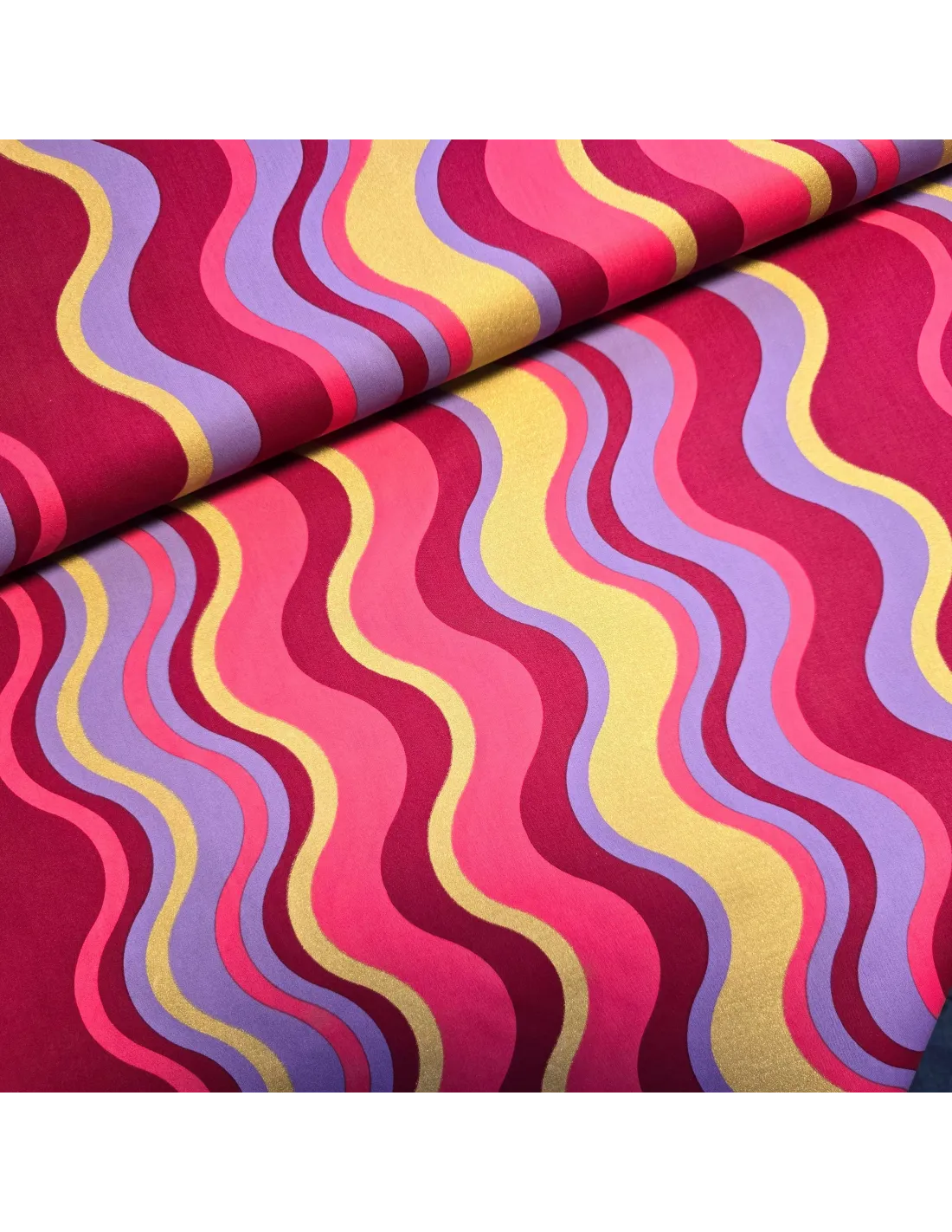 Popeline de coton imprimée aux vagues rose et lurex doré. Design exclusif POPPY. Tissu doux, résistant, facile à coudre. Certifié Oeko-Tex® (sans substances nocives). Idéal pour vêtements légers et accessoires.