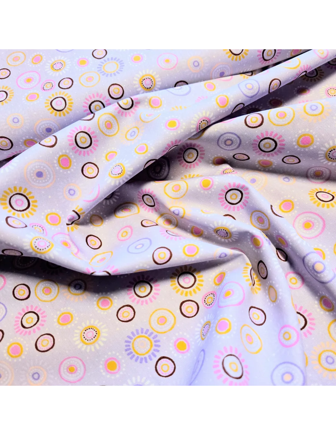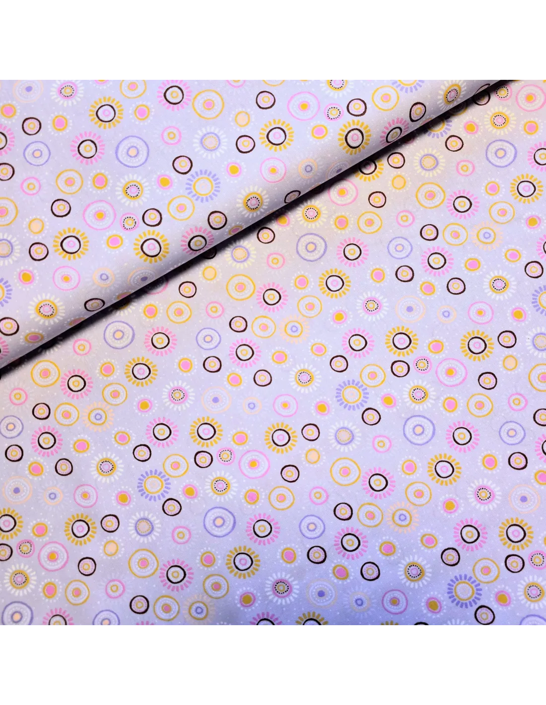 Popeline de coton aux soleils jaunes et roses sur fond mauve