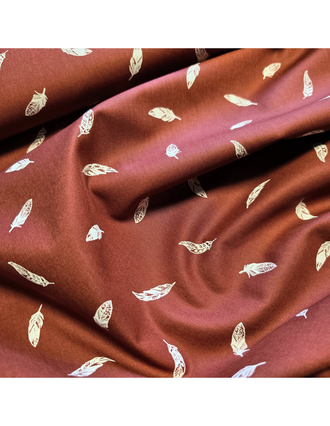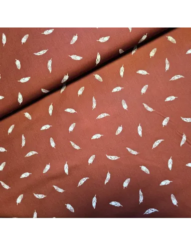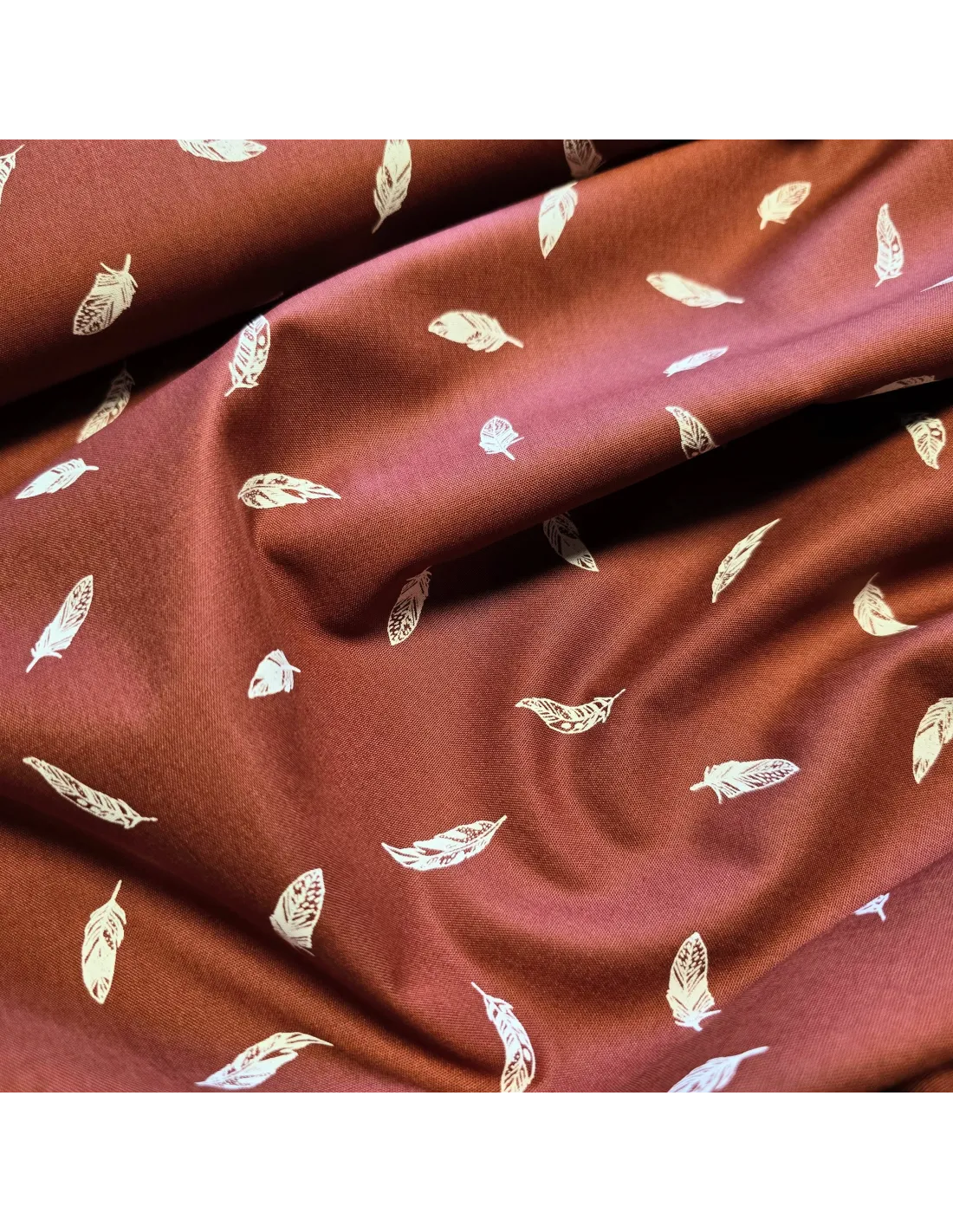 Popeline de coton imprimée plumes blanches sur fond terracotta.