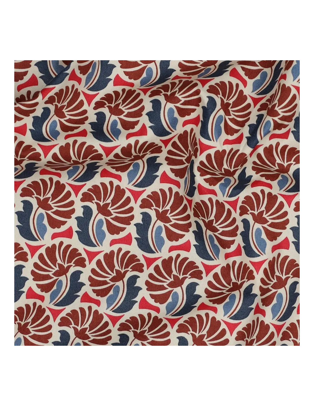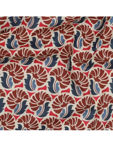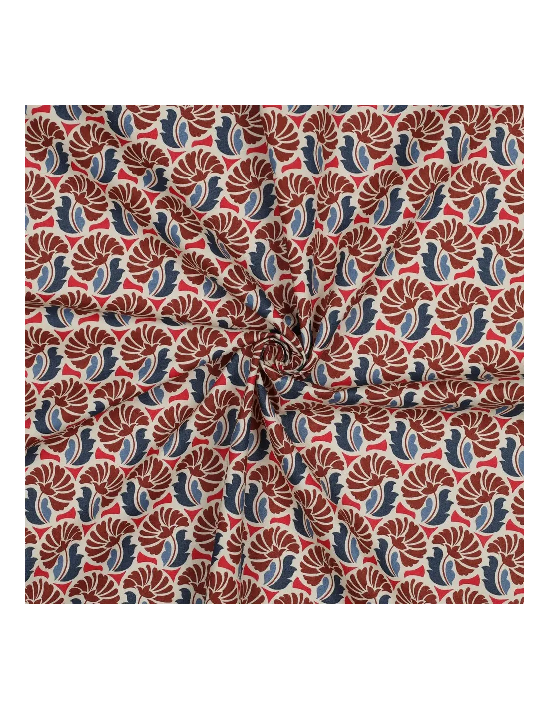Plongez dans l'ambiance des années 70 avec cette popeline de coton aux motifs floraux envoûtants. Le design, une création originale de POPPY, évoque un style rétro et joyeux, avec ses fleurs stylisées dans des teintes harmonieuses de bleu jean, de marron terreux et de rouge flamboyant.