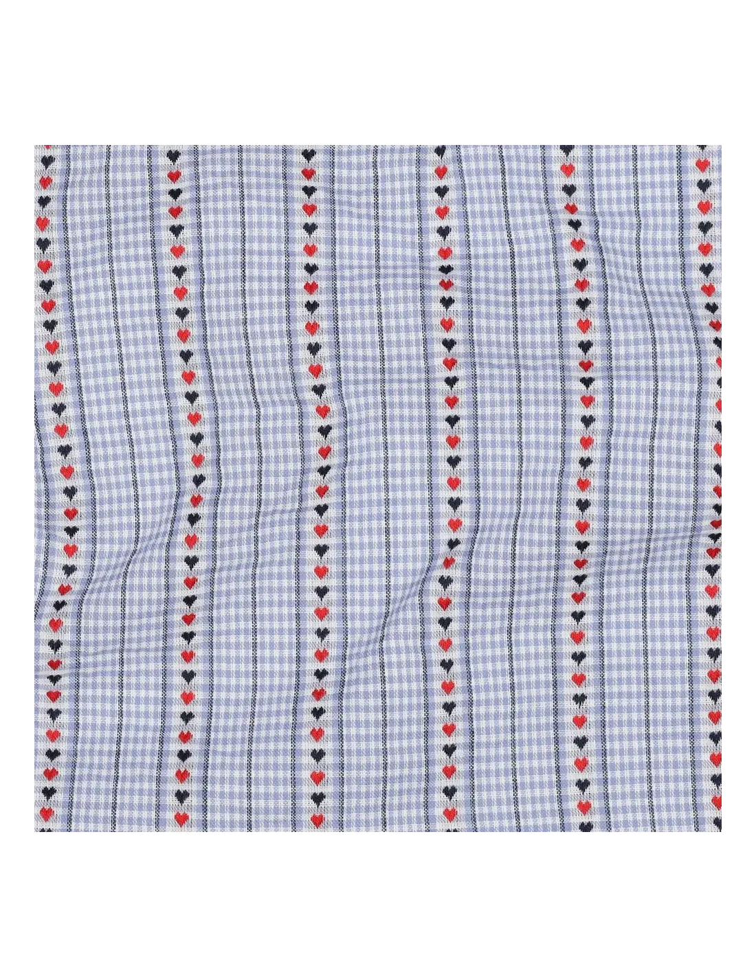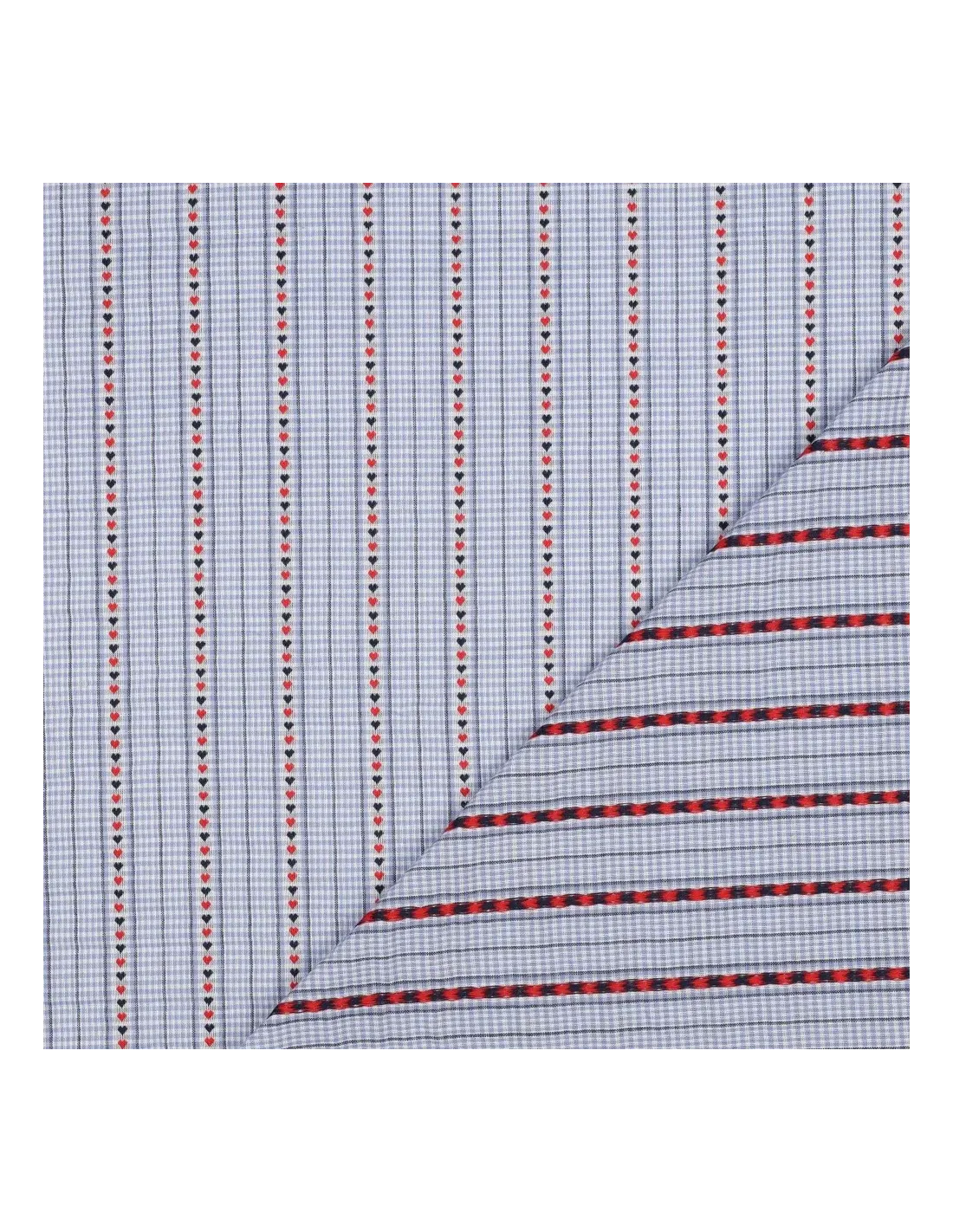 Succombez au charme intemporel de ce tissu jacquard en 100% coton, à la fois délicat et plein de caractère. Sa conception unique allie des rayures bleues et blanches à un motif original de lignes de cœurs rouges et noirs, ajoutant une touche de fantaisie et de poésie à ce classique revisité. Le tissage jacquard confère au tissu un relief subtil et une texture agréable au toucher.