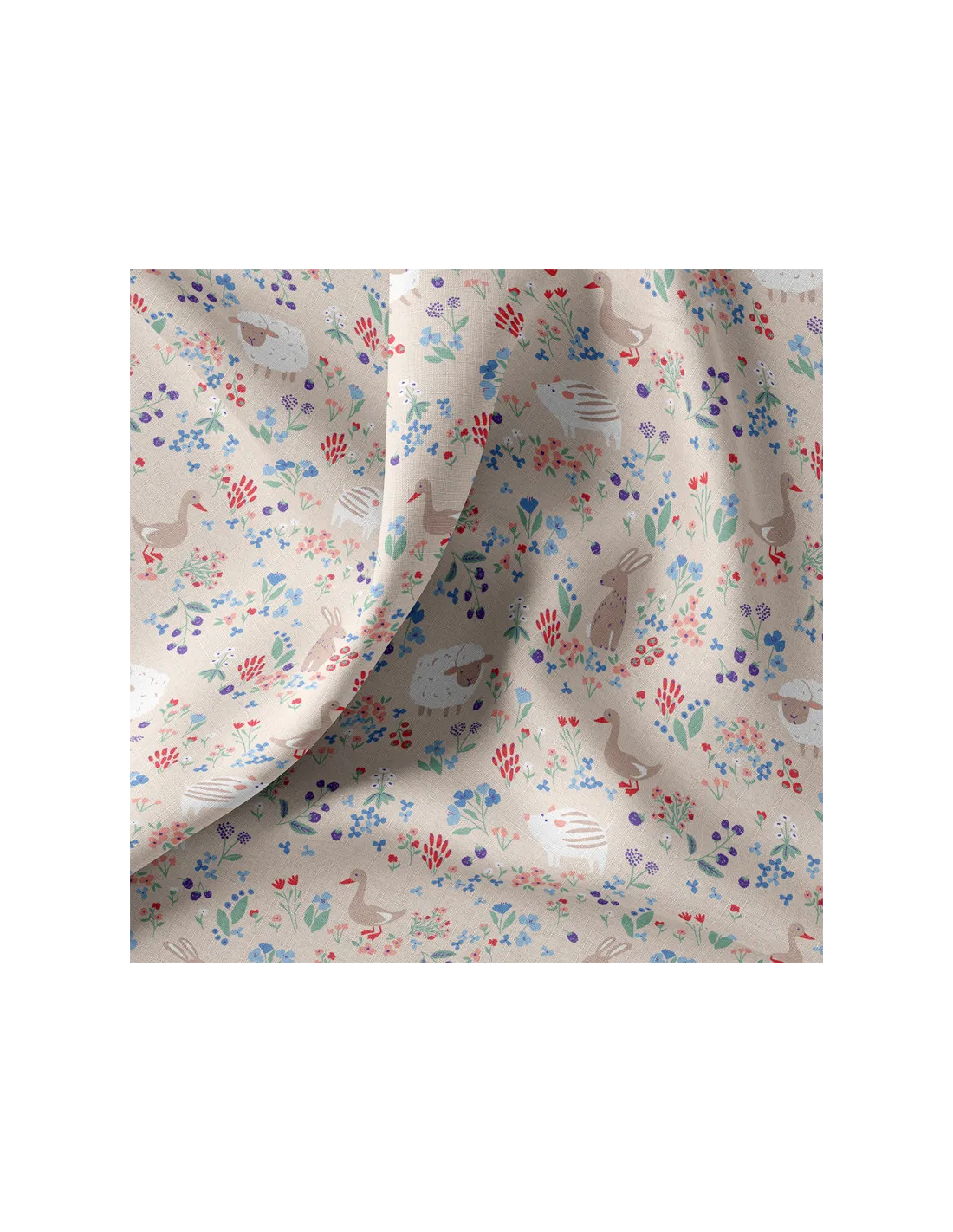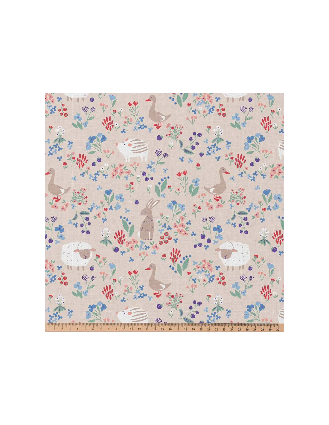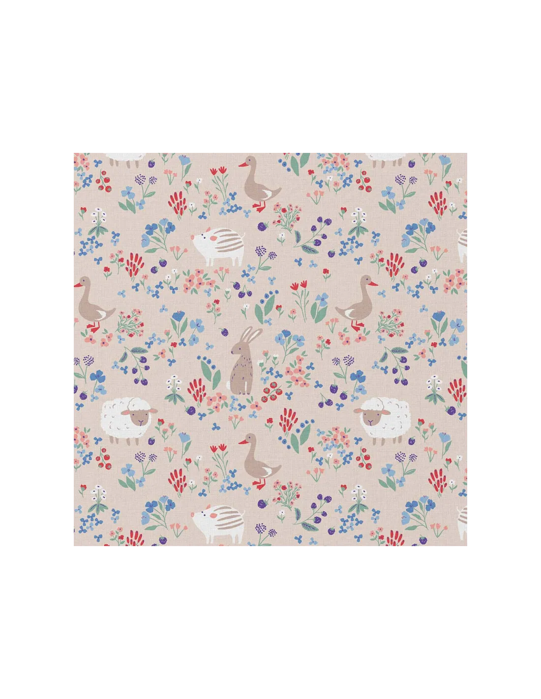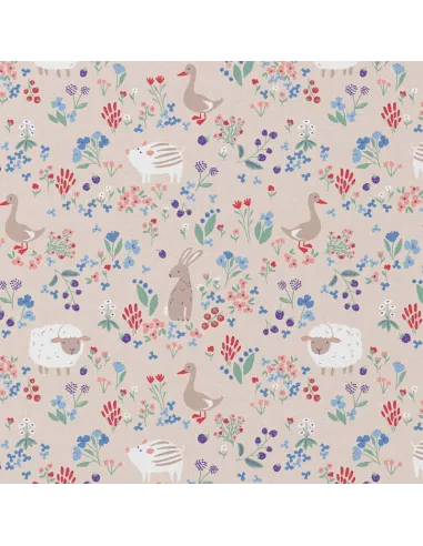 Motif : Un motif "all-over" d'animaux de la ferme tels que le cochon, l'oie, le lapin, et d'autres amis du jardin. Les animaux sont représentés de maniÚre enfantine et attachante.