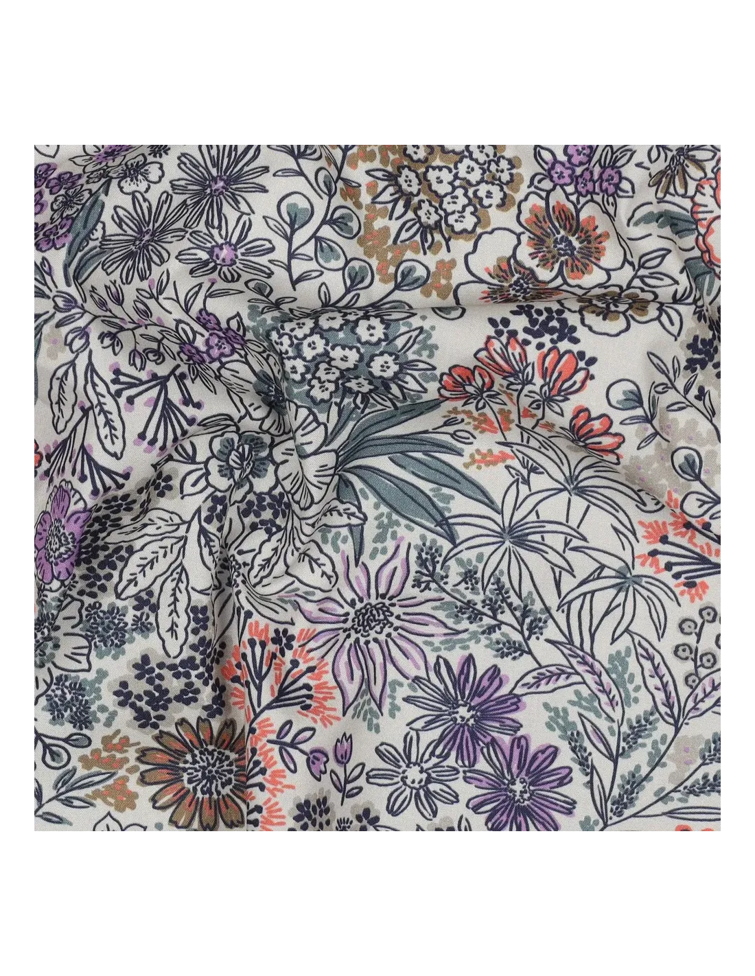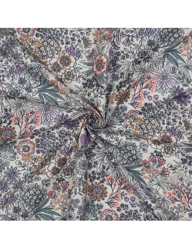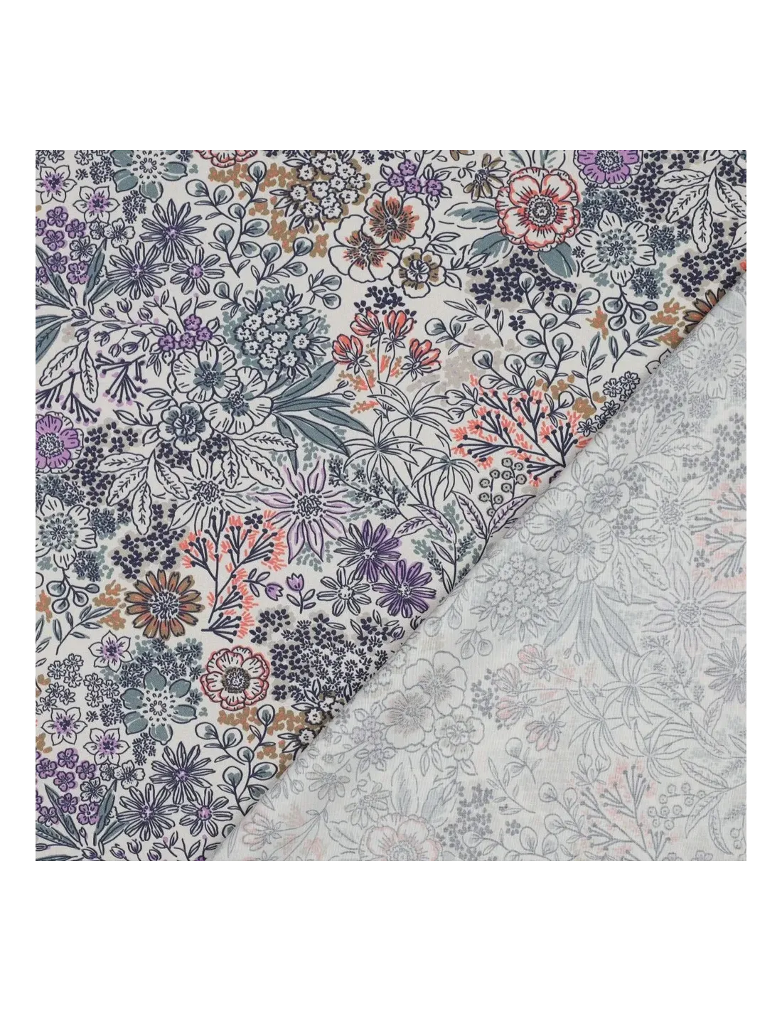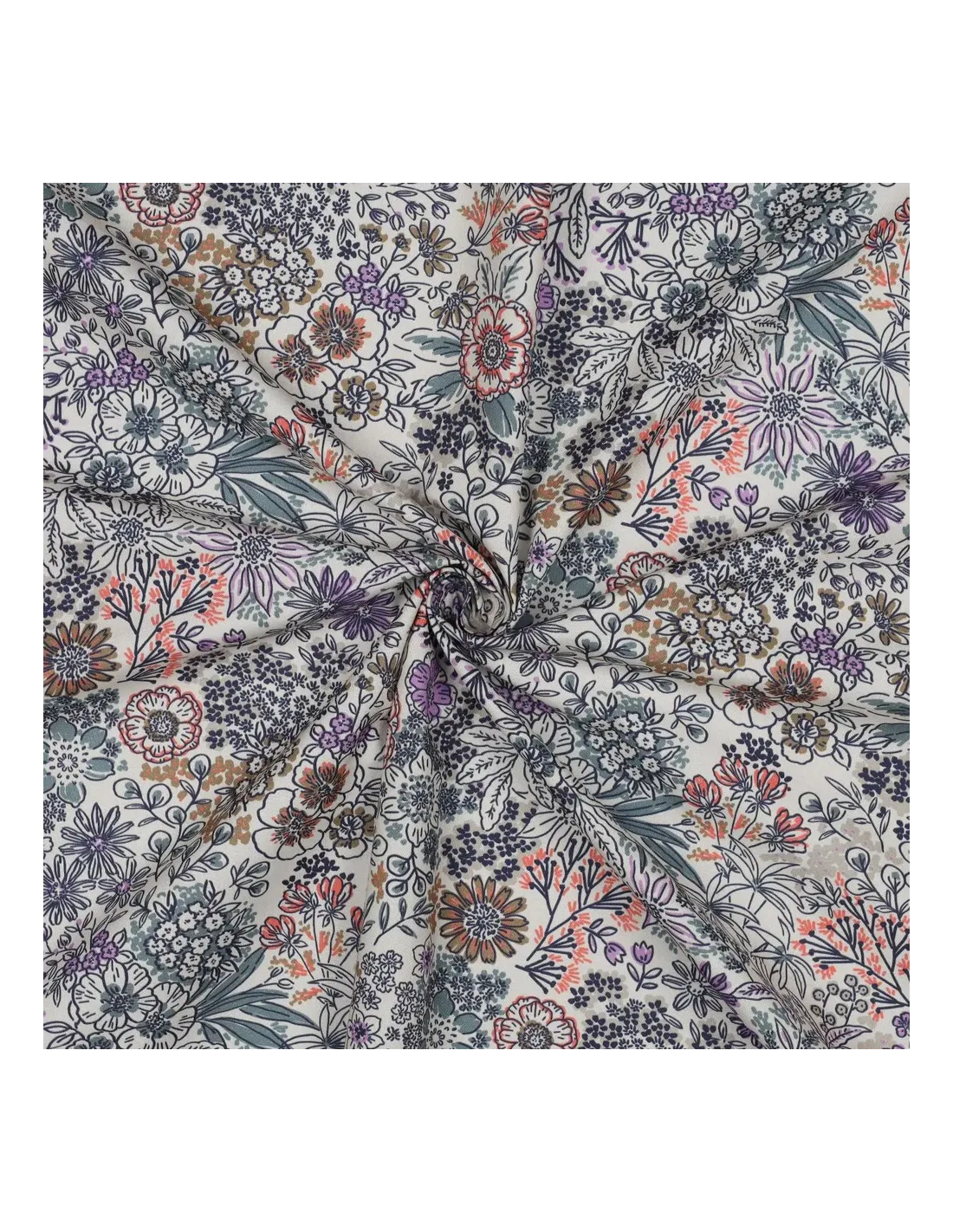 Craquez pour le charme délicat de cette popeline de coton, qui vous invite à créer des pièces empreintes de douceur et d'élégance. Ce tissu est orné de motifs floraux stylisés aux couleurs pastels et raffinées : des nuances de vert tendre, de mauve délicat et d'orange lumineux. L'impression digitale haute définition capture la subtilité des couleurs et la finesse des détails, donnant aux motifs un aspect presque pictural.