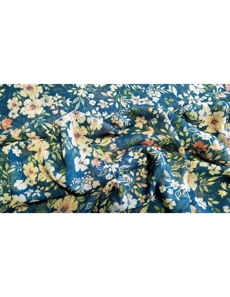 Tissu mousseline léger fleuri avec lurex sur fond vert emeraude