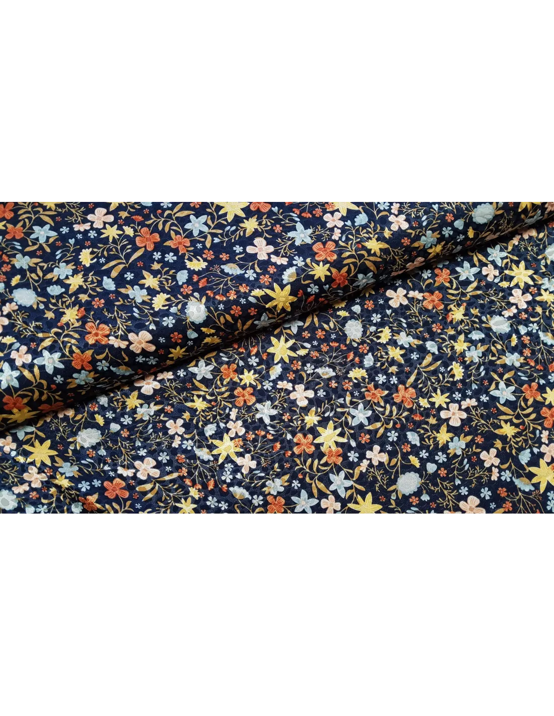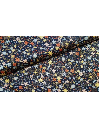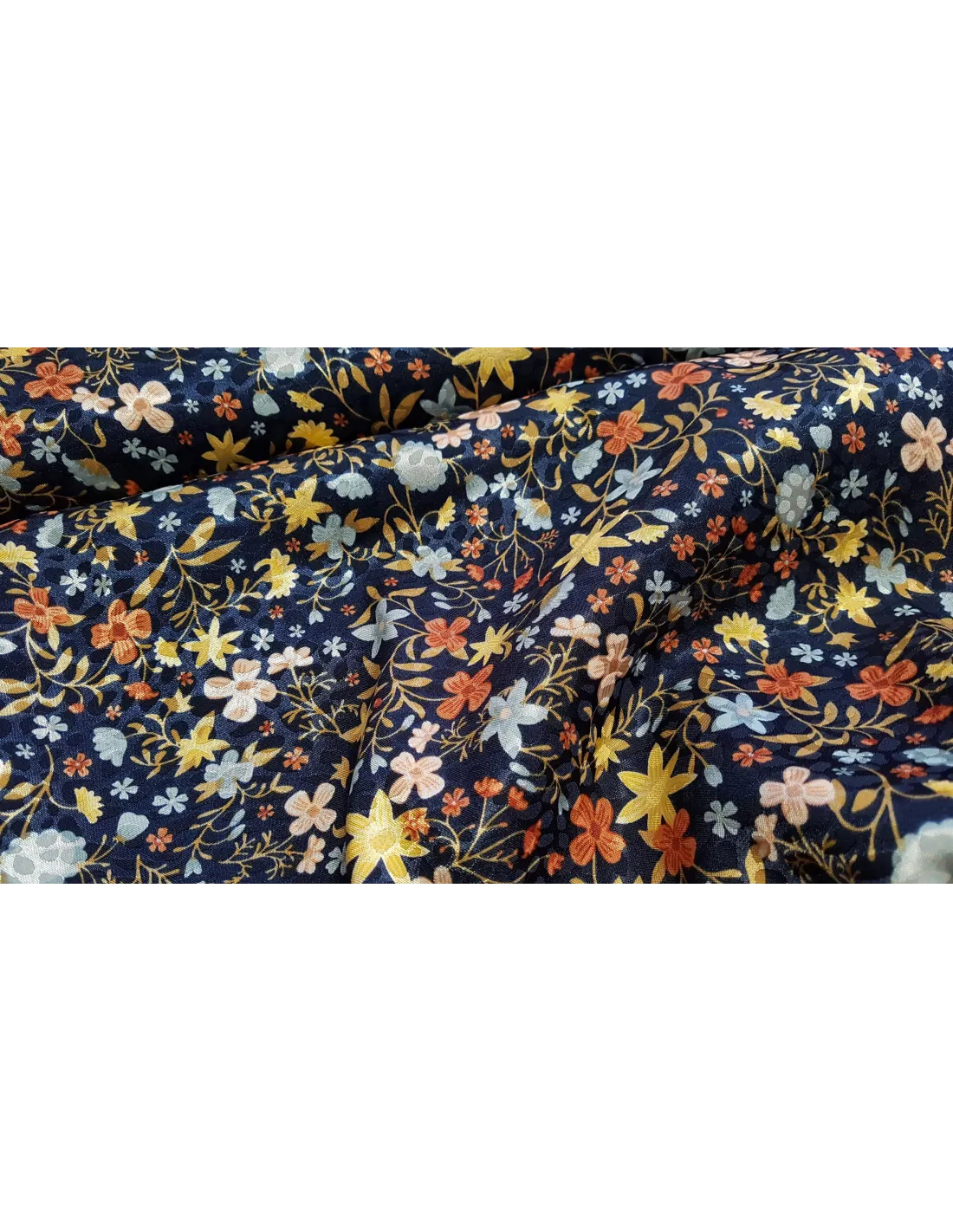 Très beau tissu satiné fleurs sur un fond marine. Aspect soie au toucher, très agréable. Magnifique tombé pour la confection de robes ou petits hauts.