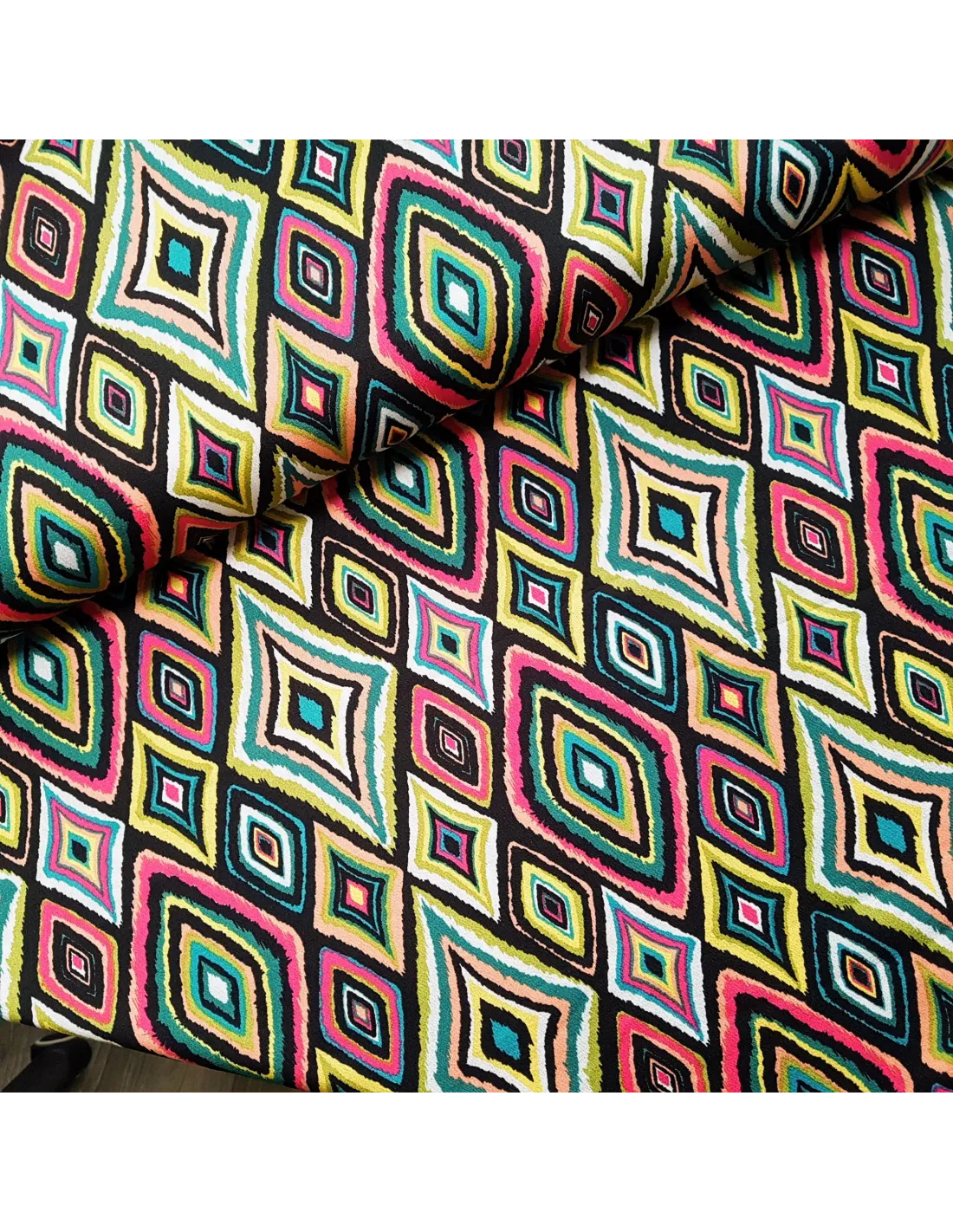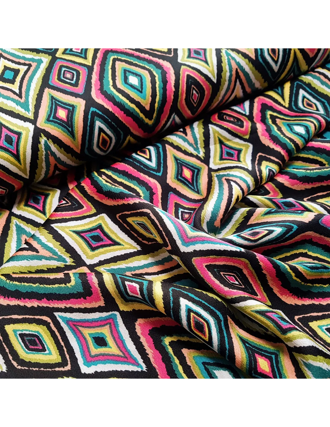 Tissu crêpe léger polyester imprimé avec des losanges colorés. Parfait pour un haut ou une petite robe.
