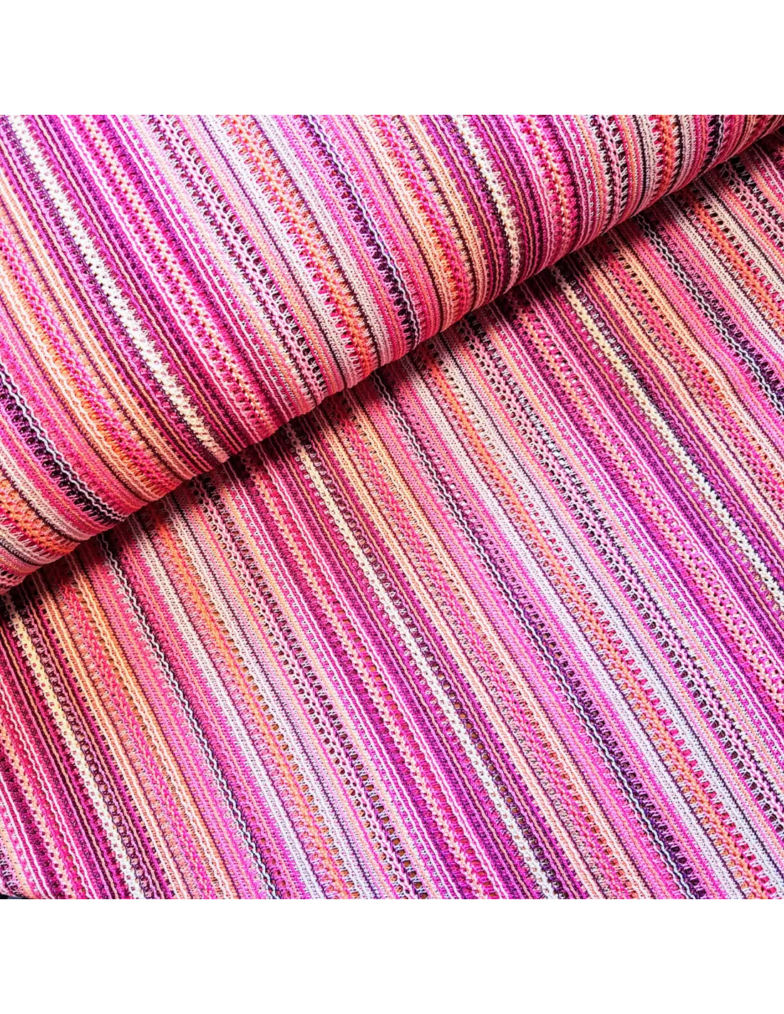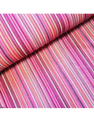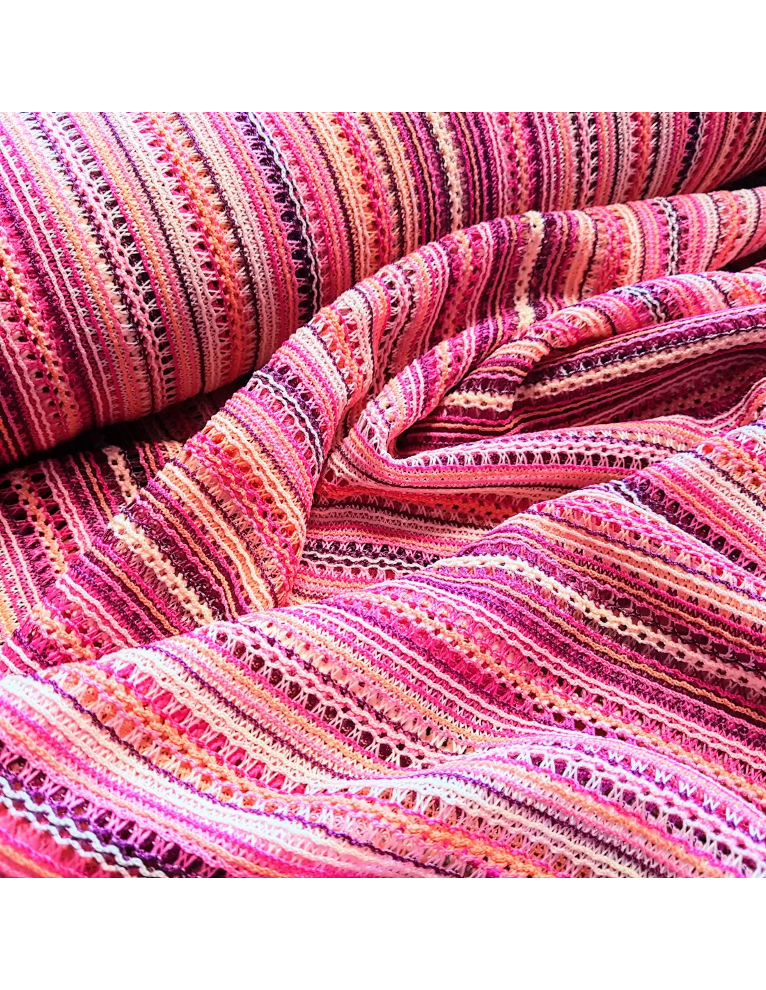 Filet macramé aux rayures dans les tons de roses. Il est souple et légèrement extensible de par son tissage et son élasthanne. Il sera parfait pour l'habillement ou pour un sac par exemple.