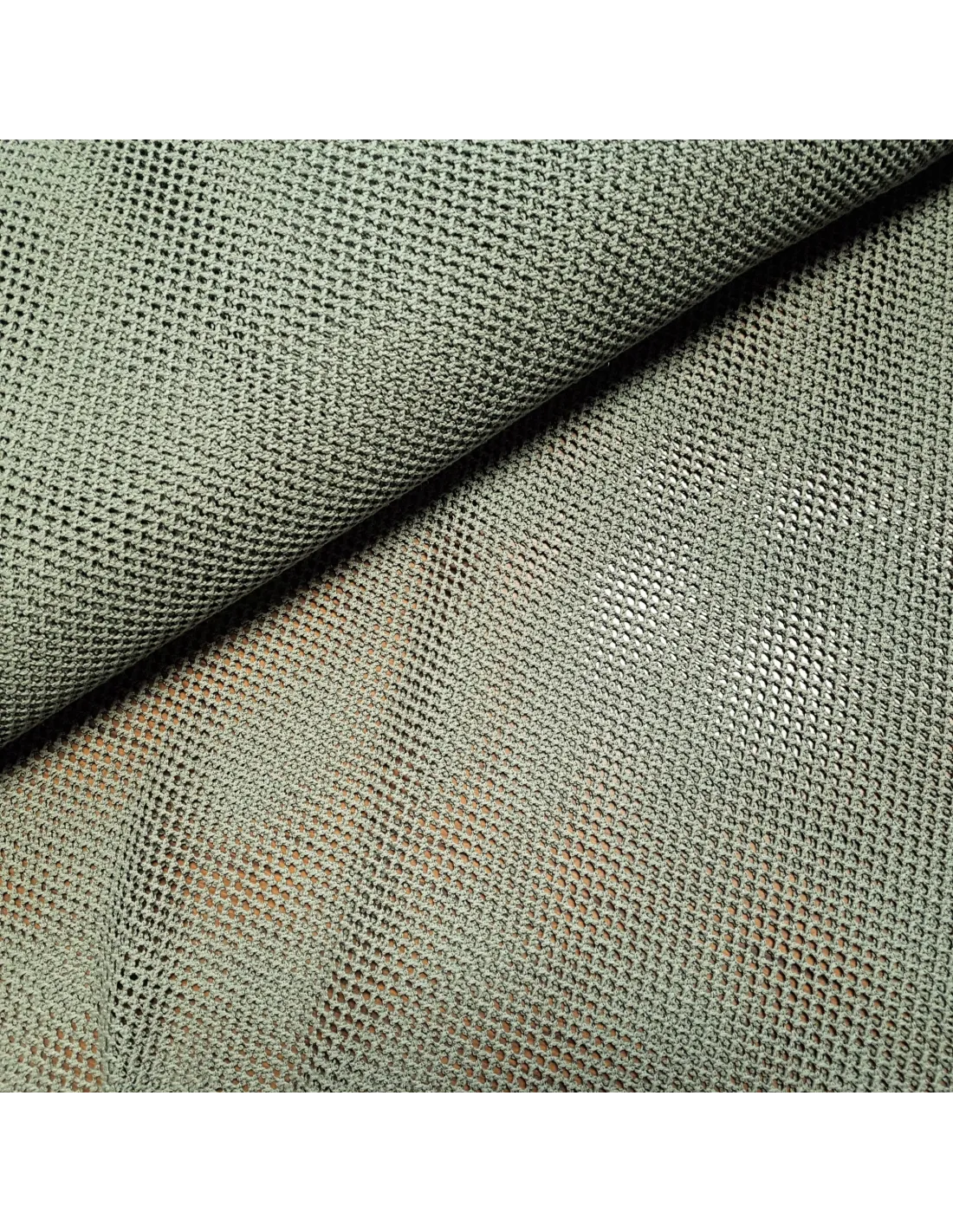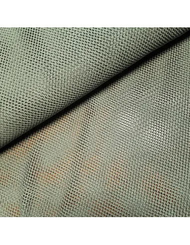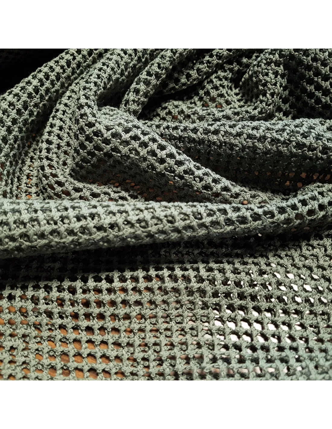 Filet macramé vert kaki. Il est souple et légèrement extensible de par son tissage. Il sera parfait pour l'habillement ou pour un sac par exemple.