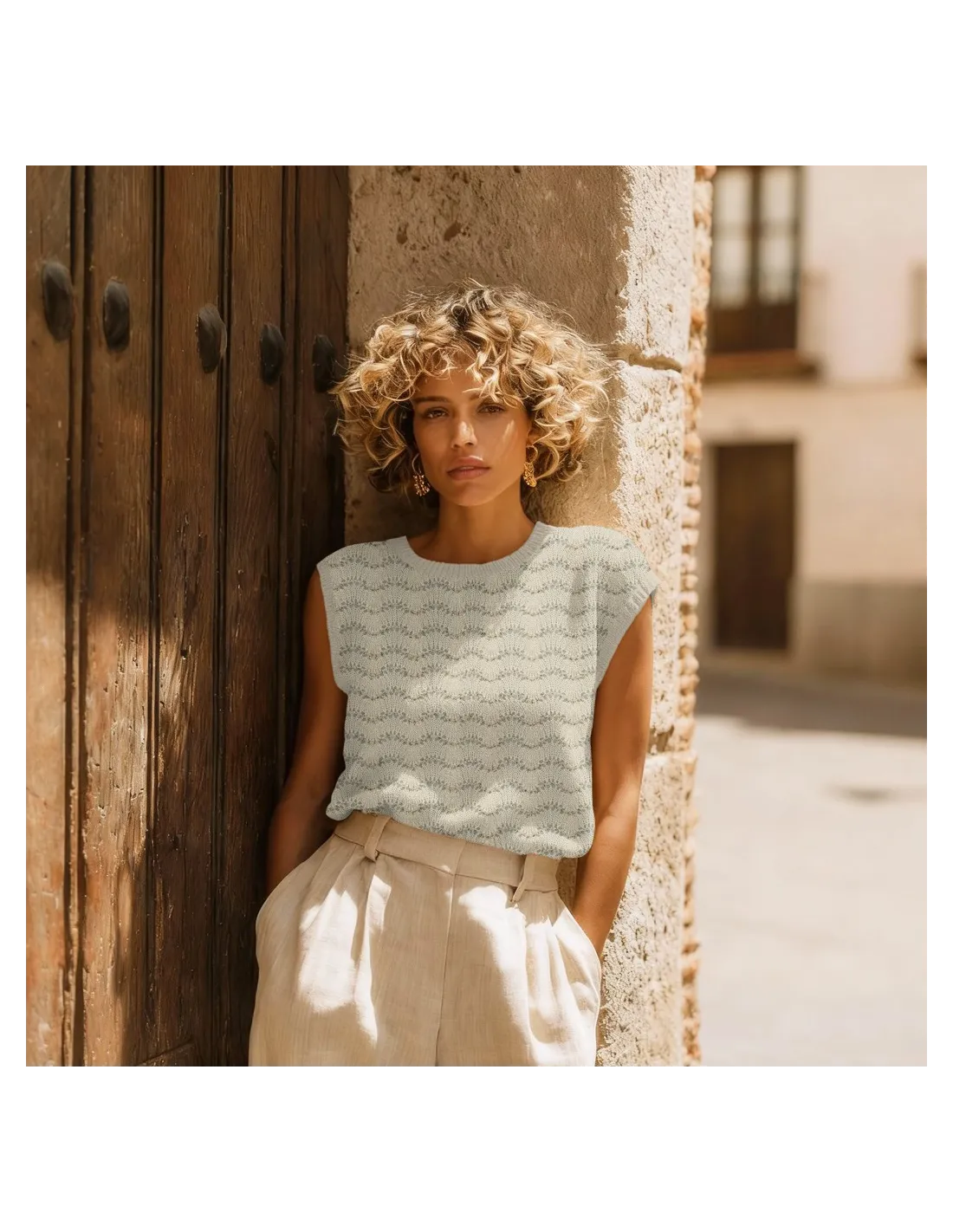 Motifs Ajourés Géométriques : Le tricotage forme des motifs en losanges et des lignes verticales ajourées, offrant une respirabilité naturelle et un style bohème chic.