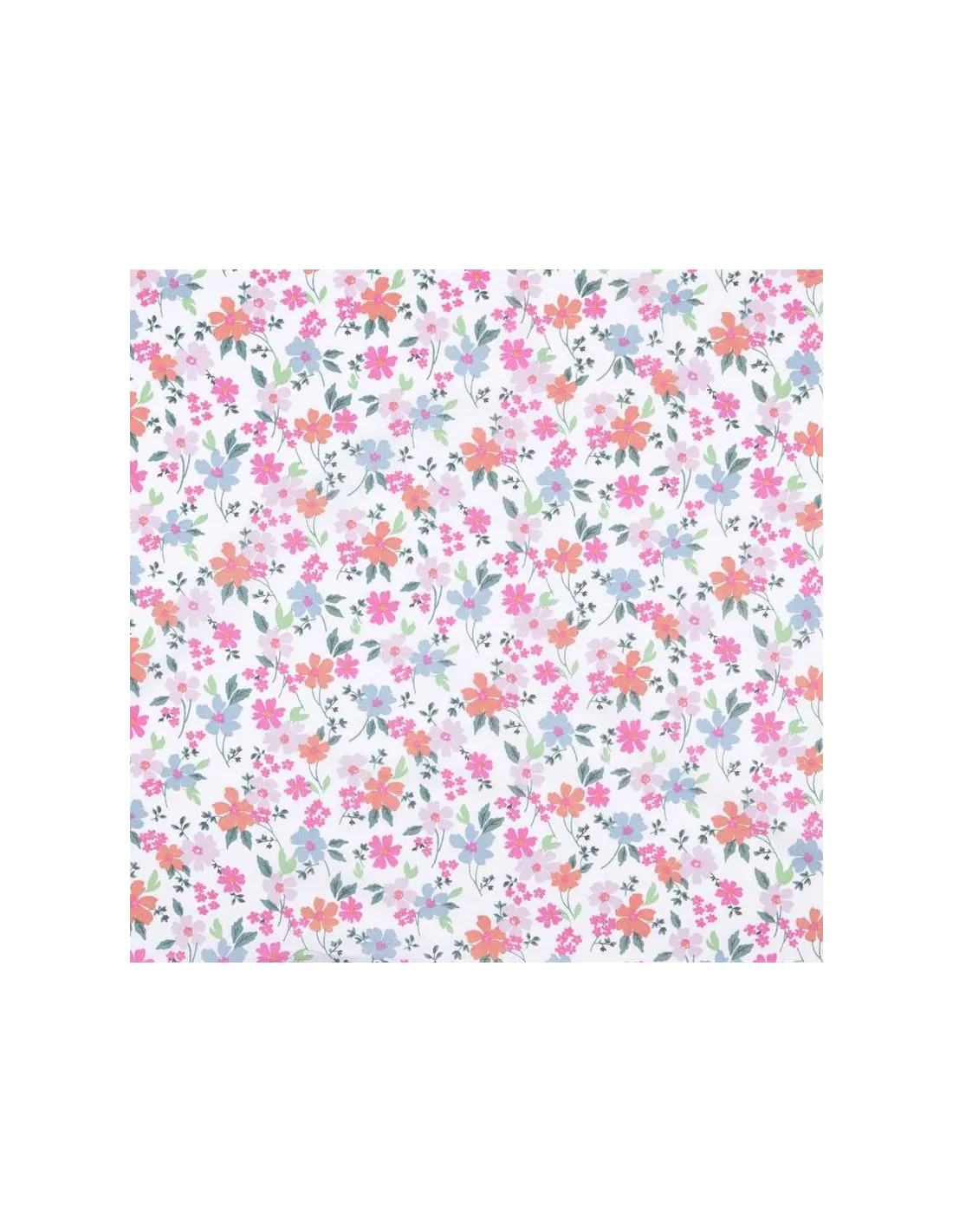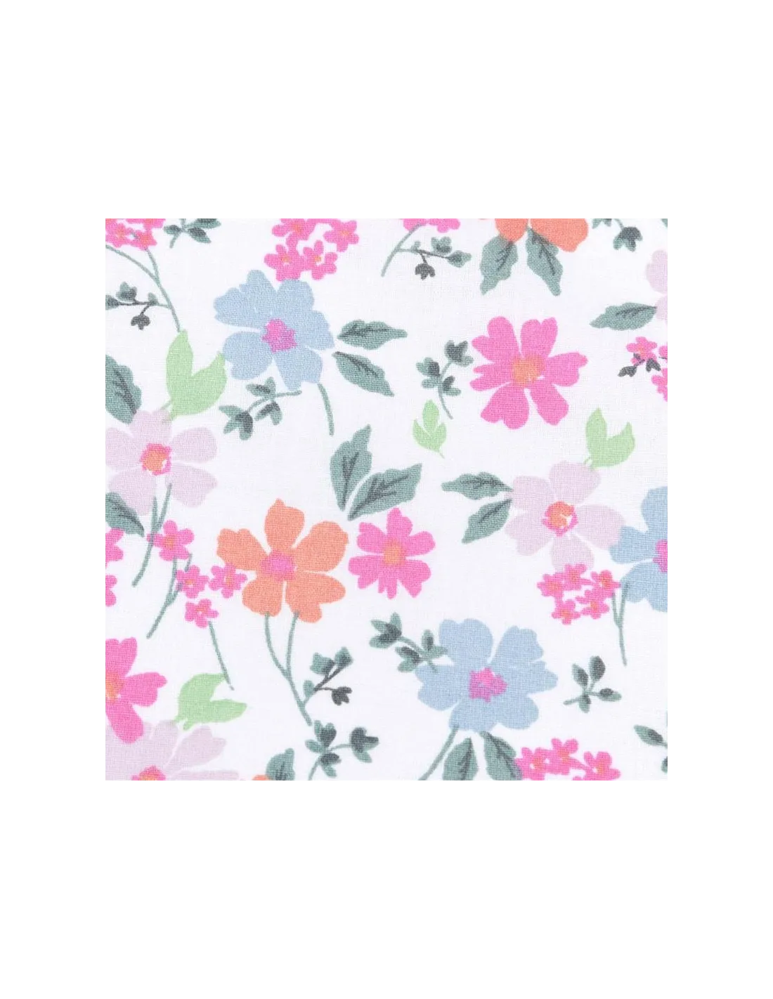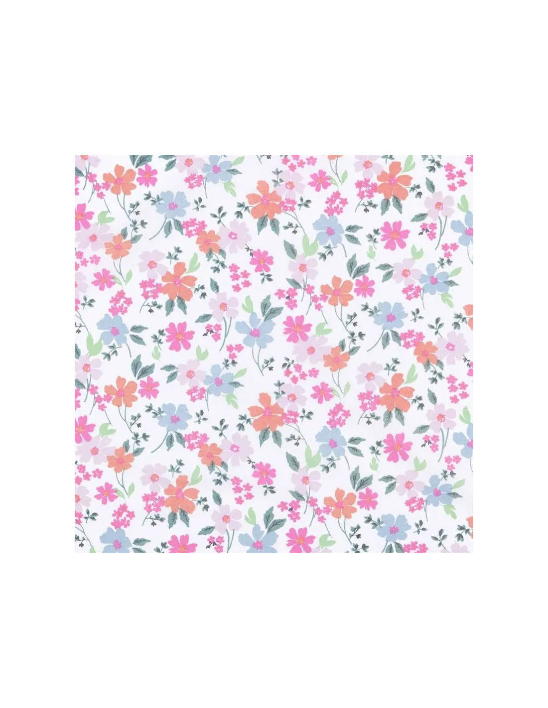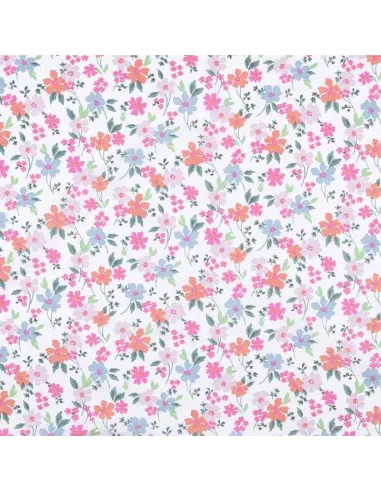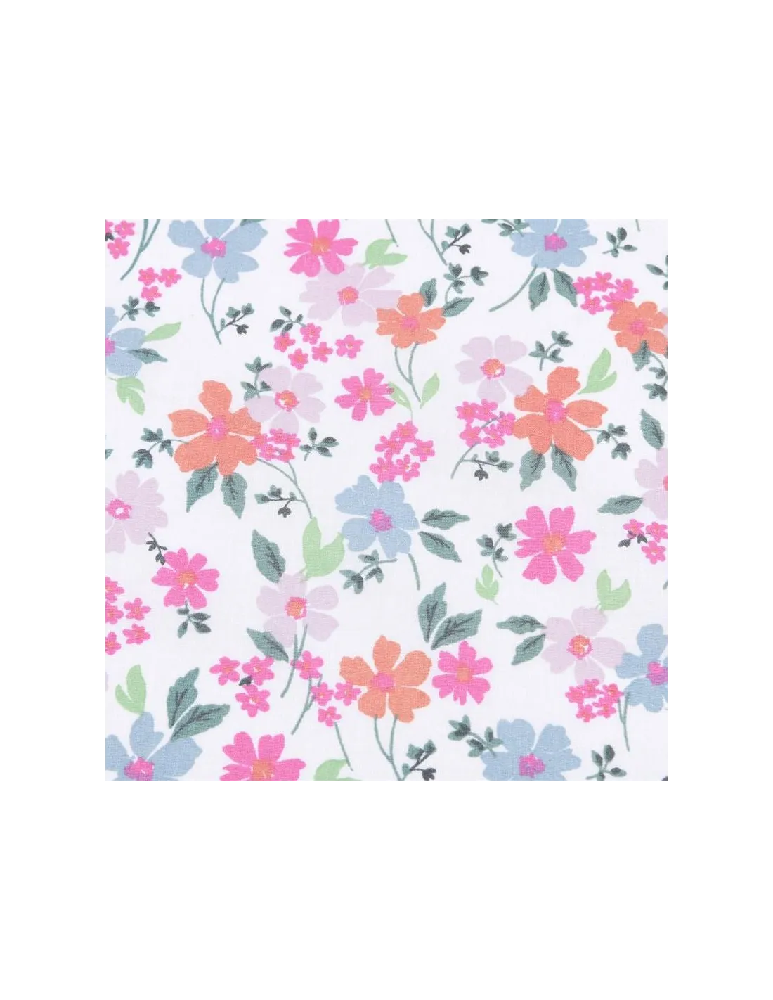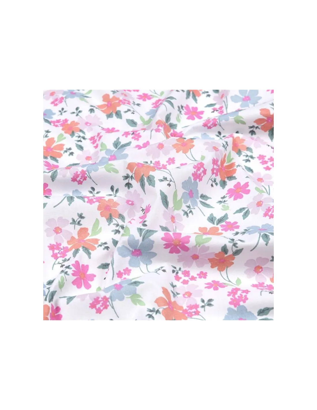 Imprimé Champêtre Stylisé : Un semis de fleurs roses et bleues avec un feuillage vert tendre sur un fond blanc lumineux, créant une ambiance douce et accueillante.