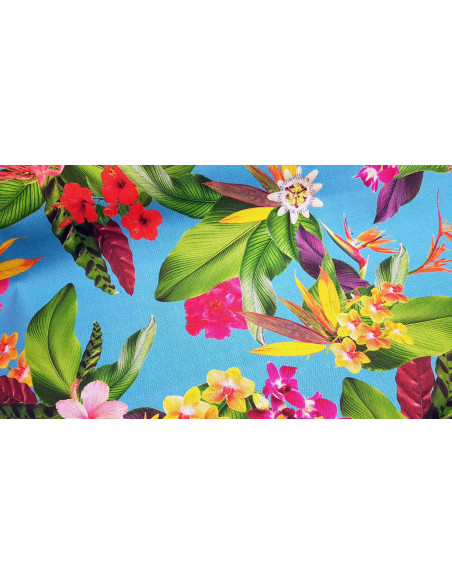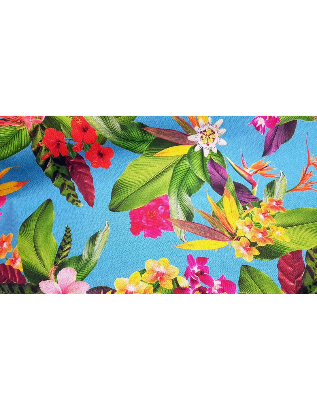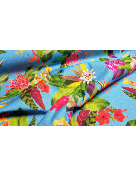 Toile de plein air dralon à motifs fleurs sur fond bleu turquoise. Ce tissu de haute qualité est très résistant avec un traitement anti-tâches et anti-UV. Parfait pour la confection de coussins extérieurs ou poufs colorés...