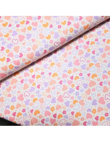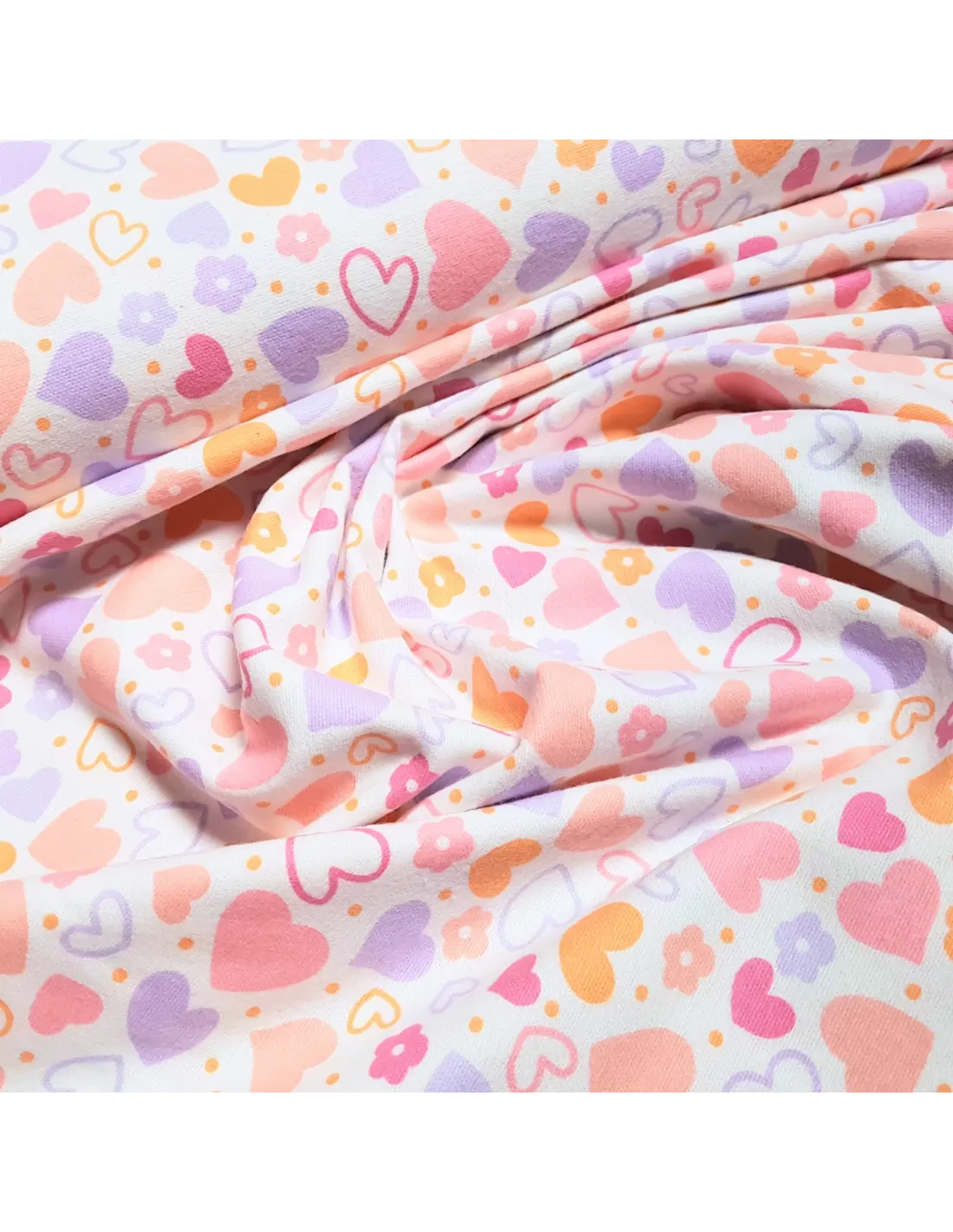 Coton gratté (ou pilou) à imprimé cœurs sur fond blanc. Ce tissu est très doux et peut servir pour la confections de pyjamas, vêtements d'intérieurs, draps...