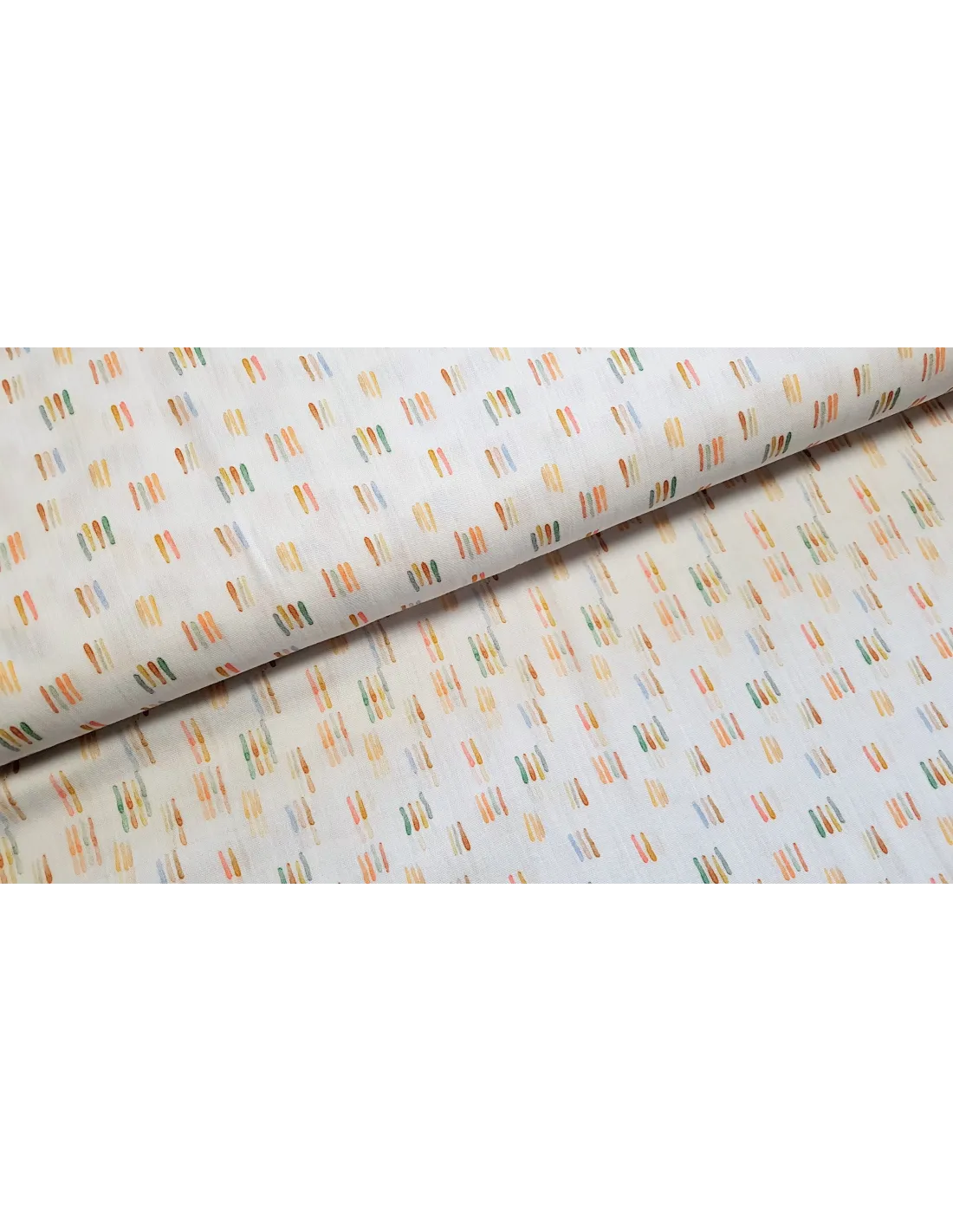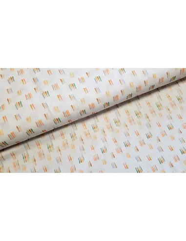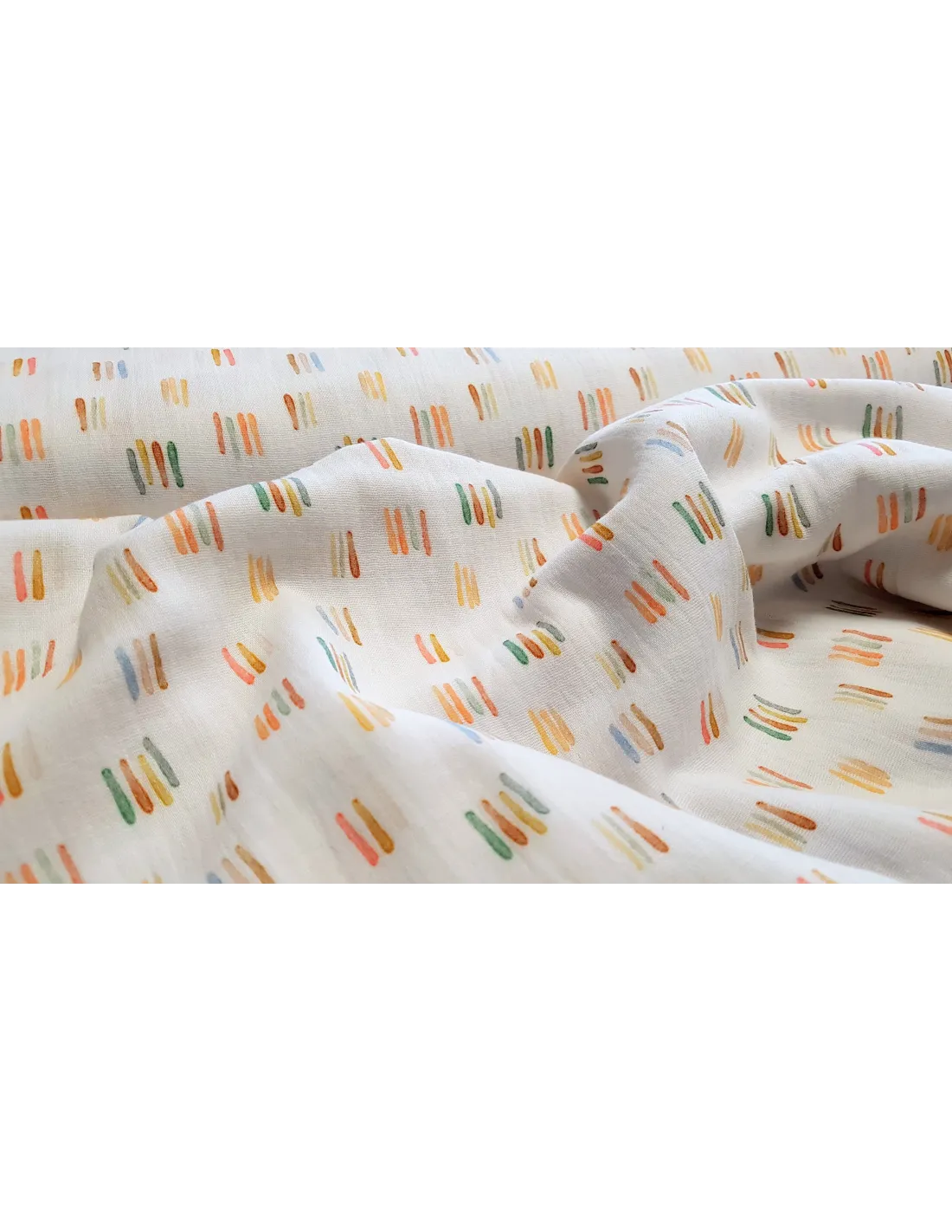 Tissu double gaze impression avec des traits colorés sur fond blanc. Pour la confections de robes, blouses ou encore de coussins et rideaux.