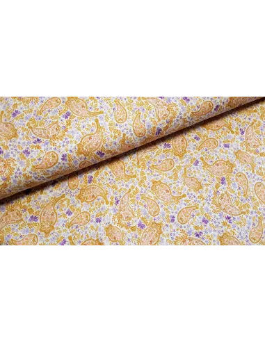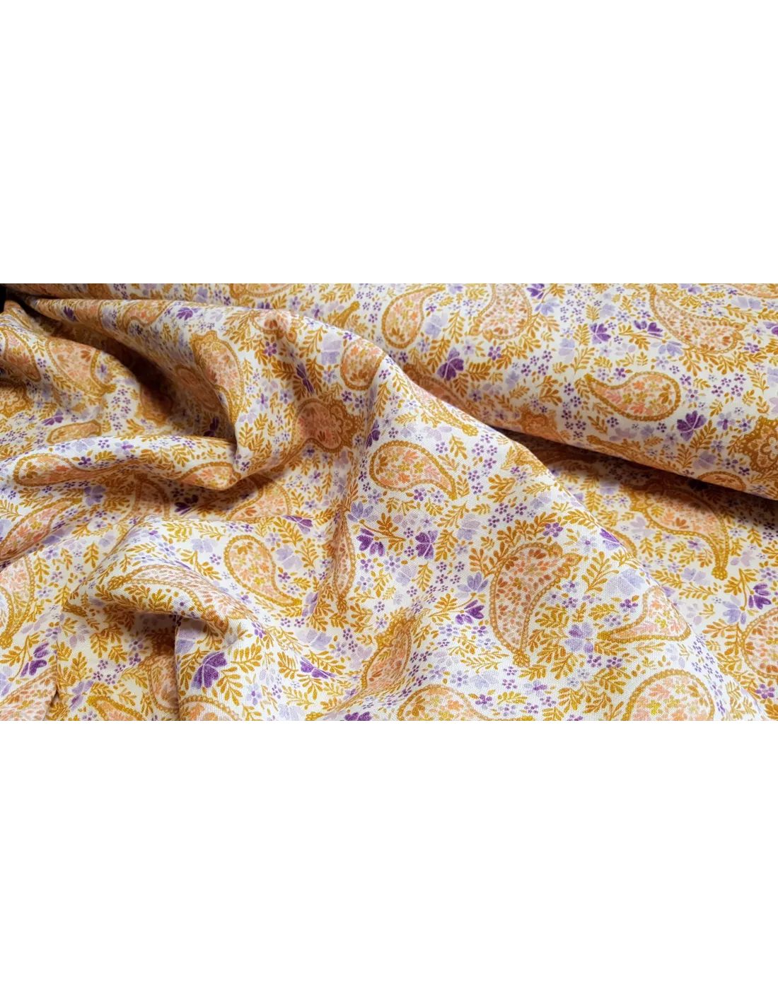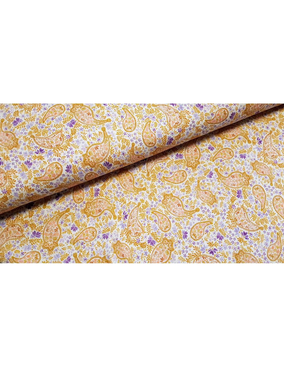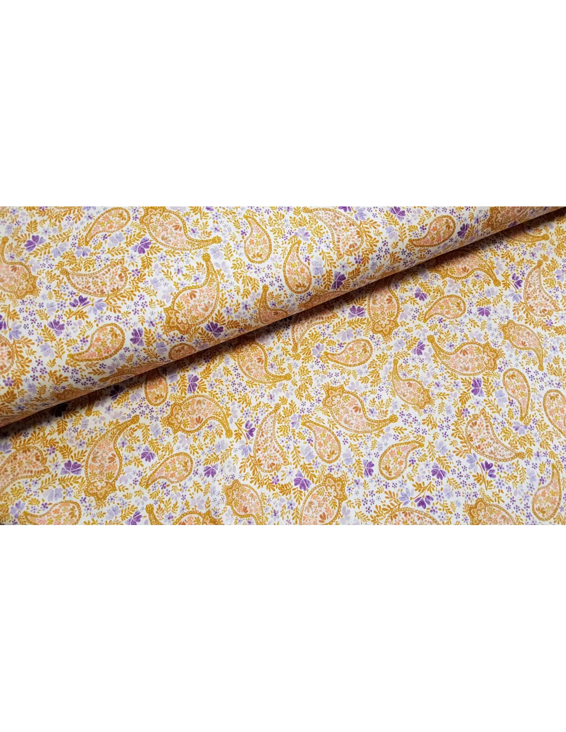 Tissu double gaze aux motifs cachemire beiges et fleurs violettes sur fond blanc. Pour la confections de robes, blouses ou encore de coussins et rideaux.