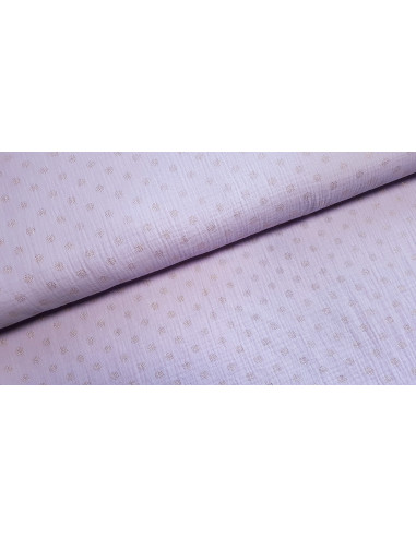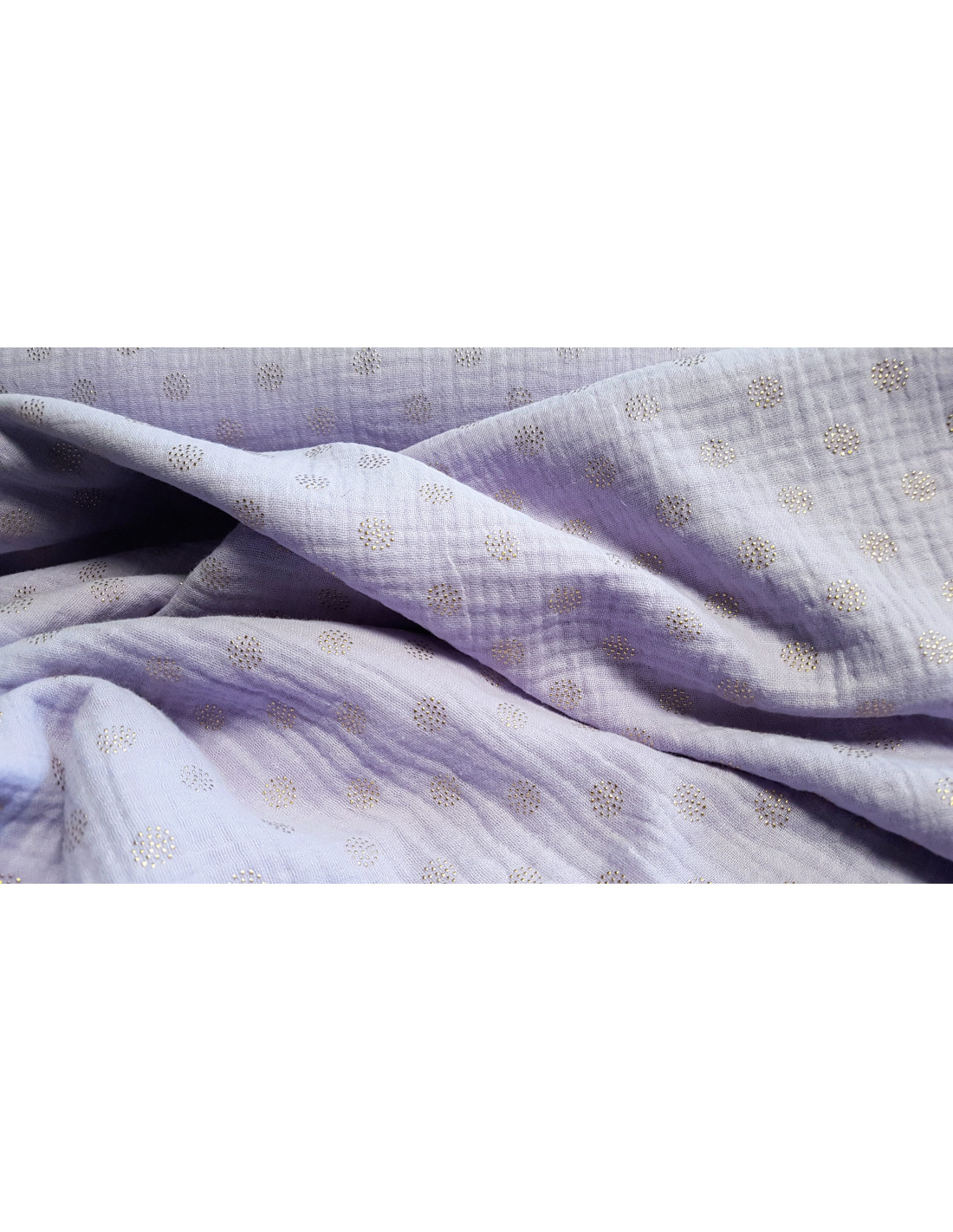 Tissu double gaze aux ronds dorés sur fond mauve. Pour la confections de robes, blouses ou encore de coussins et rideaux.