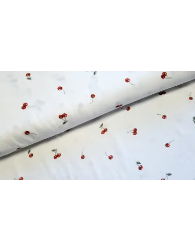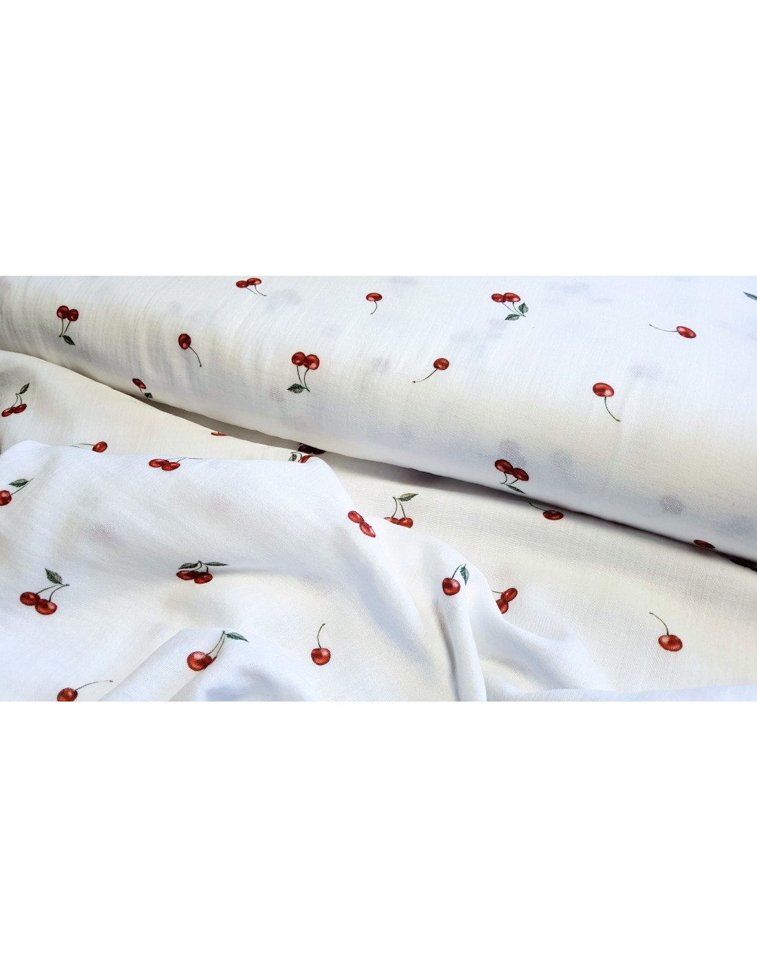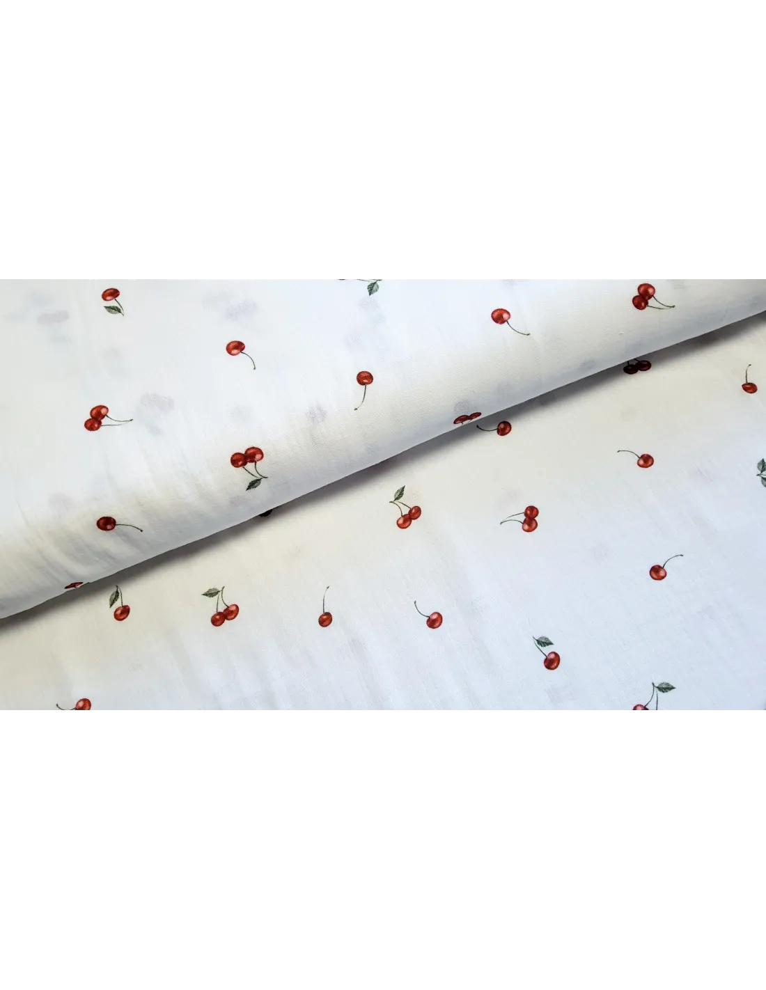 Tissu double gaze au petites cerises sur fond blanc. Pour la confections de robes, blouses ou encore de coussins et rideaux.