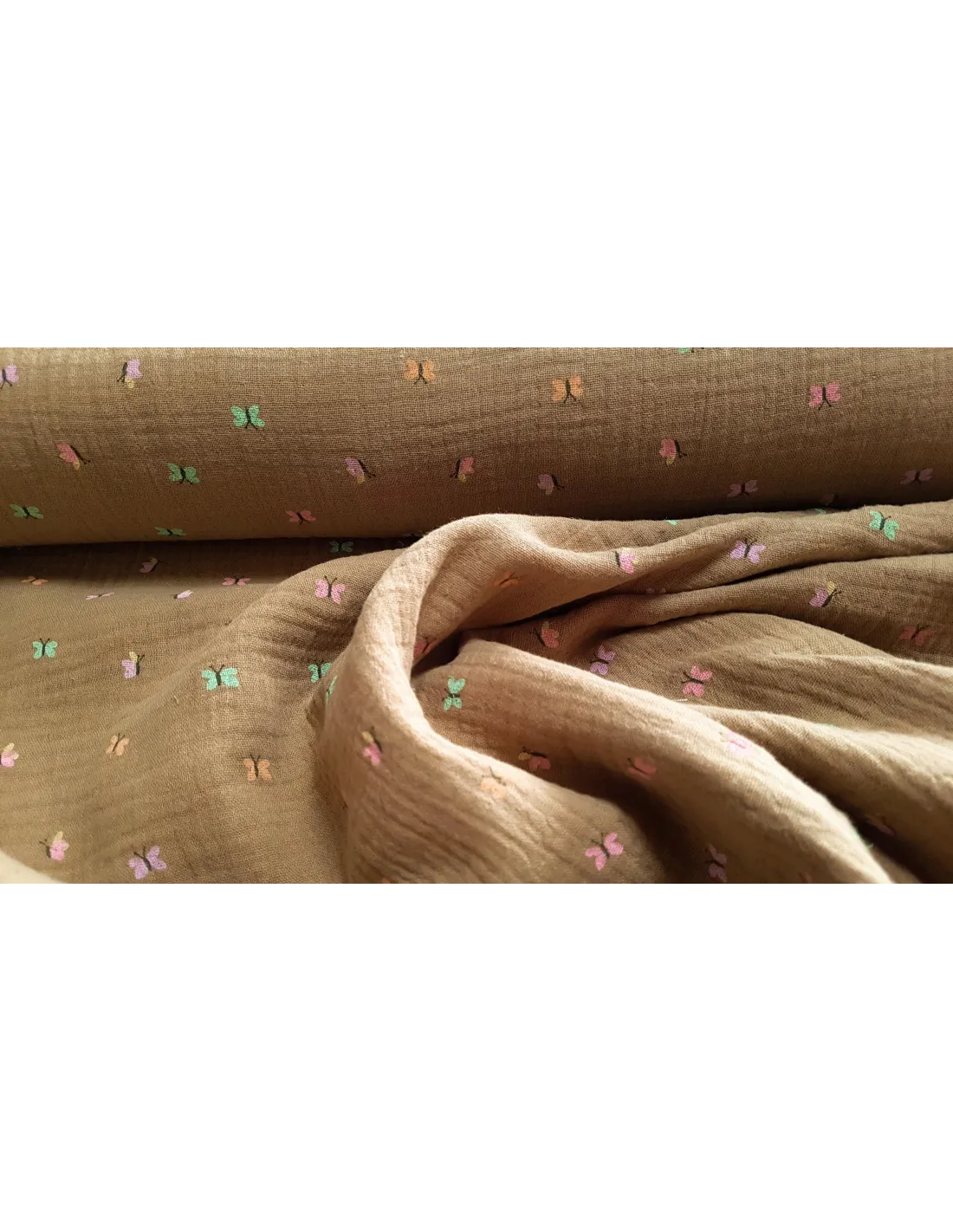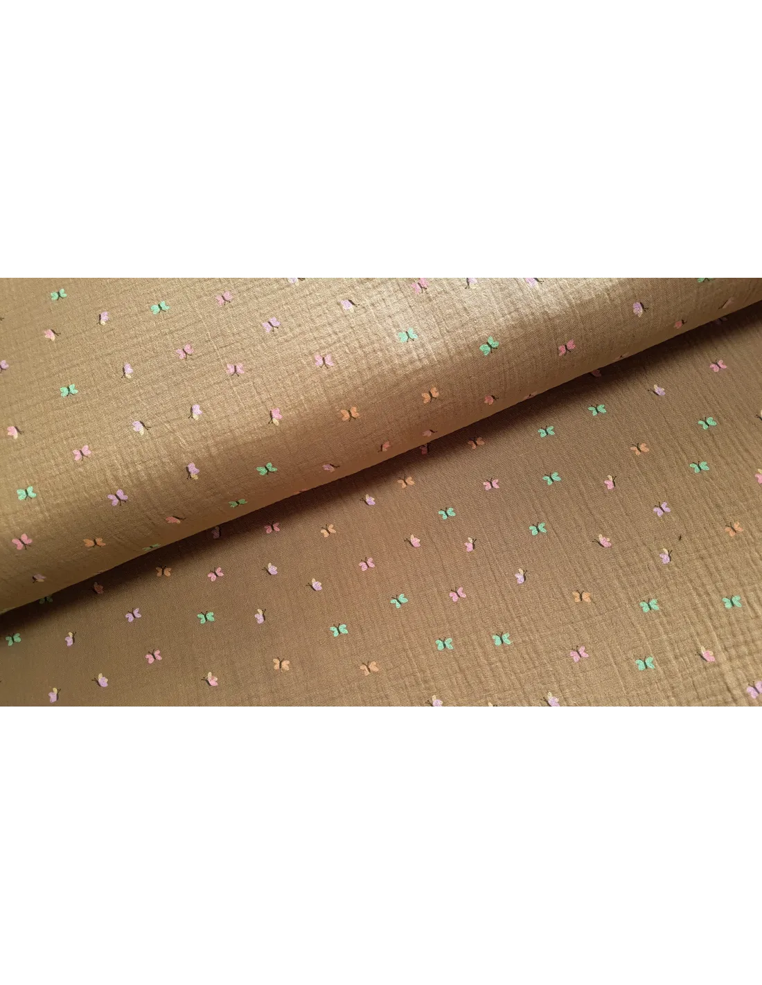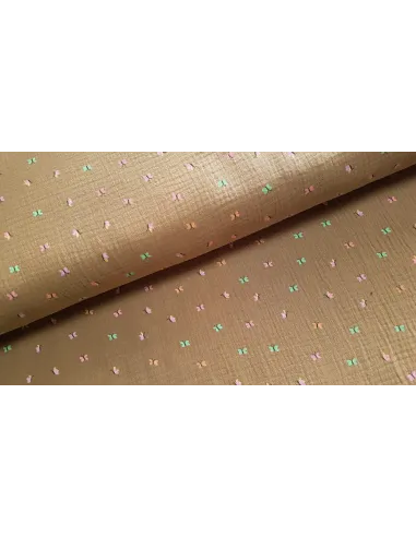 Tissu double gaze aux petits papillons sur fond chamois. Pour la confections de robes, blouses ou encore de coussins et rideaux.