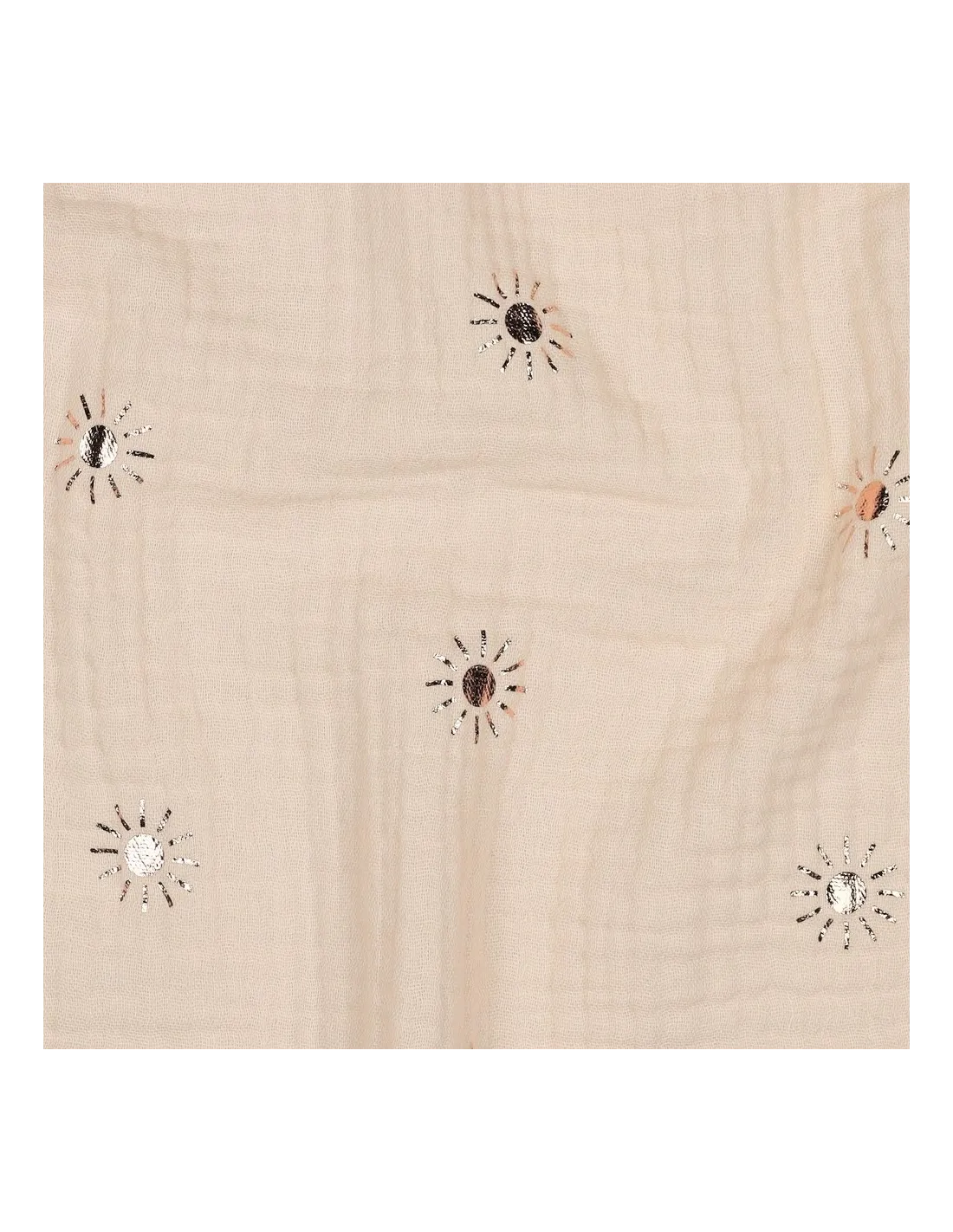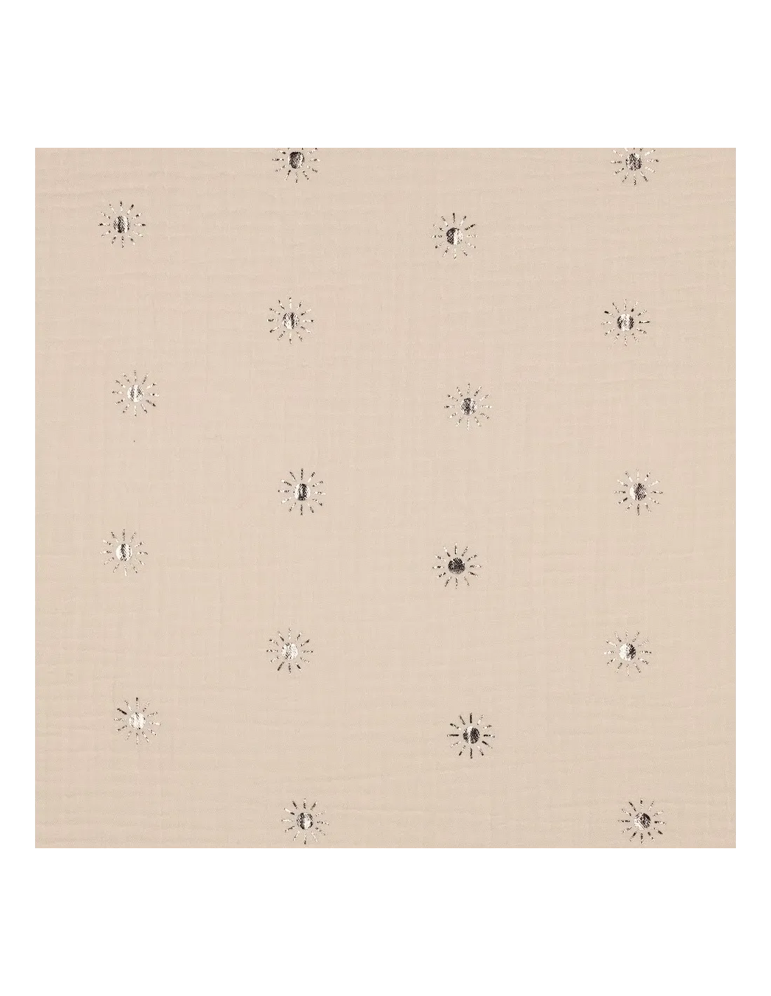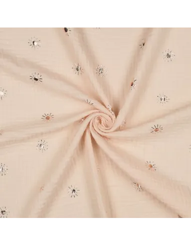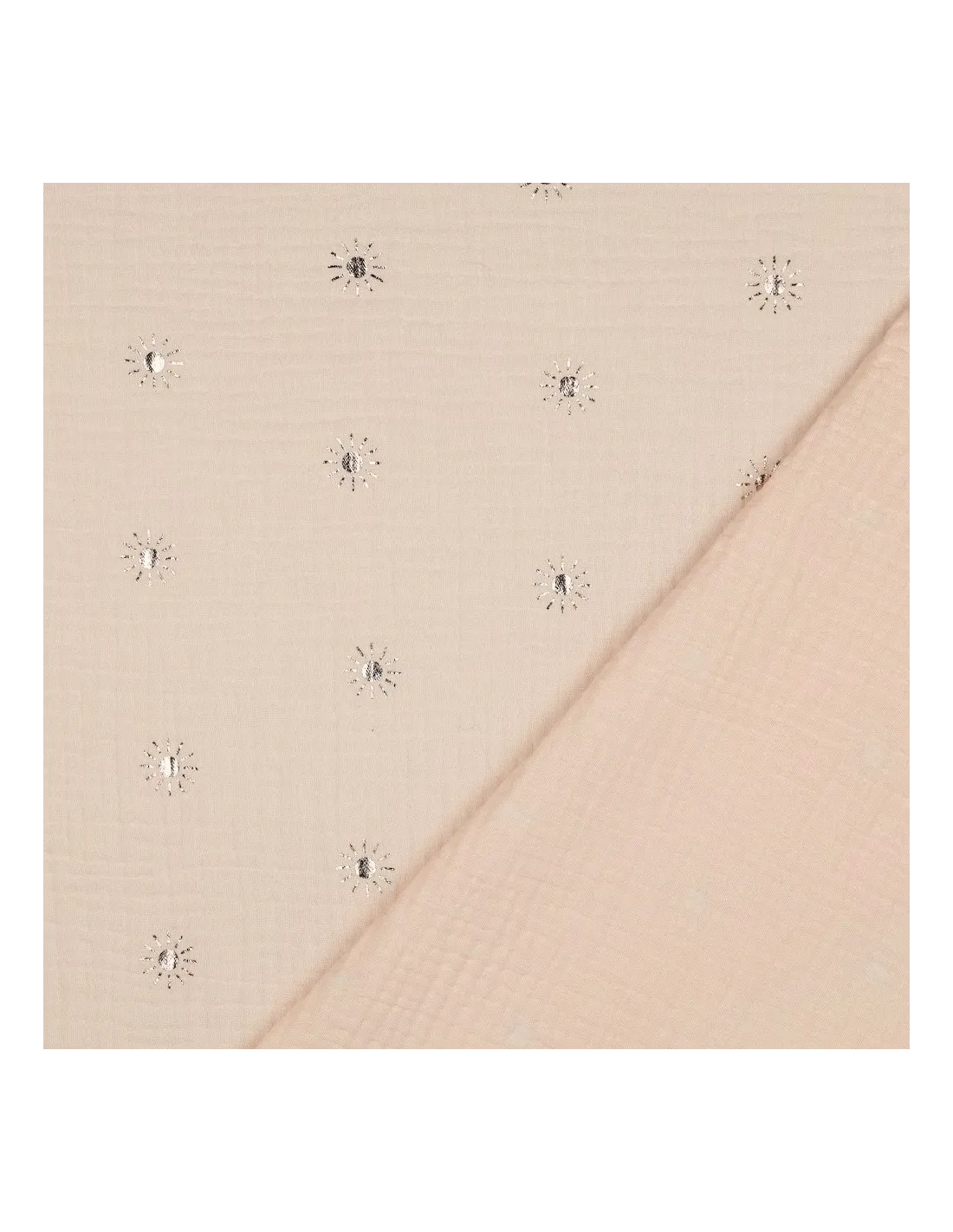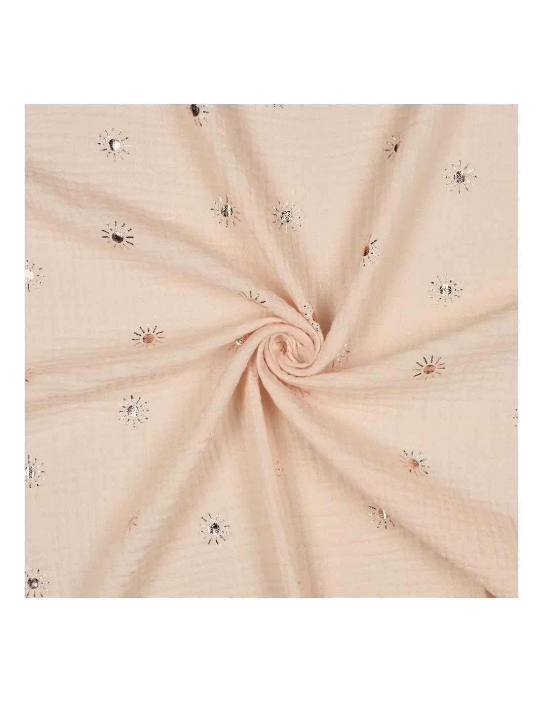 Double gaze coton, soleils lurex sur fond sable rosé. Douce, légère, aérée. Idéale vêtements, accessoires, déco, bébés.