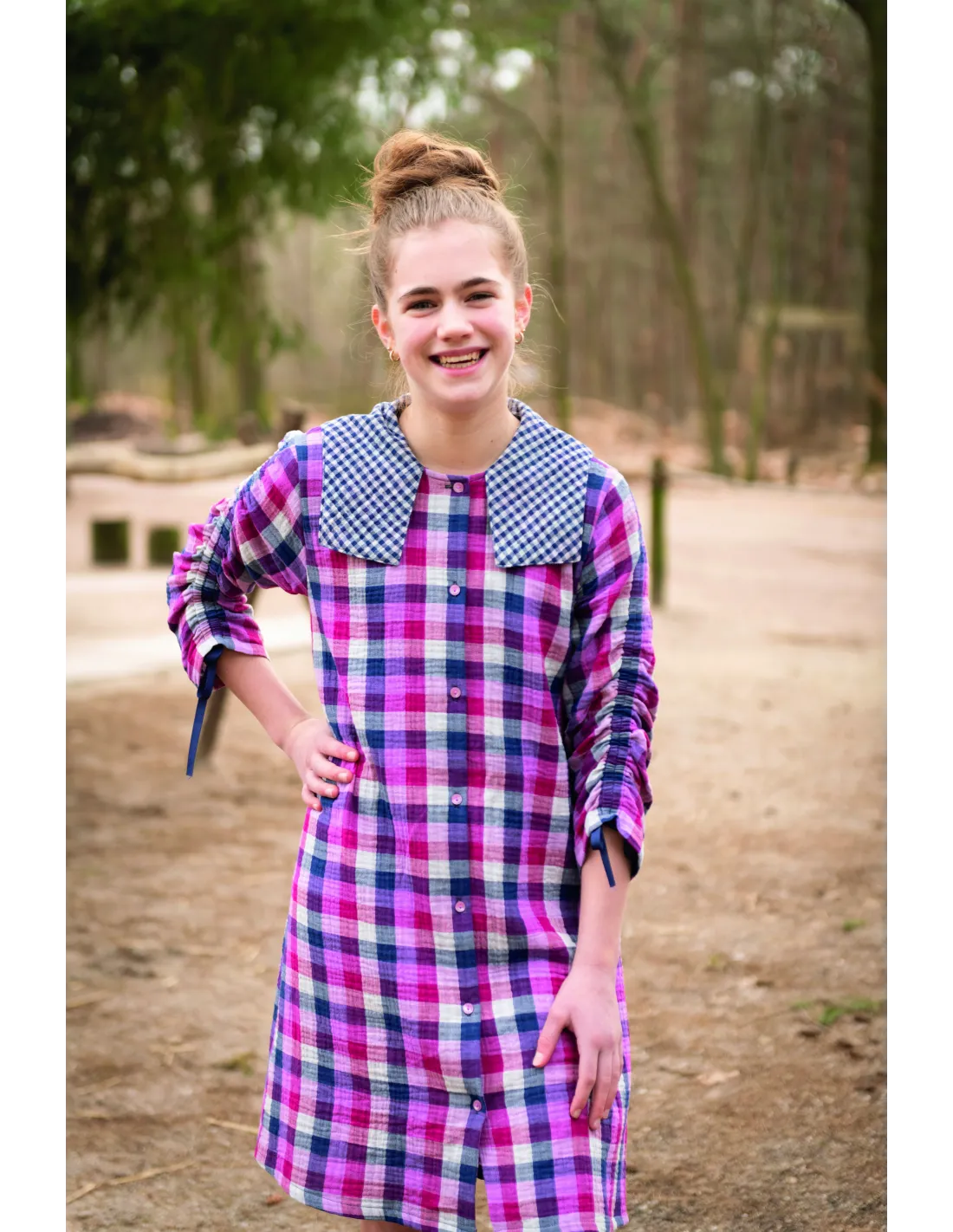 Côté 1 : Un motif Vichy à grands carreaux dans des tons doux et lumineux de rose et de bleu, parfait pour un look audacieux et joyeux.