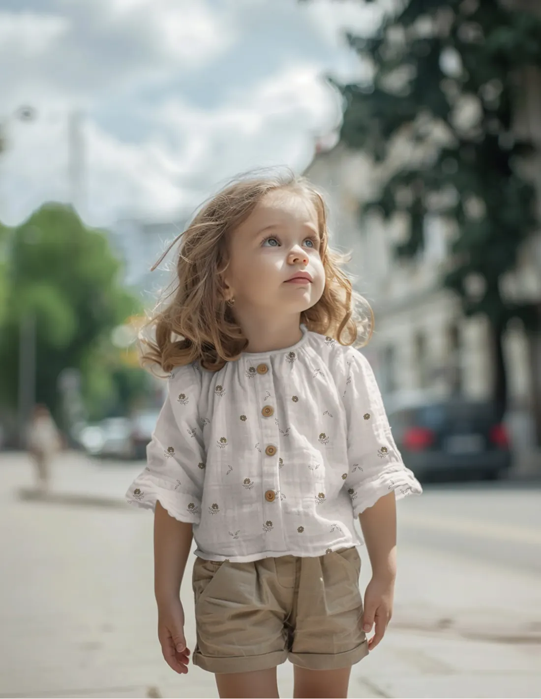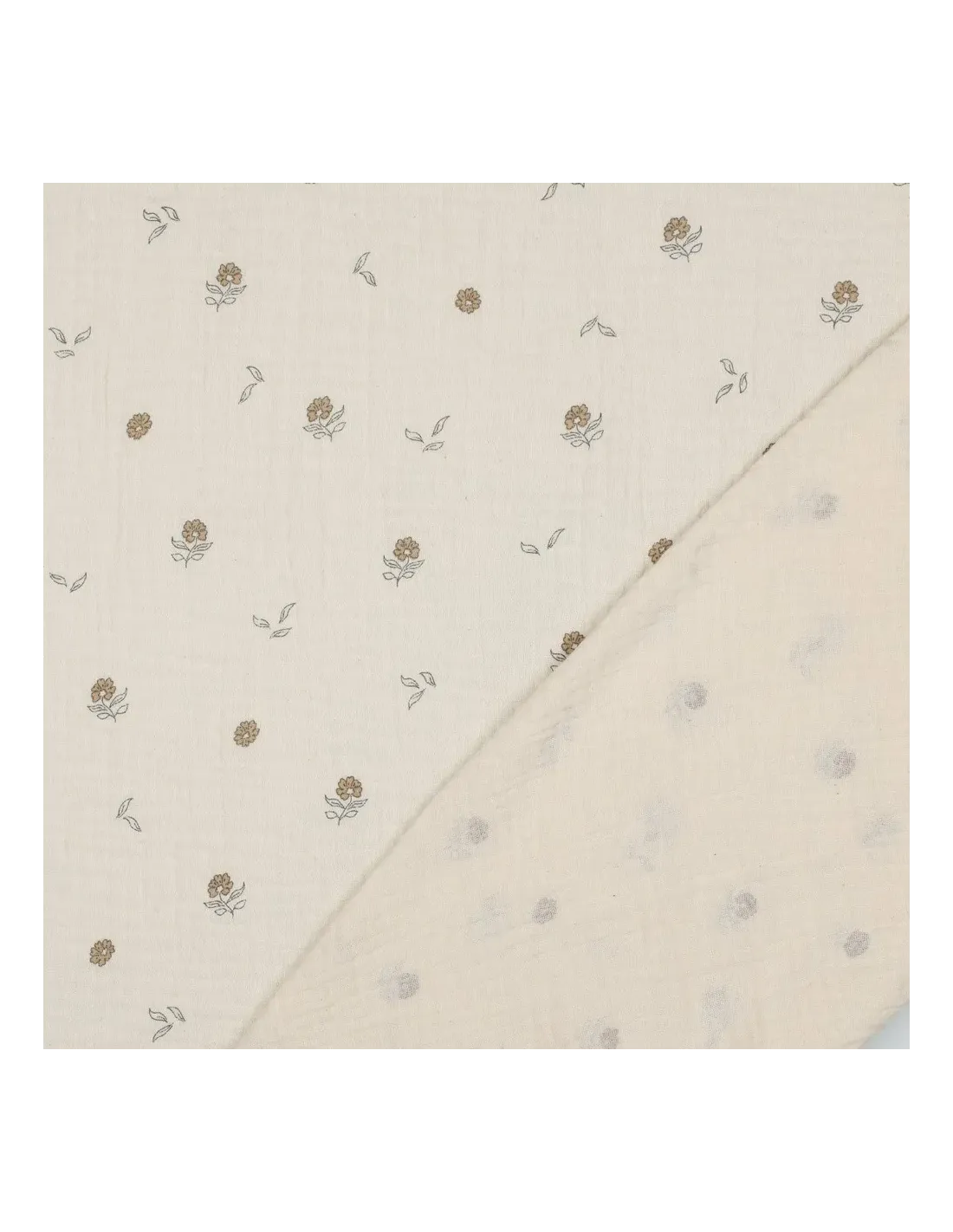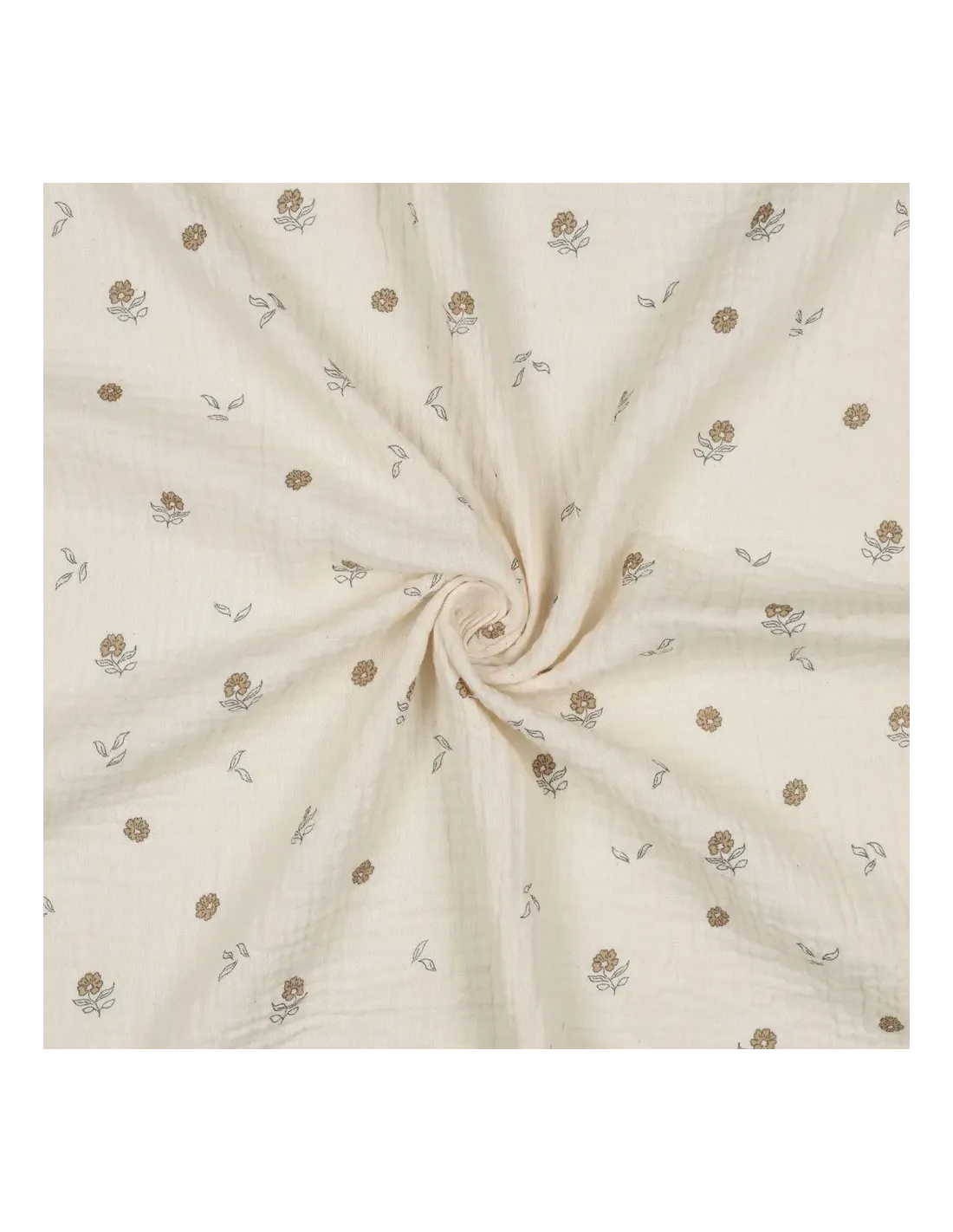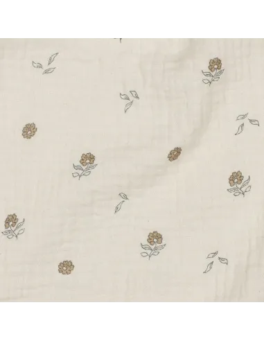 Ce tissu double gaze est une étoffe légère et texturée, caractérisée par deux fines couches de coton et un motif de petites fleurs imprimées, idéal pour la confection de vêtements amples et légers, d'articles de puériculture (grâce à ses certifications), et d'accessoires.