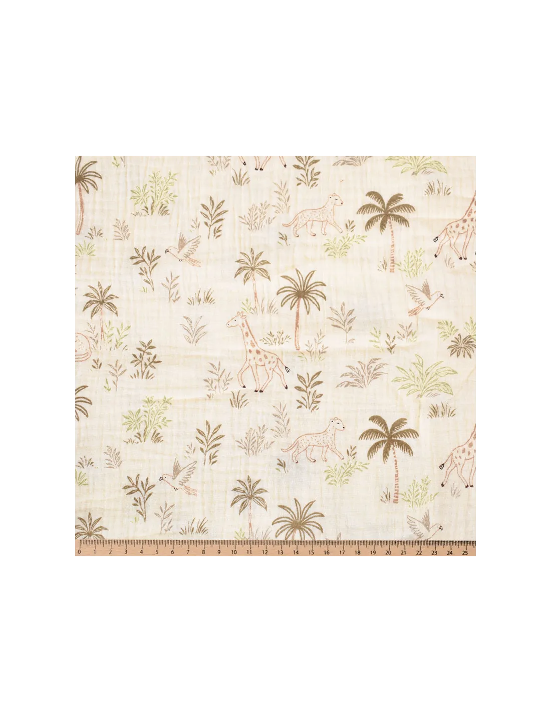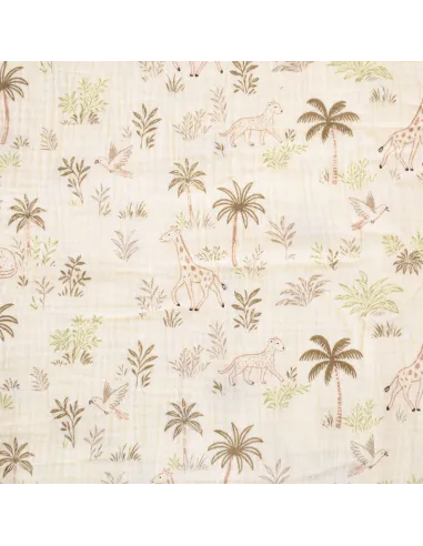 Éveillez l'imagination des petits aventuriers avec cette magnifique double gaze de coton aux motifs de la savane. Entre girafes élégantes, guépards agiles et palmiers tropicaux, ce tissu transporte instantanément vos créations dans un univers sauvage et poétique, tout en offrant une douceur absolue.