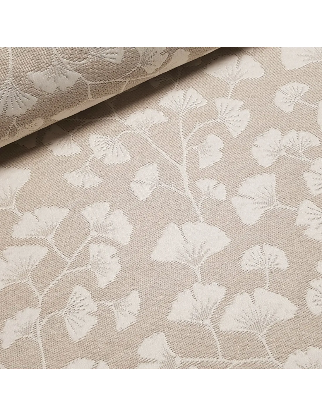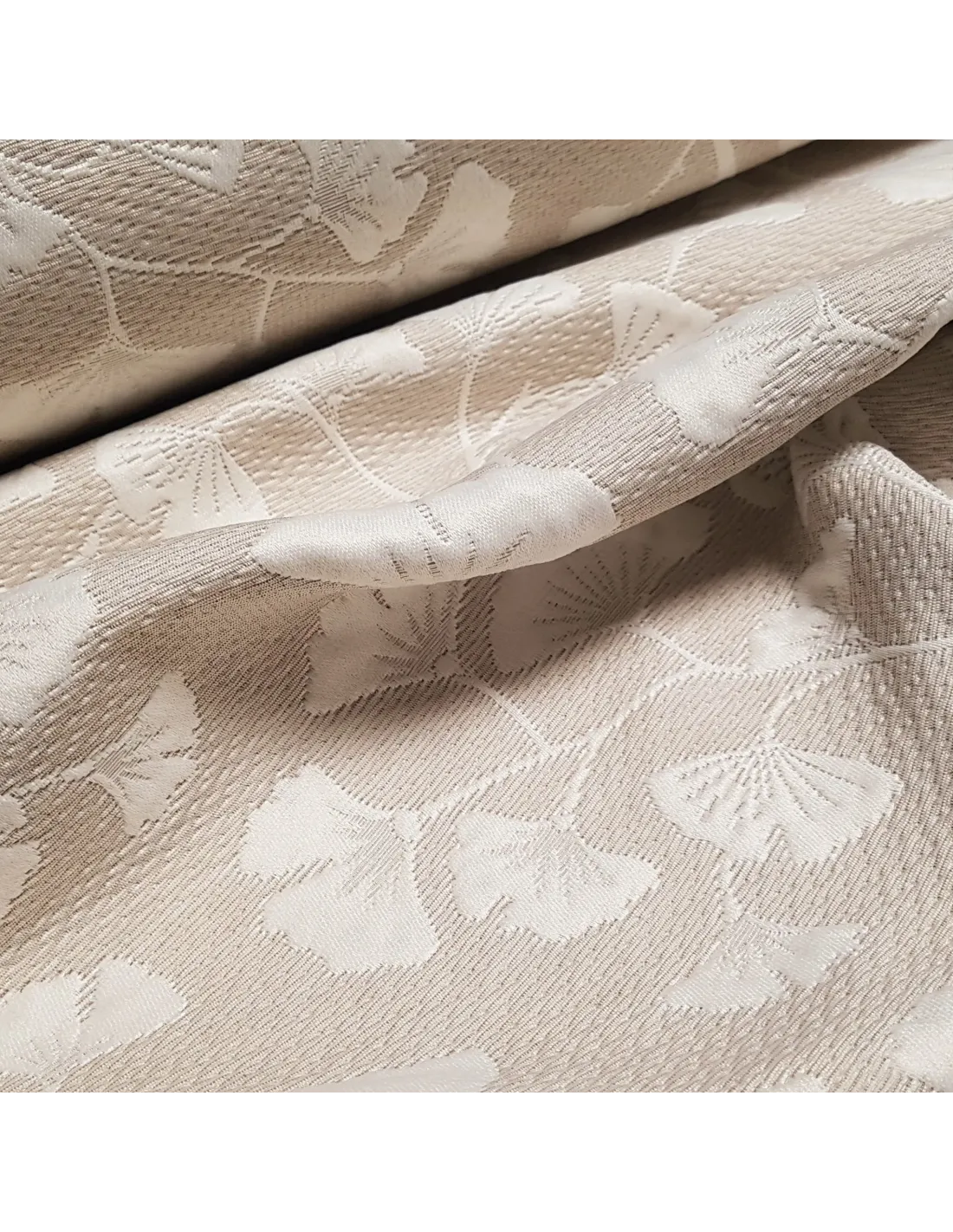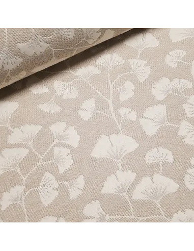 Jacquard piqué feuilles de gingko blanches sur fond lin.