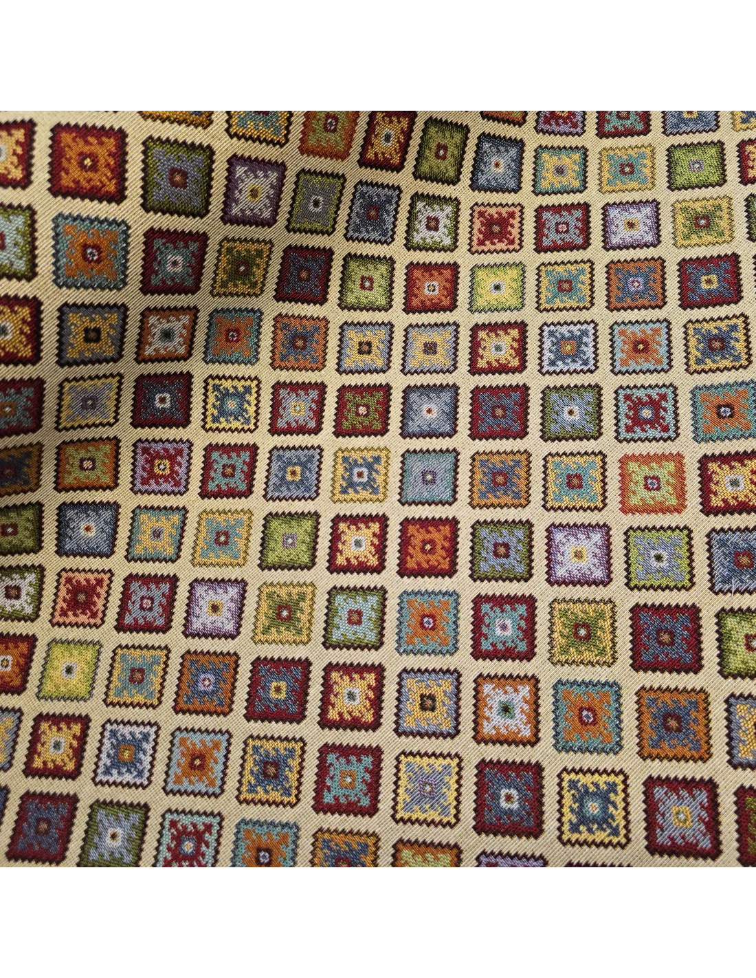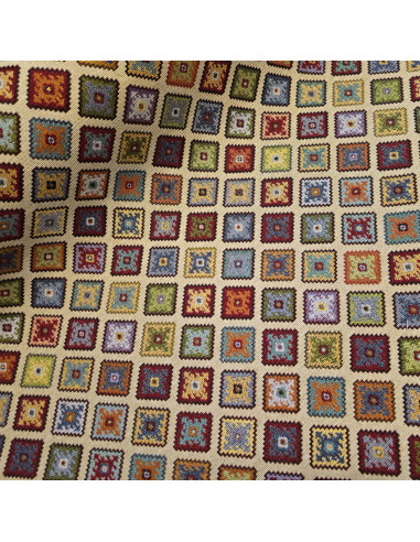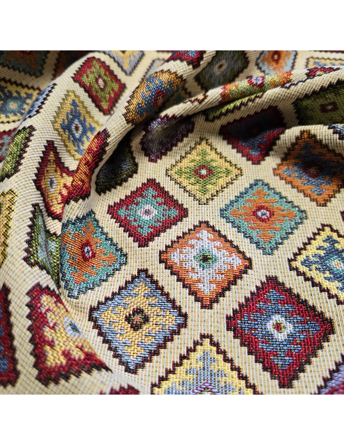 Jacquard épais, résistant, motifs géométriques. Idéal rideaux, sacs, coussins. Durable et polyvalent.
