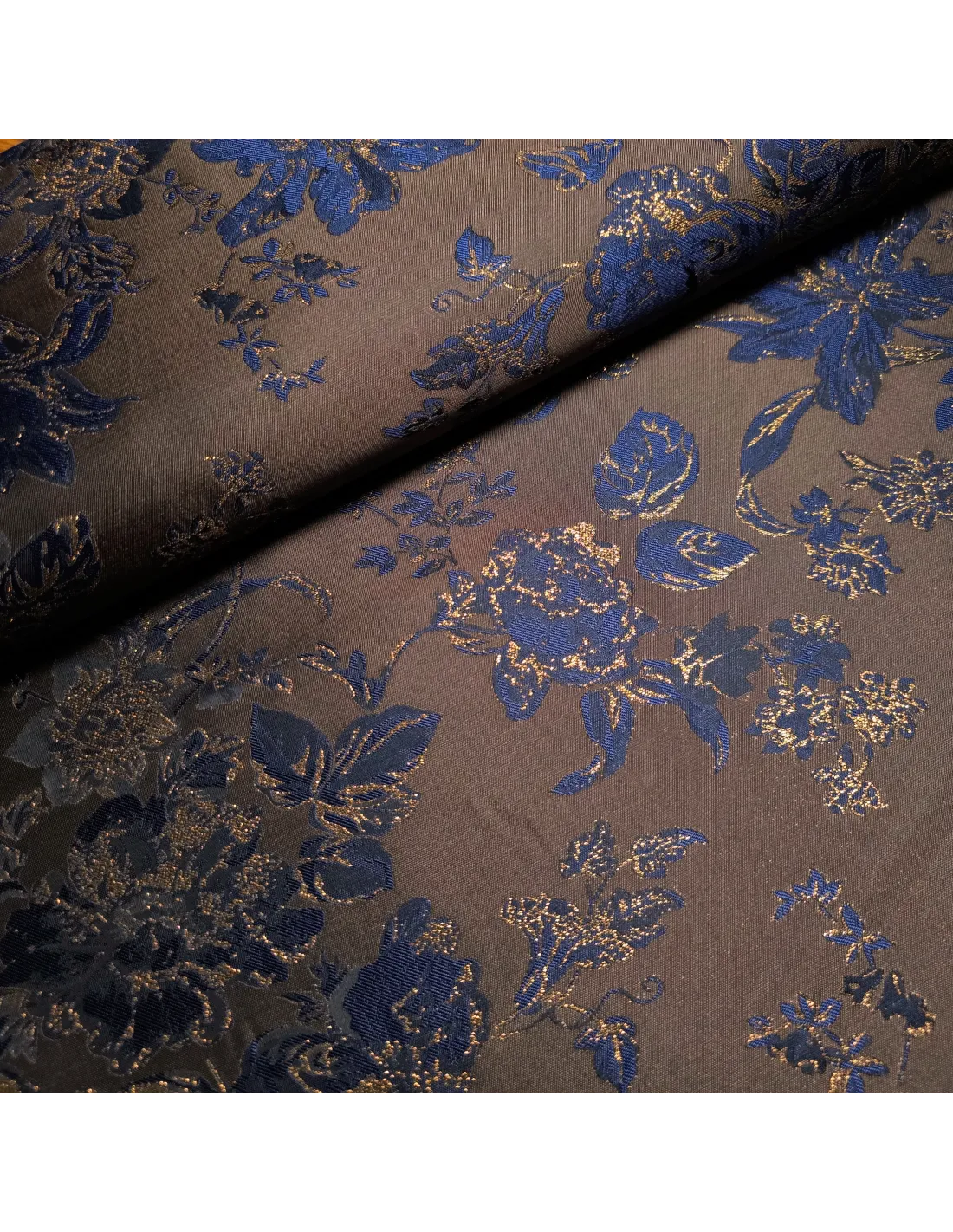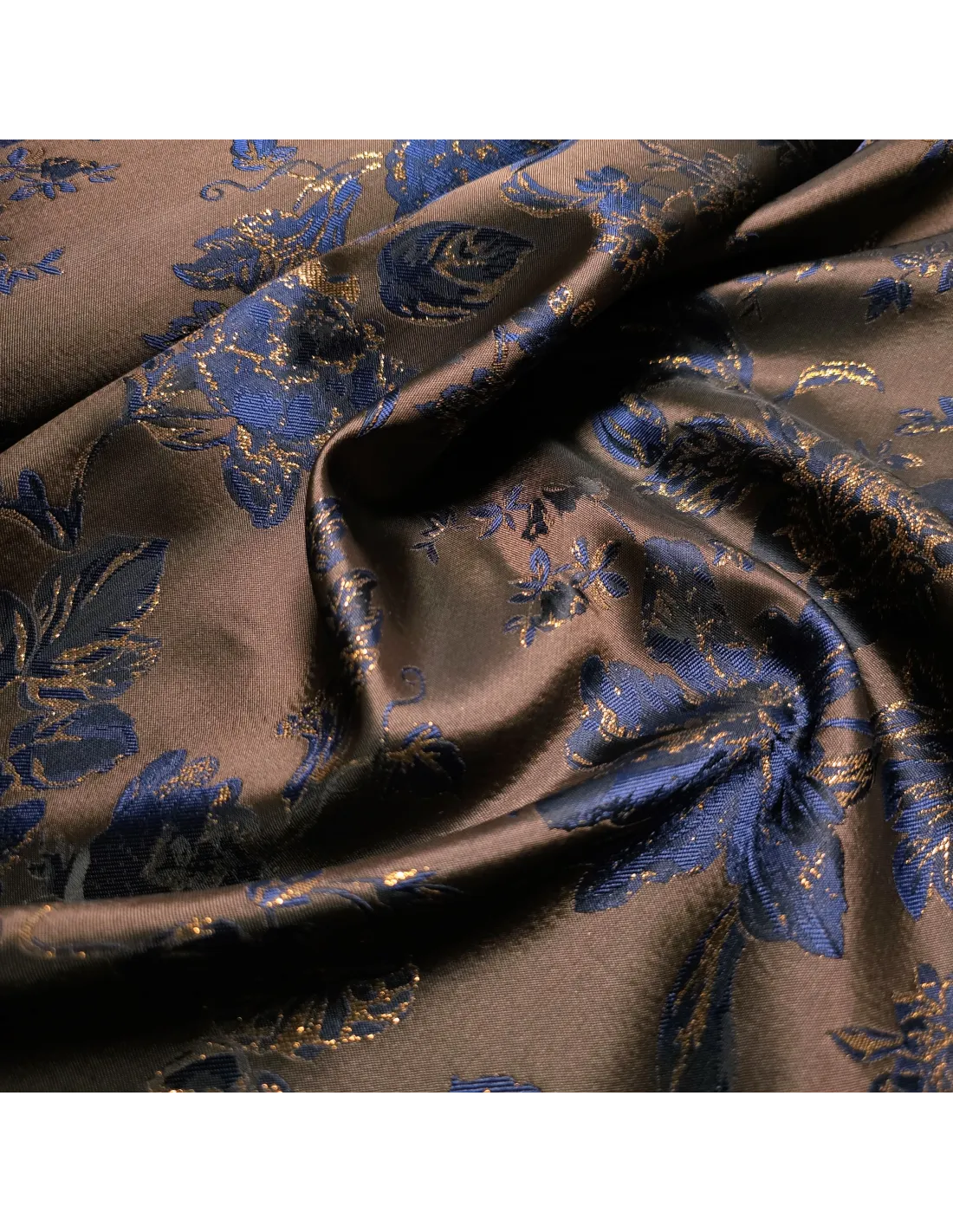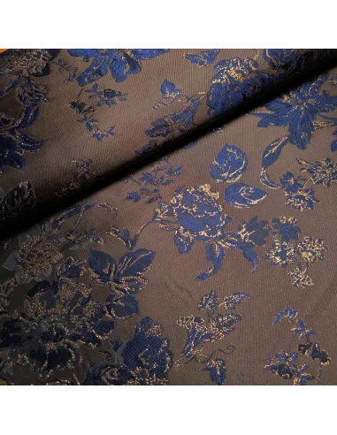 Magnifique jacquard synthétique aux fils cuivrés et bleus nuit.