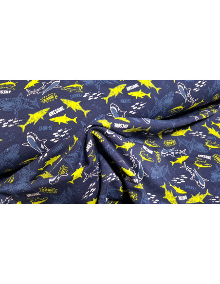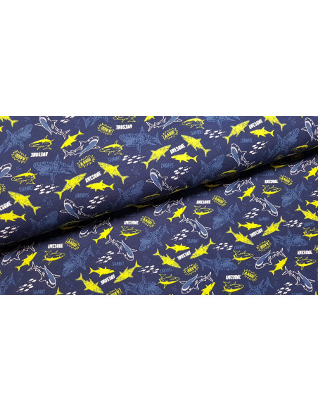 Beau tissu jersey de coton enfants à imprimés requins sur fond bleu marine Awesome Shark