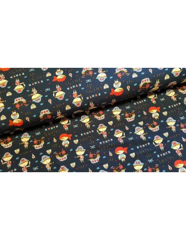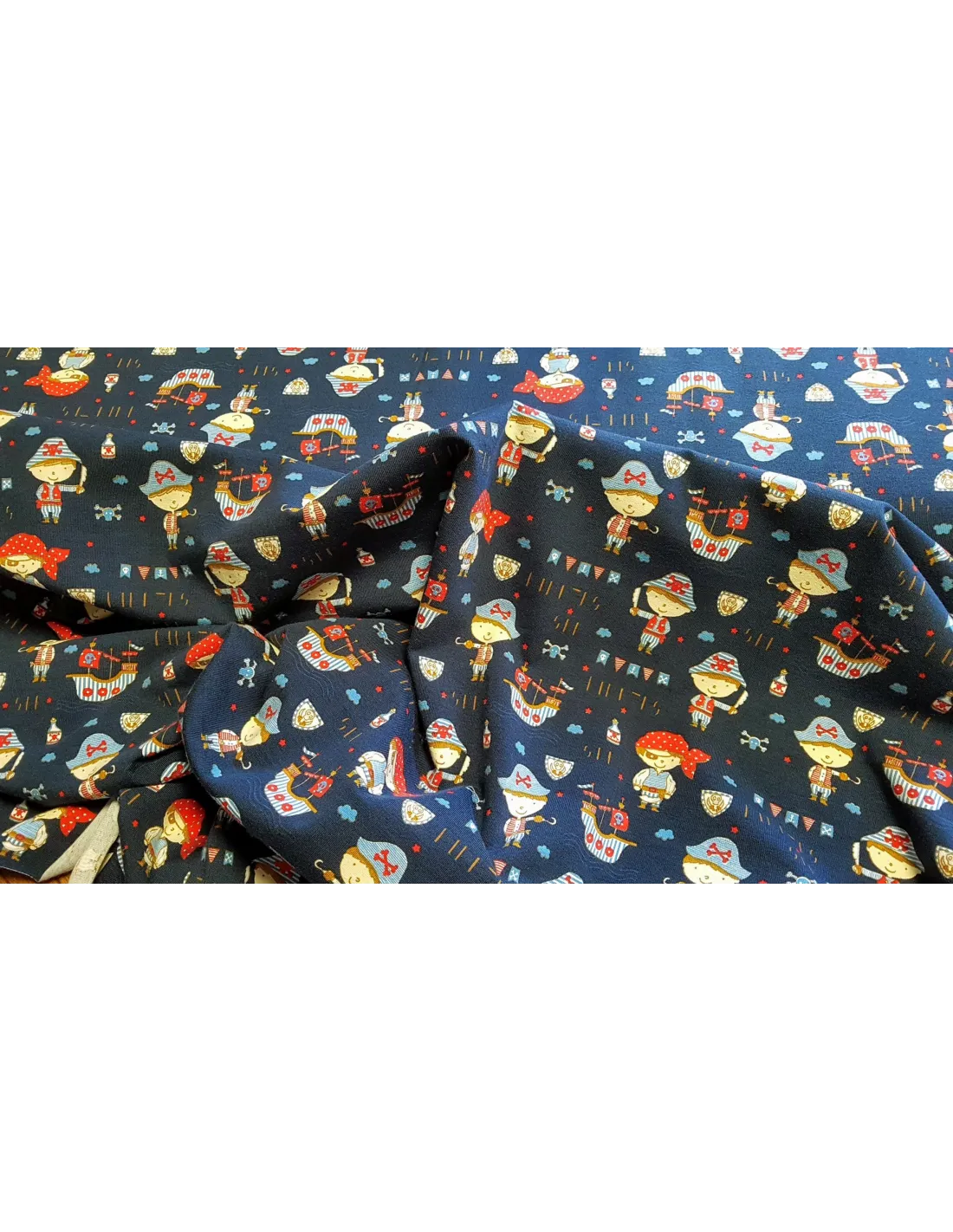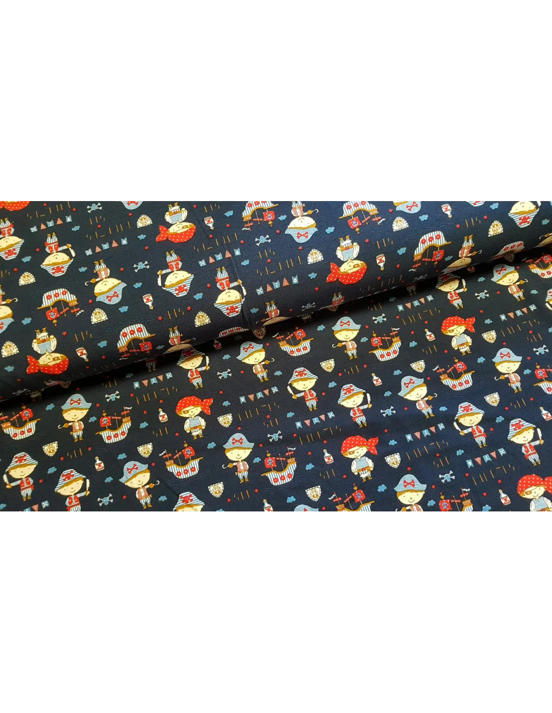 Beau tissus jersey coton enfants à imprimés pirates sur fond bleu marine
