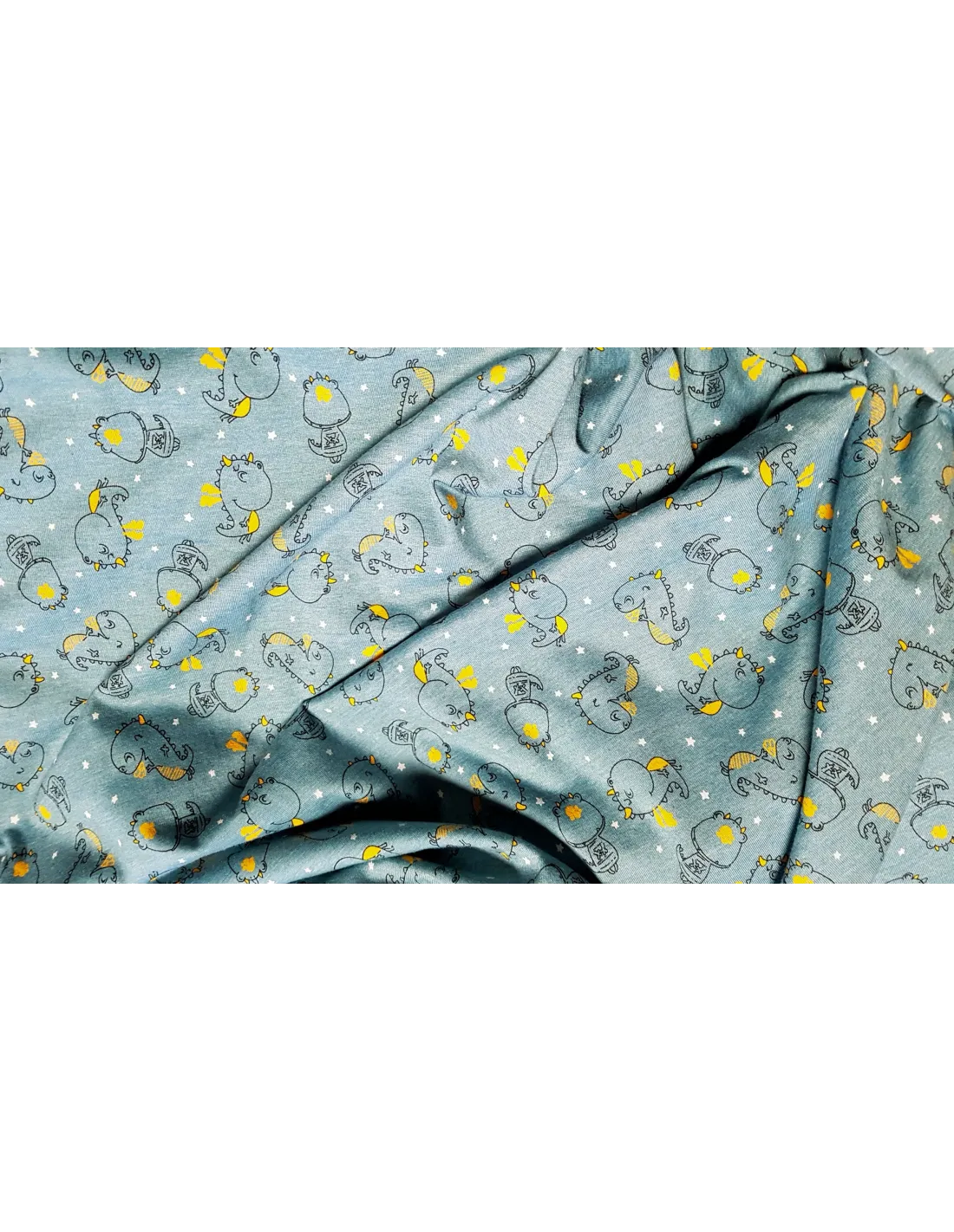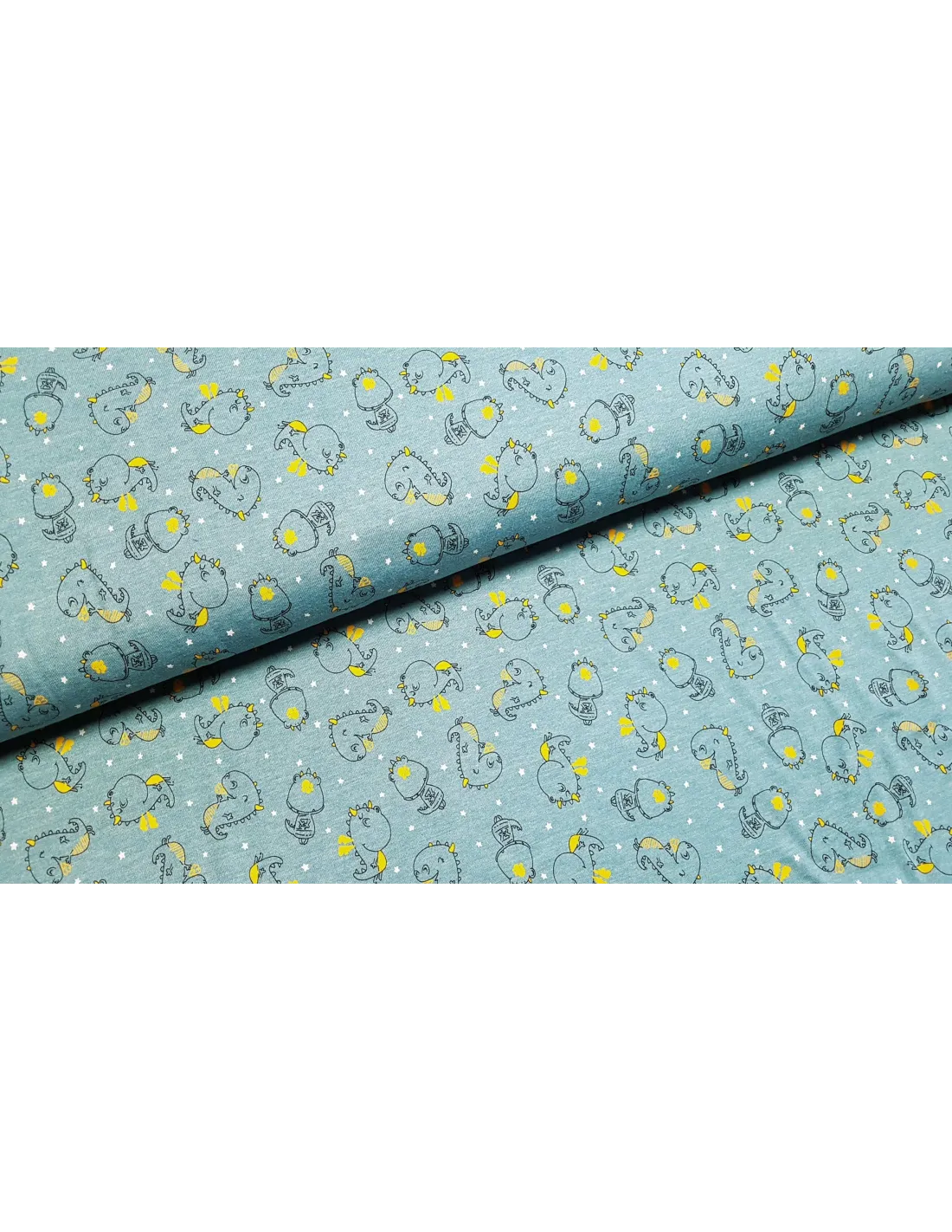 Beau tissus jersey coton enfants à imprimés dinosaures sur fond bleu gris-bleu chiné.