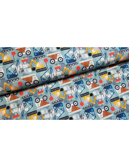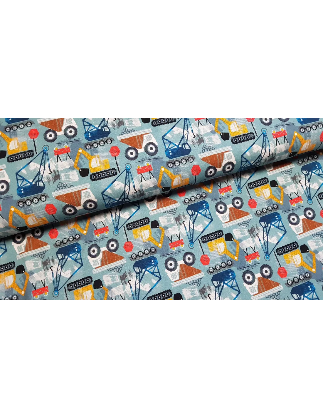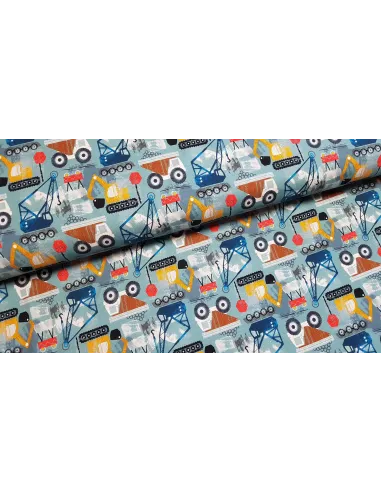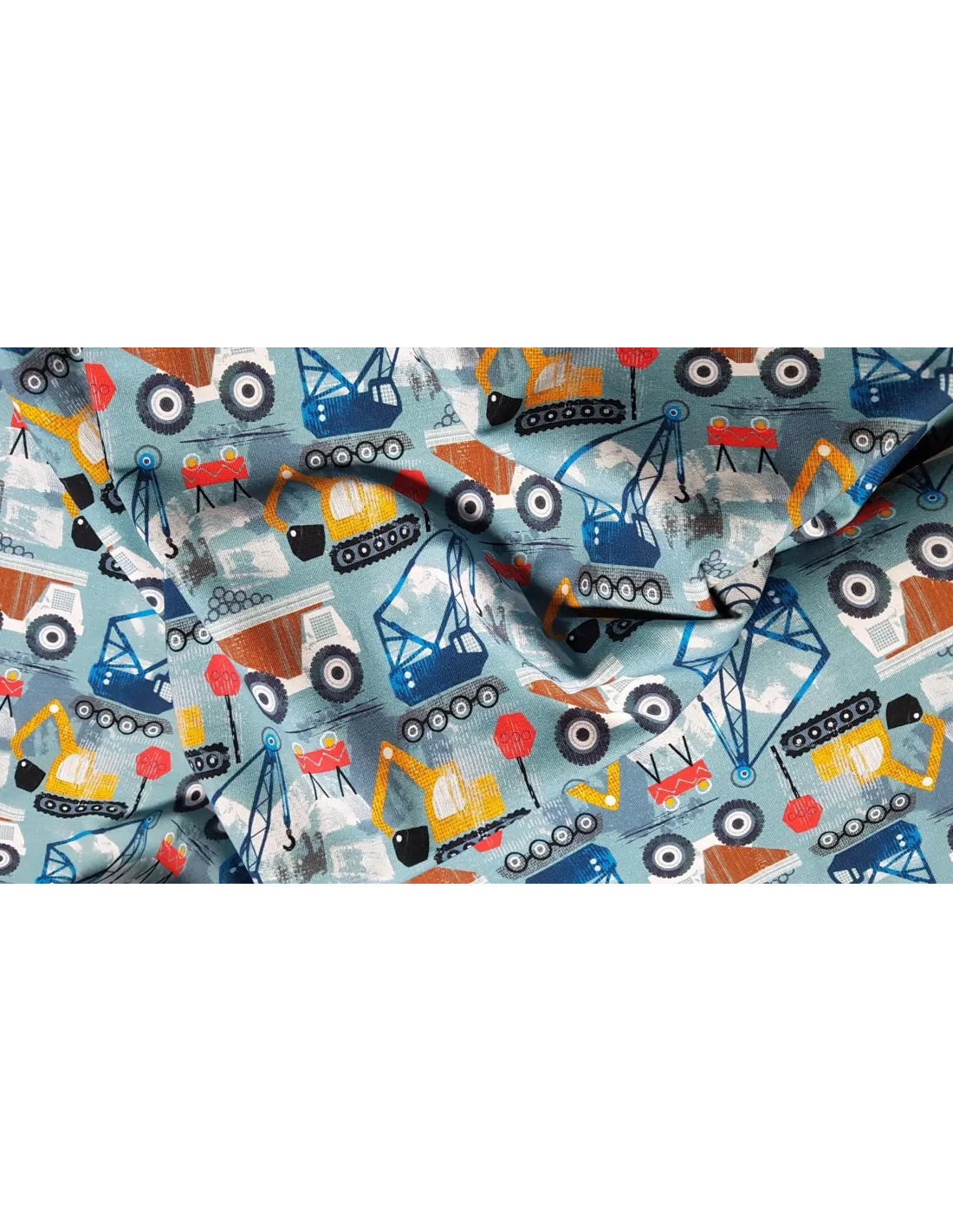 Beau tissus jersey coton enfants à impression digitale véhicules sur fond bleu ciel.