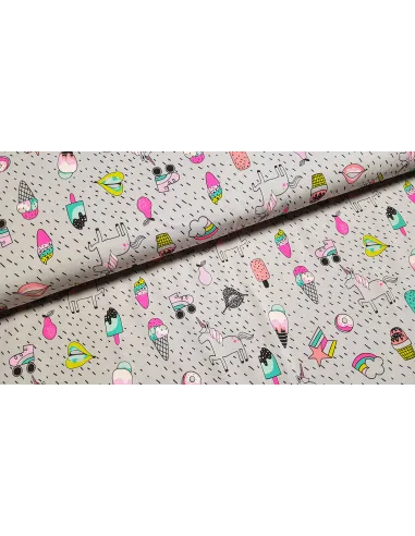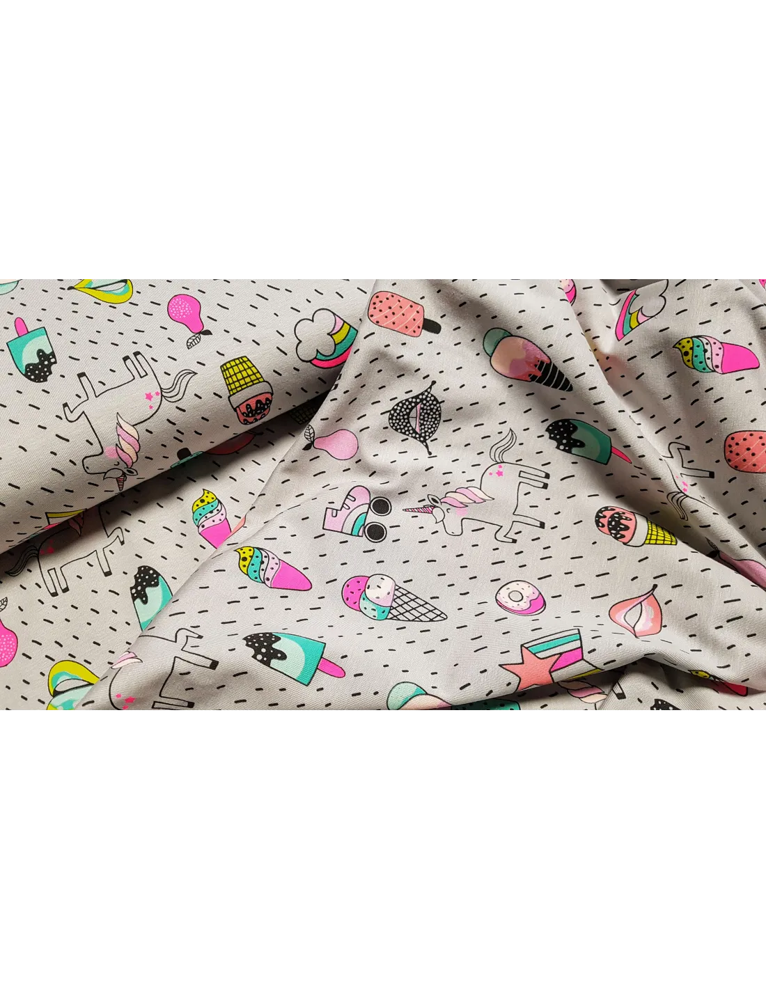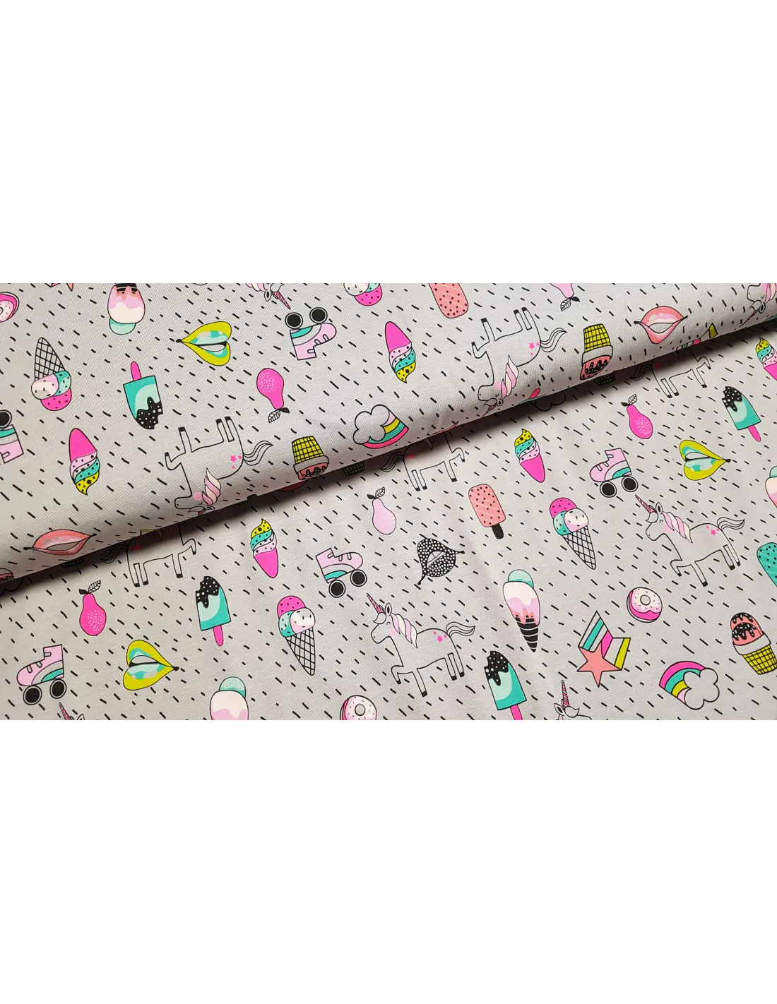 Jersey de coton imprimé licornes funs et fluos sur fond bleu gris.