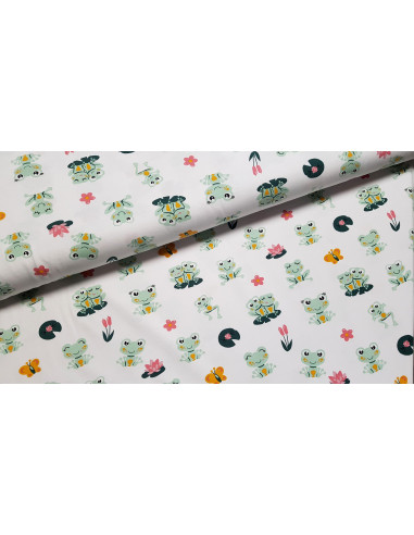 Jersey de coton à imprimés petites grenouilles sur fond blanc