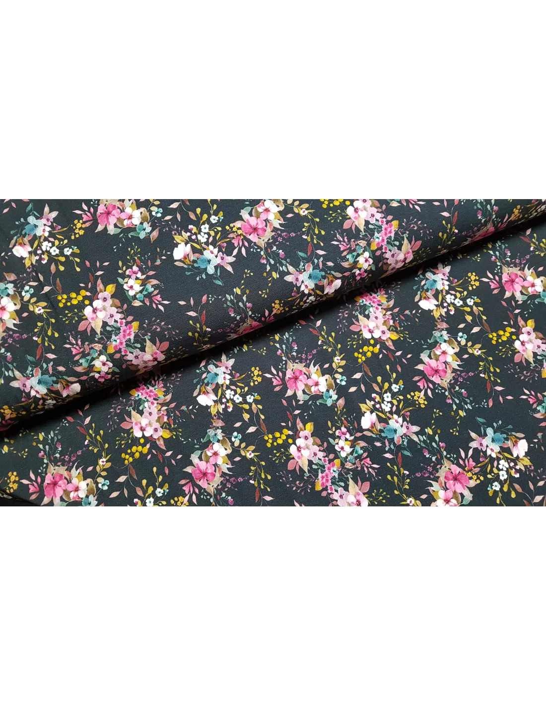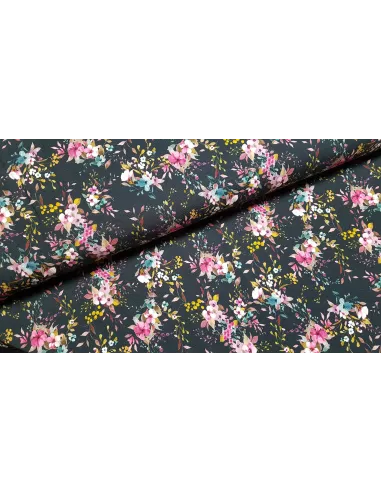 Jersey de coton impression digitale fleurs sur fond marine. Superbe pour faire un t-shirt, une robe ou tout ce qui vous plaira !