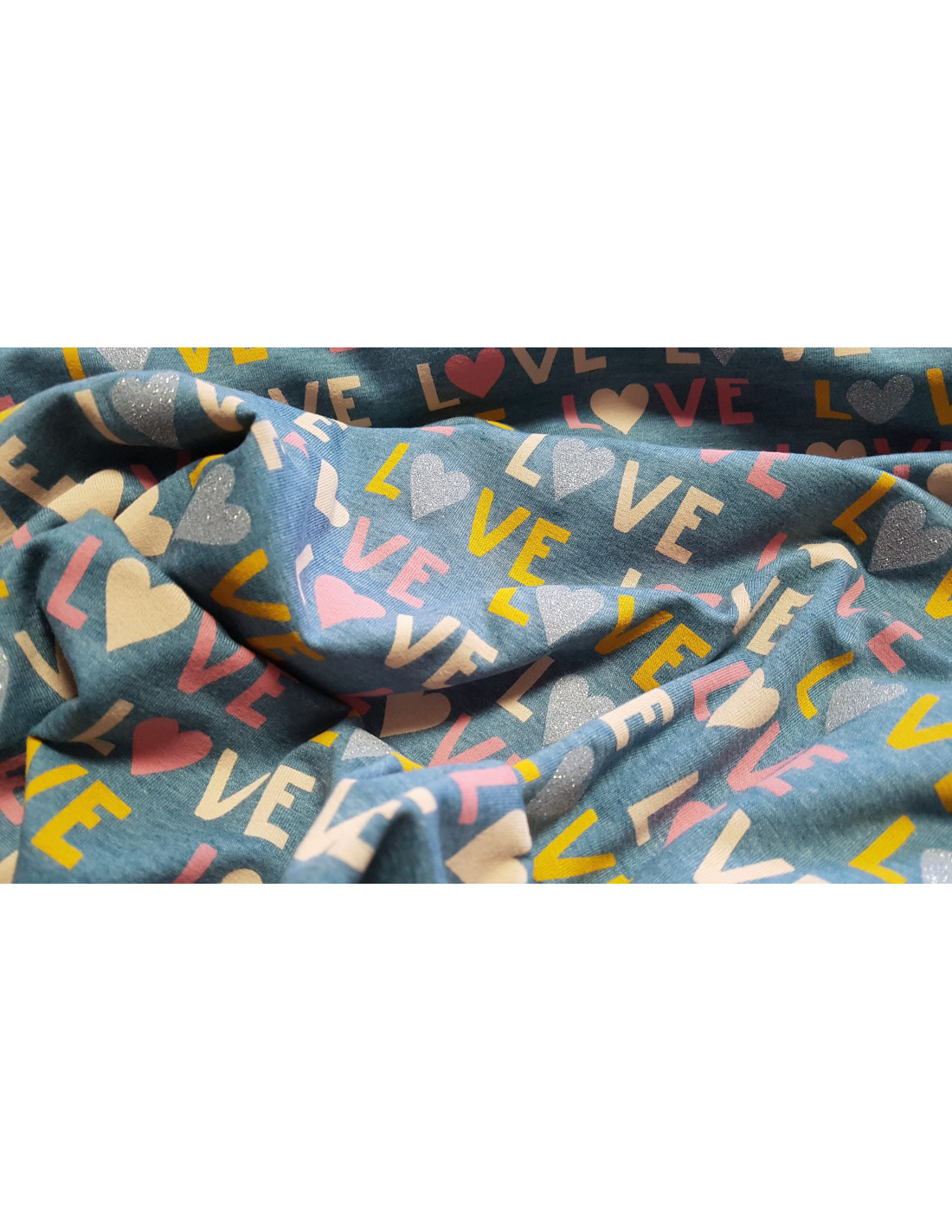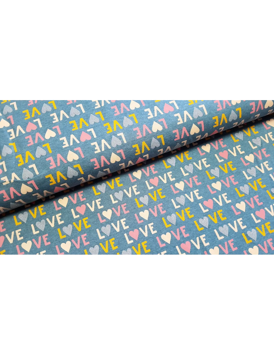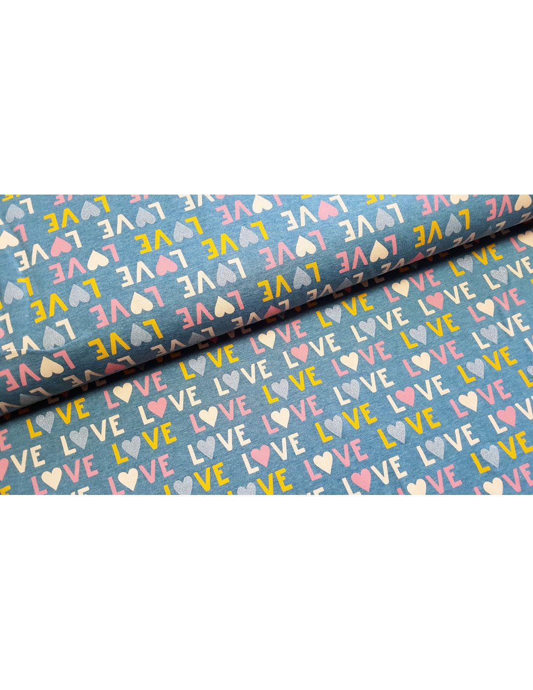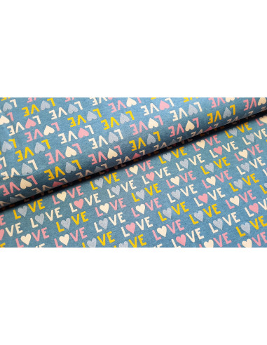 Jersey de coton impression "LOVE" sur fond bleu jeans. Superbe pour faire un t-shirt, une robe ou tout ce qui vous plaira !