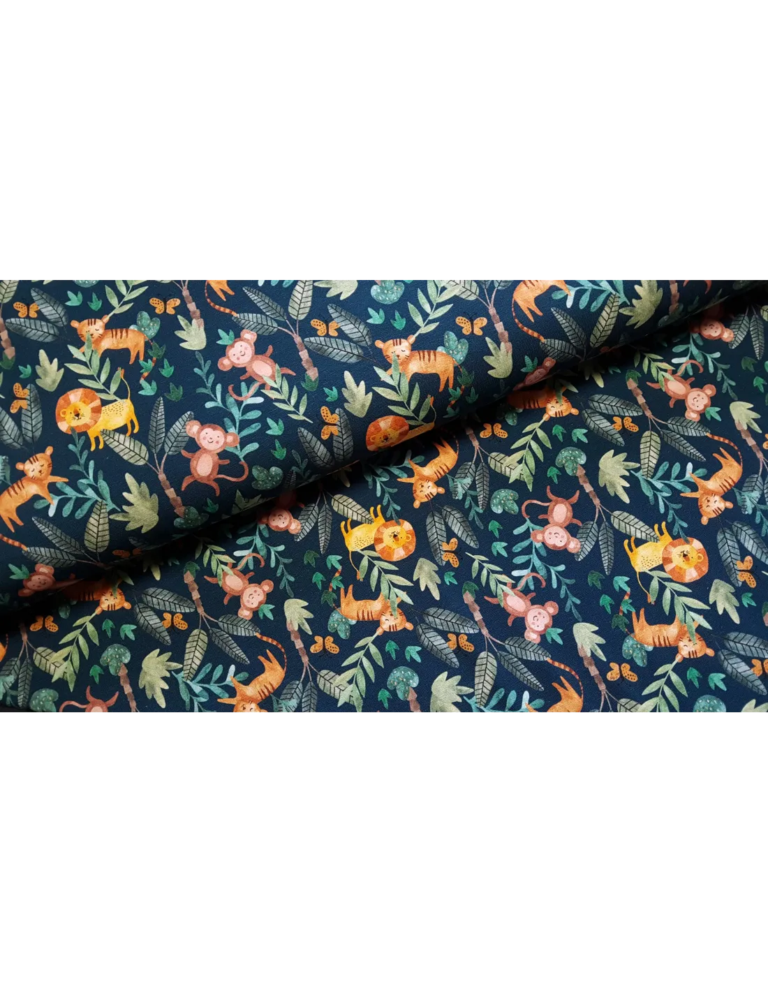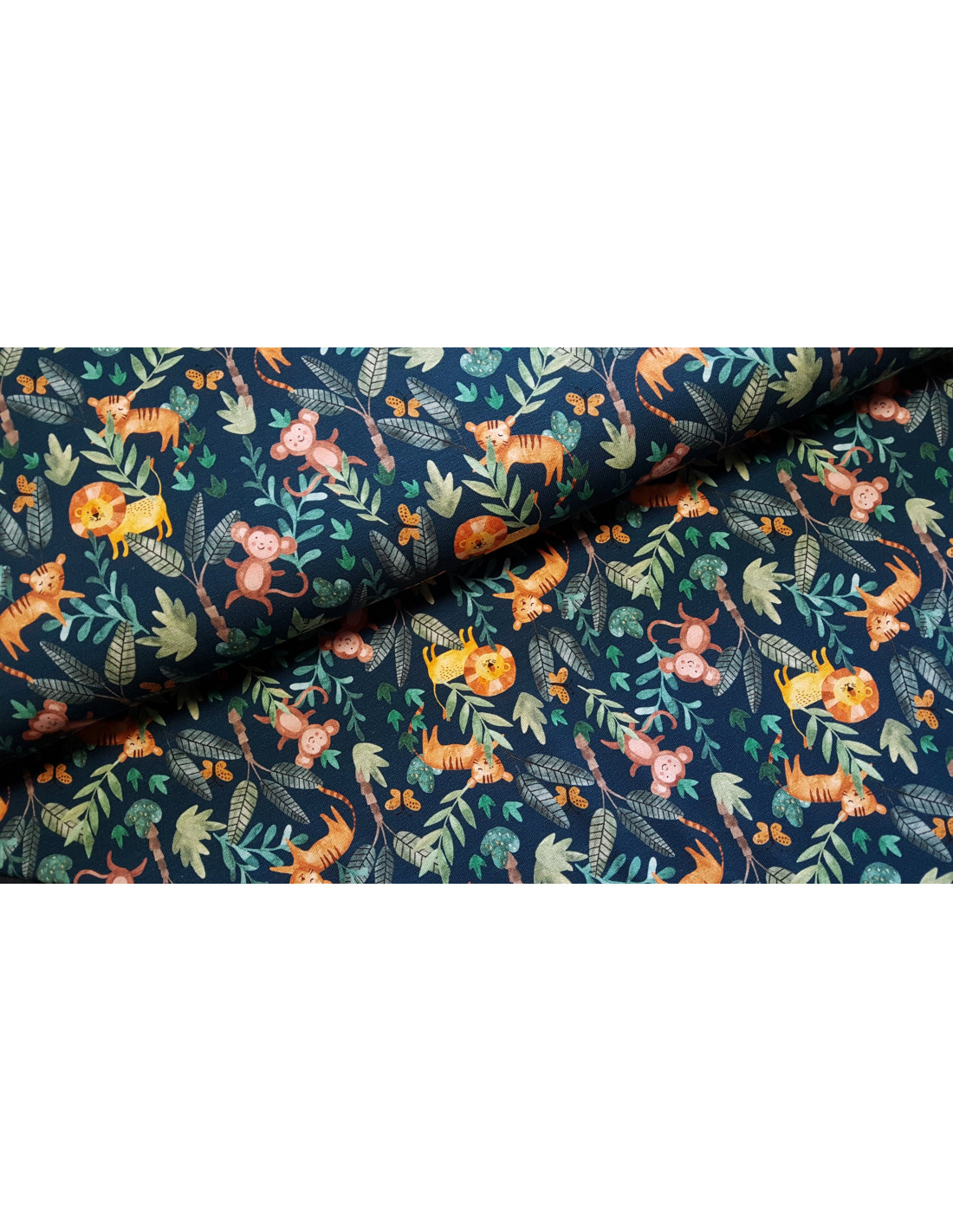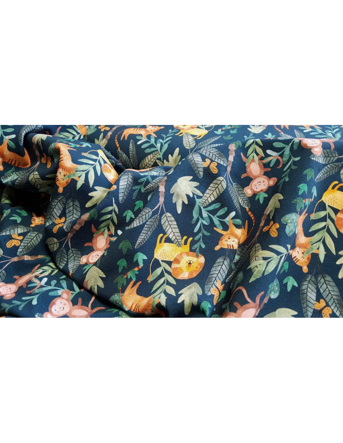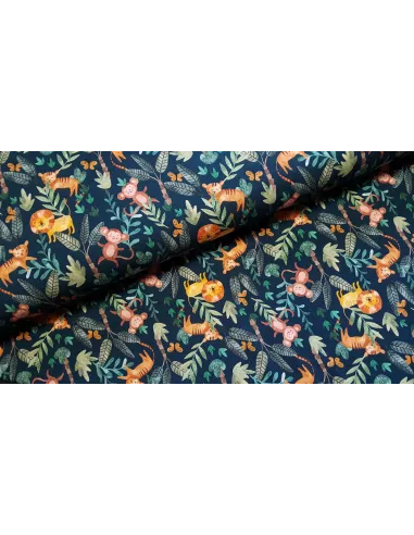 Jersey de coton impression animaux de la jungle sur fond bleu pétrole. Superbe pour faire un t-shirt, une robe ou tout ce qui vous plaira !
