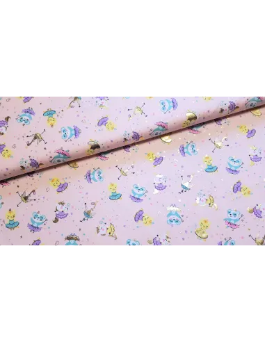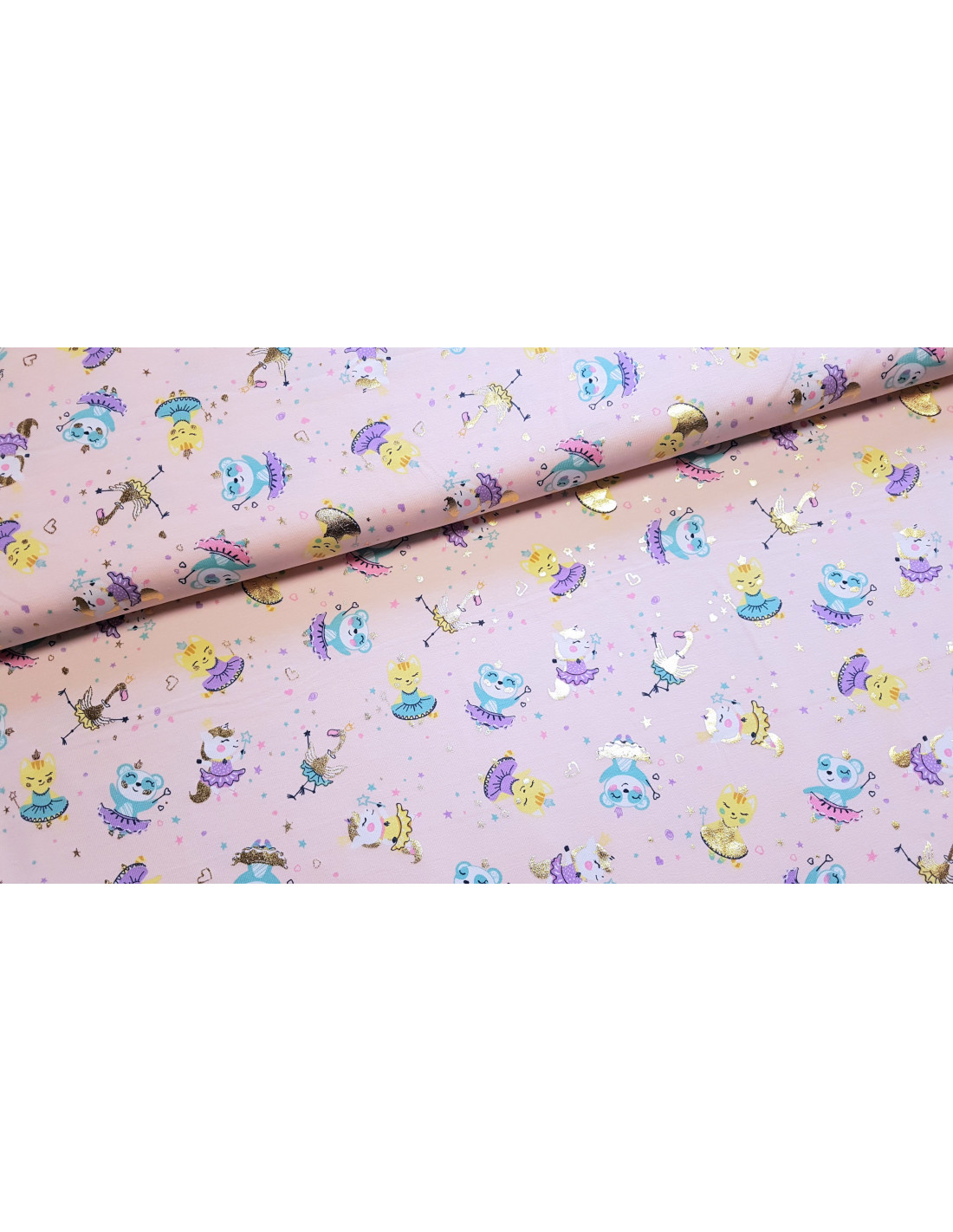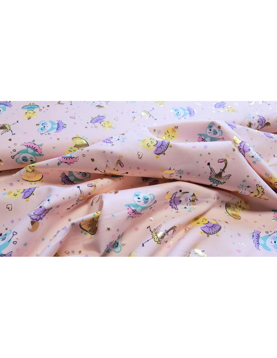Jersey de coton imprimé motifs dancing party et lurex fond rose. Superbe pour faire un t-shirt, une robe ou tout ce qui vous plaira !