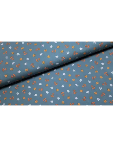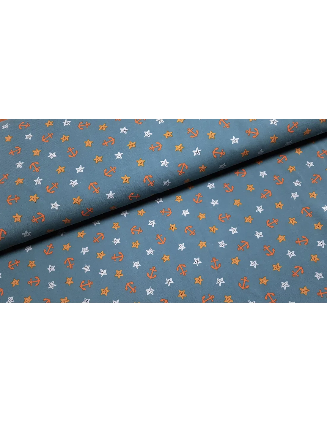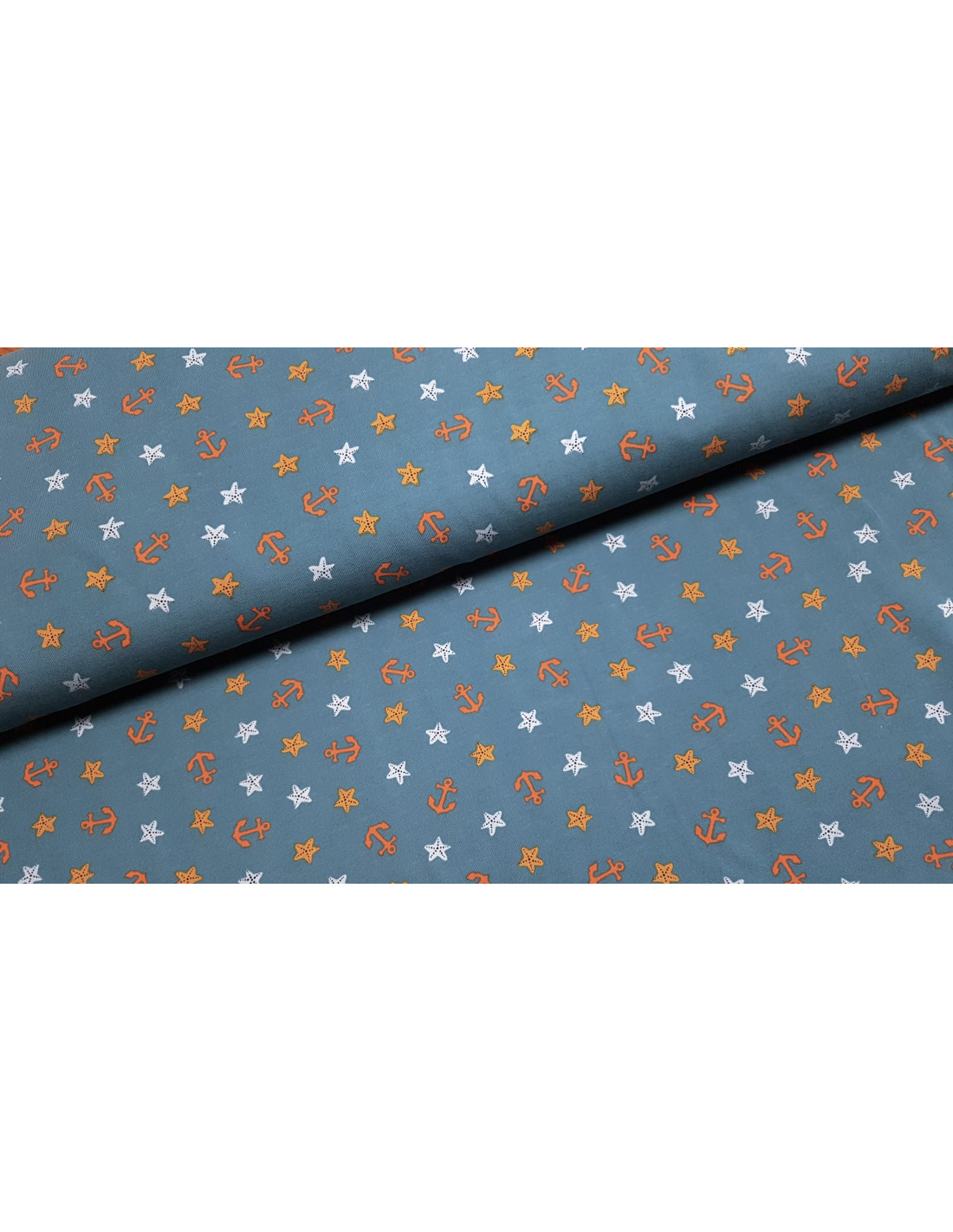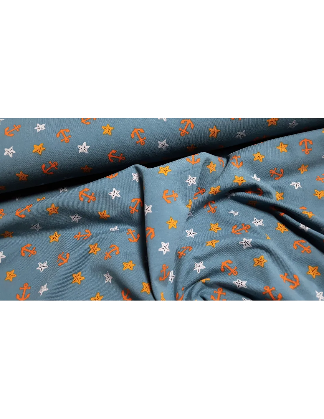Jersey de coton impression ancres et étoiles de mer sur fond bleu jeans. Superbe pour faire un t-shirt, une robe ou tout ce qui vous plaira !
