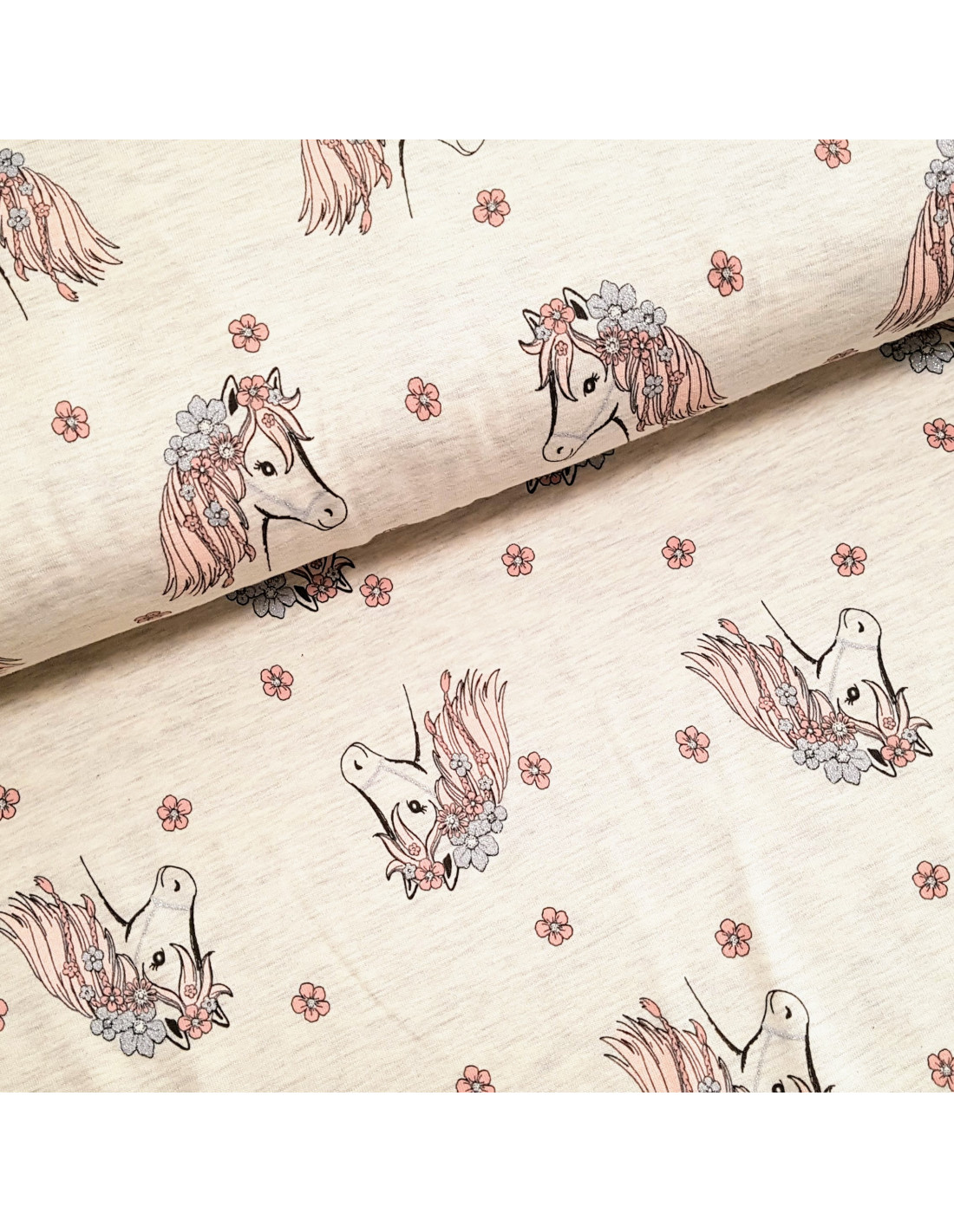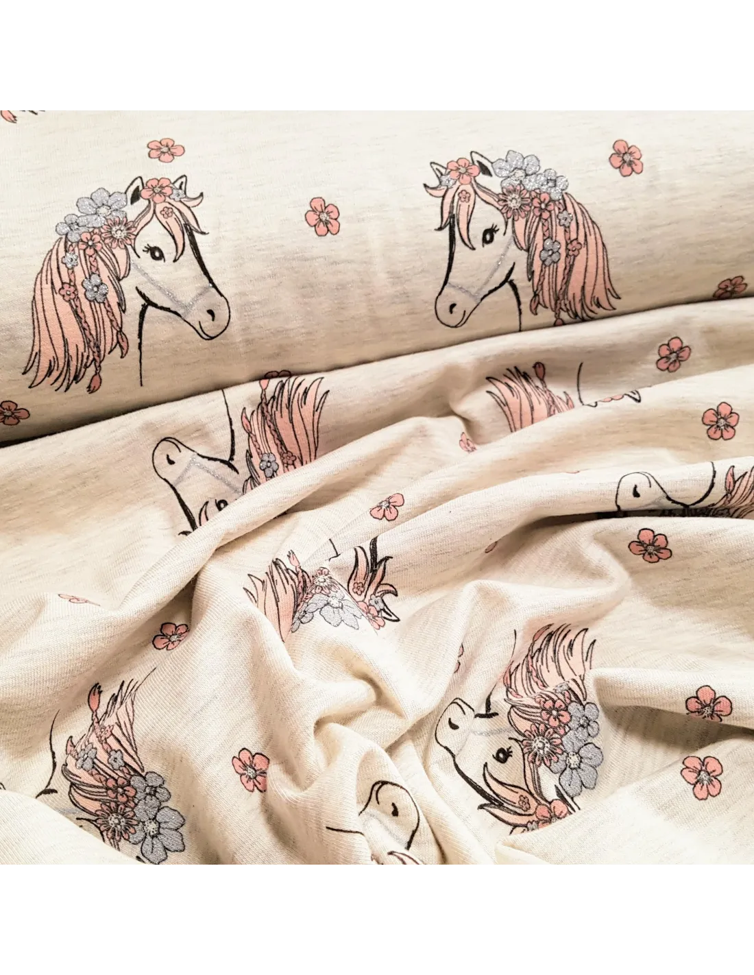 Jersey de coton aux chevaux ornés de fleurs avec lurex argenté sur fond beige clair. Superbe pour faire un t-shirt, une robe ou tout ce qui vous plaira !