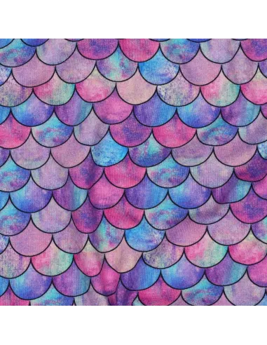 Laissez-vous charmer par la magie des profondeurs avec ce jersey de coton doux et extensible. Son motif, réalisé par impression digitale, est une explosion de couleurs, avec des écailles stylisées qui scintillent dans des teintes de violet, de bleu et de rose. Ce design envoûtant est une invitation à la création de pièces qui sortent de l'ordinaire.