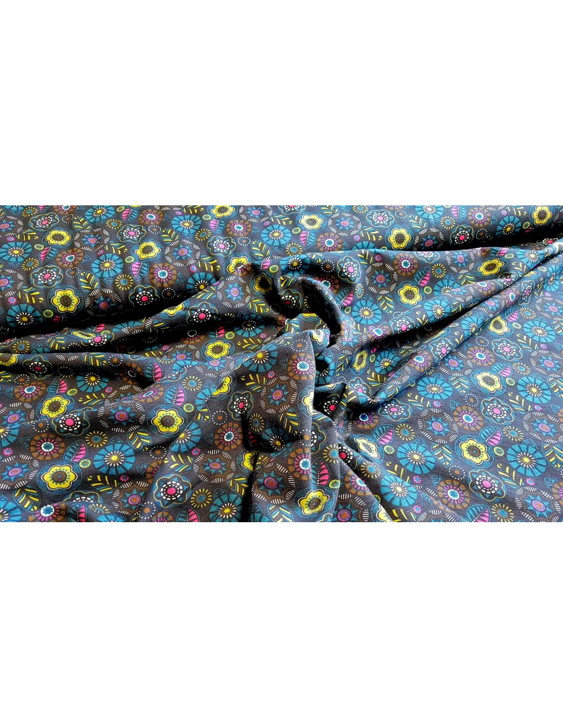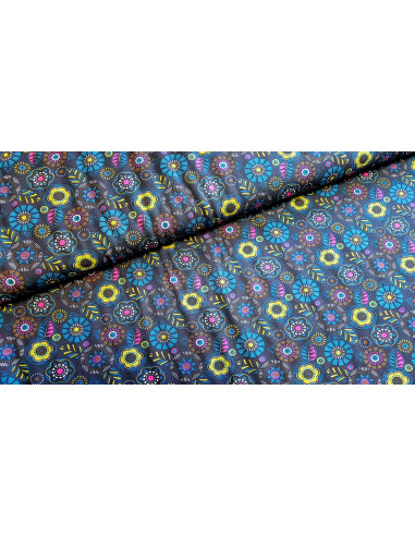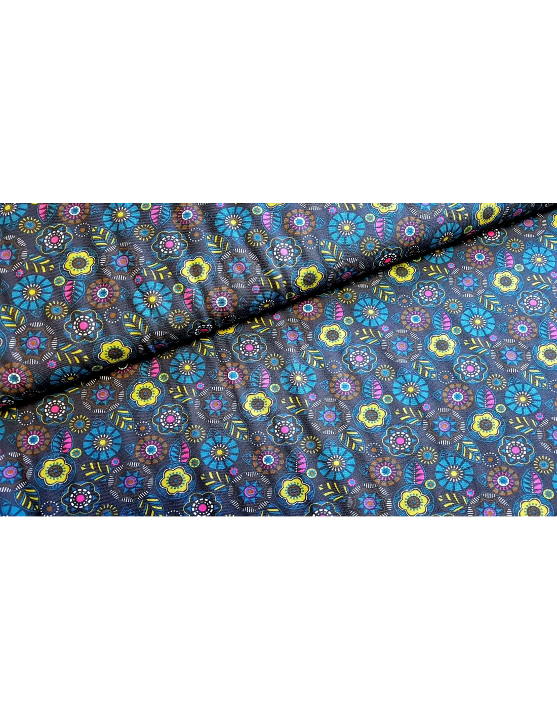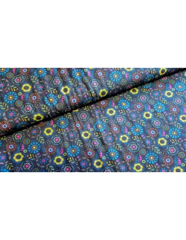 Beau tissus jersey coton bio à imprimés feuilles et cercles sur fond bleu marine.