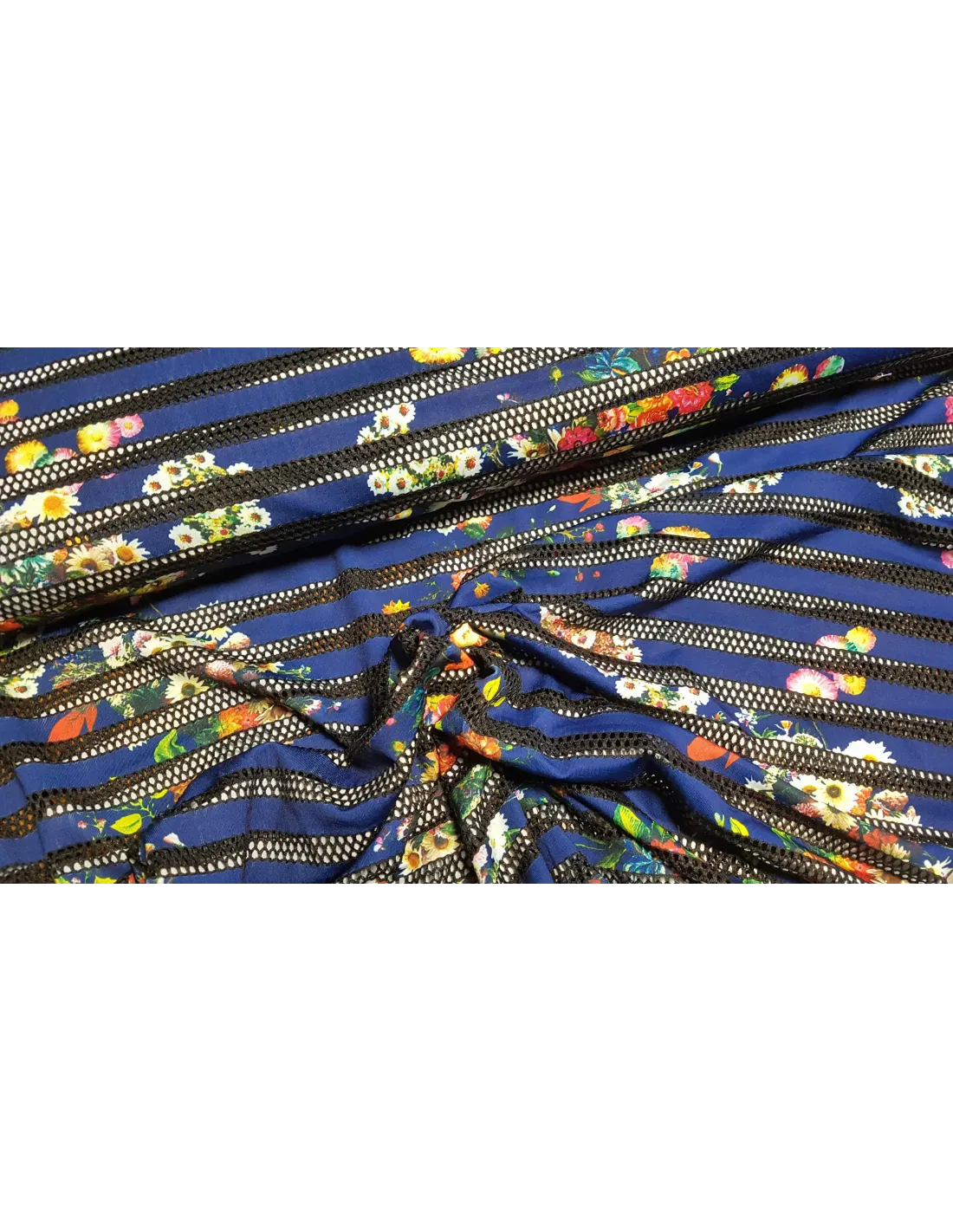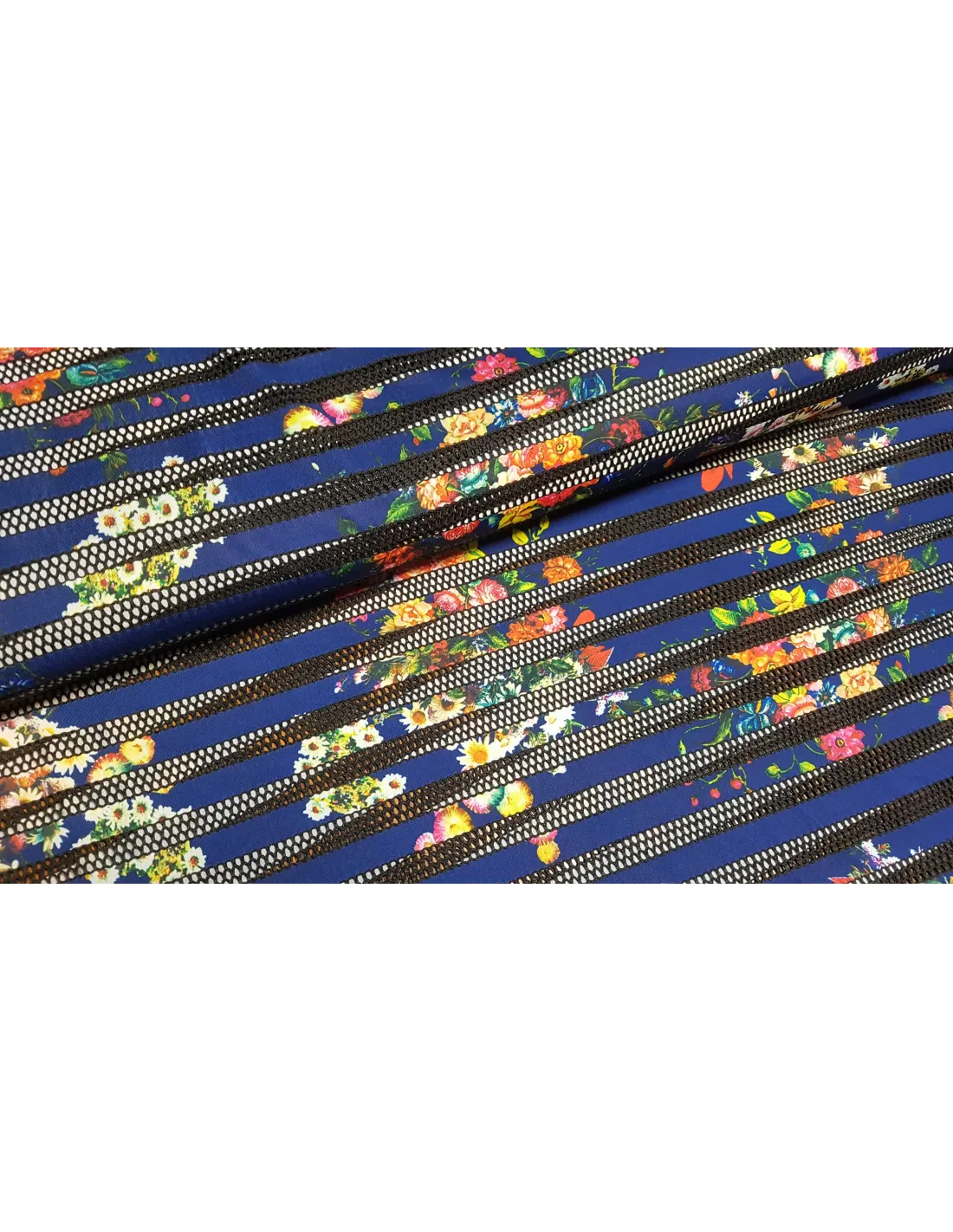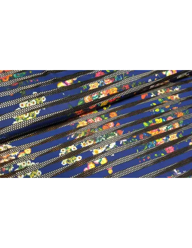 Beau jersey imprimé fleuri sur fond bleu marine avec des bandes style maille transparente.
