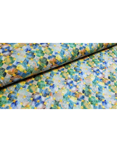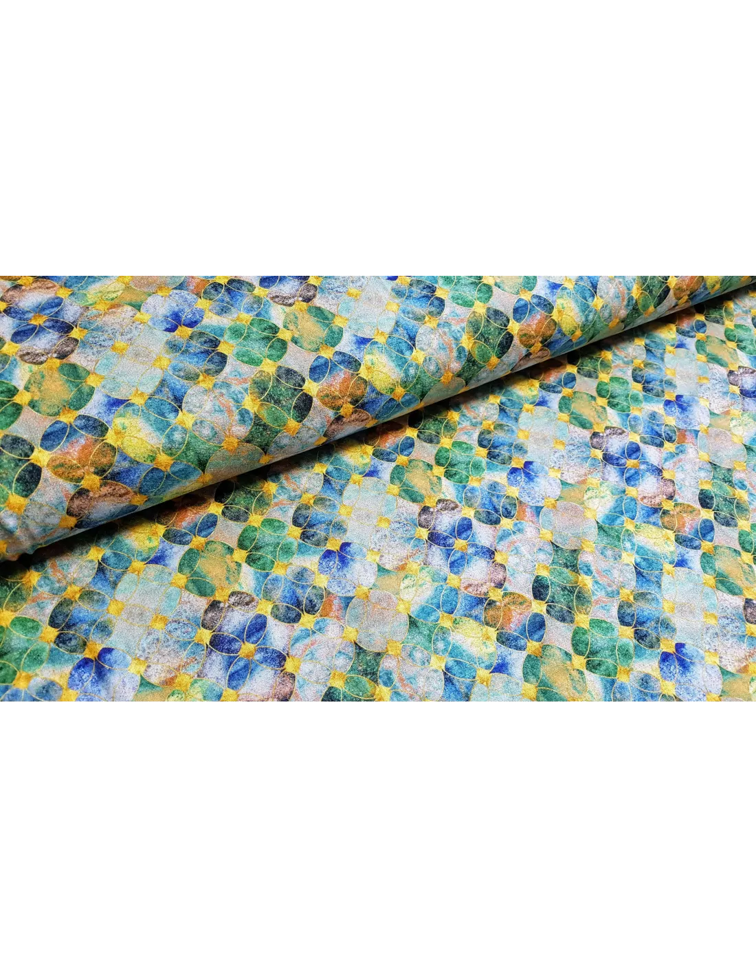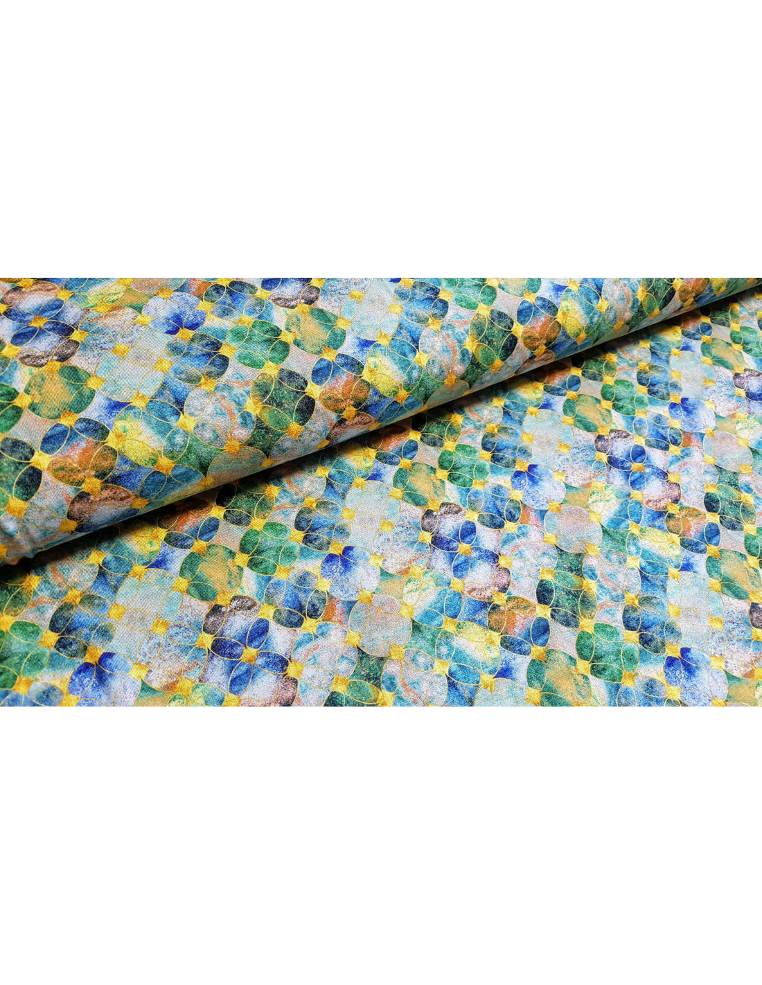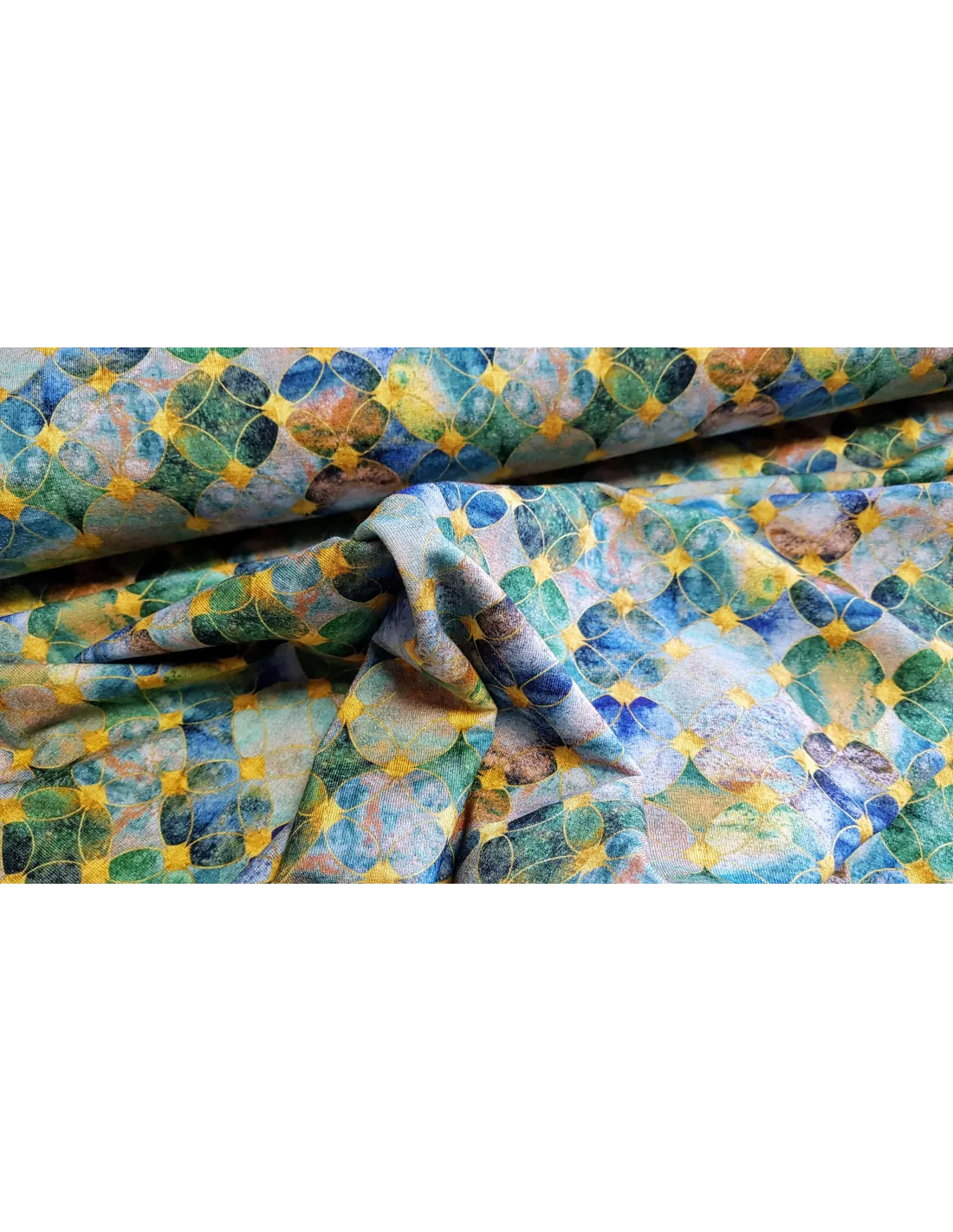 Magnifique jersey viscose à l'impression numérique, style oriental, dans les tons de vert et bleu.