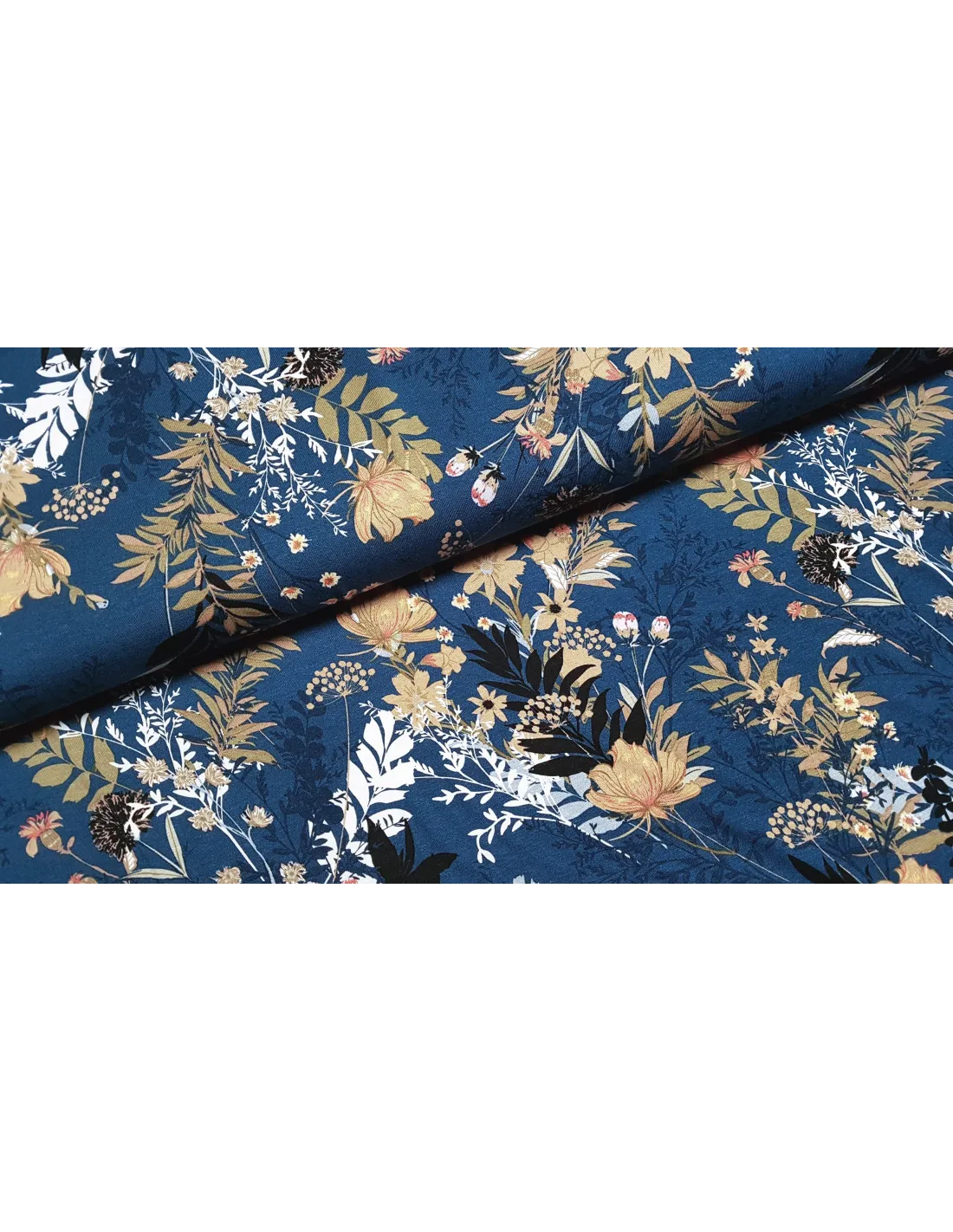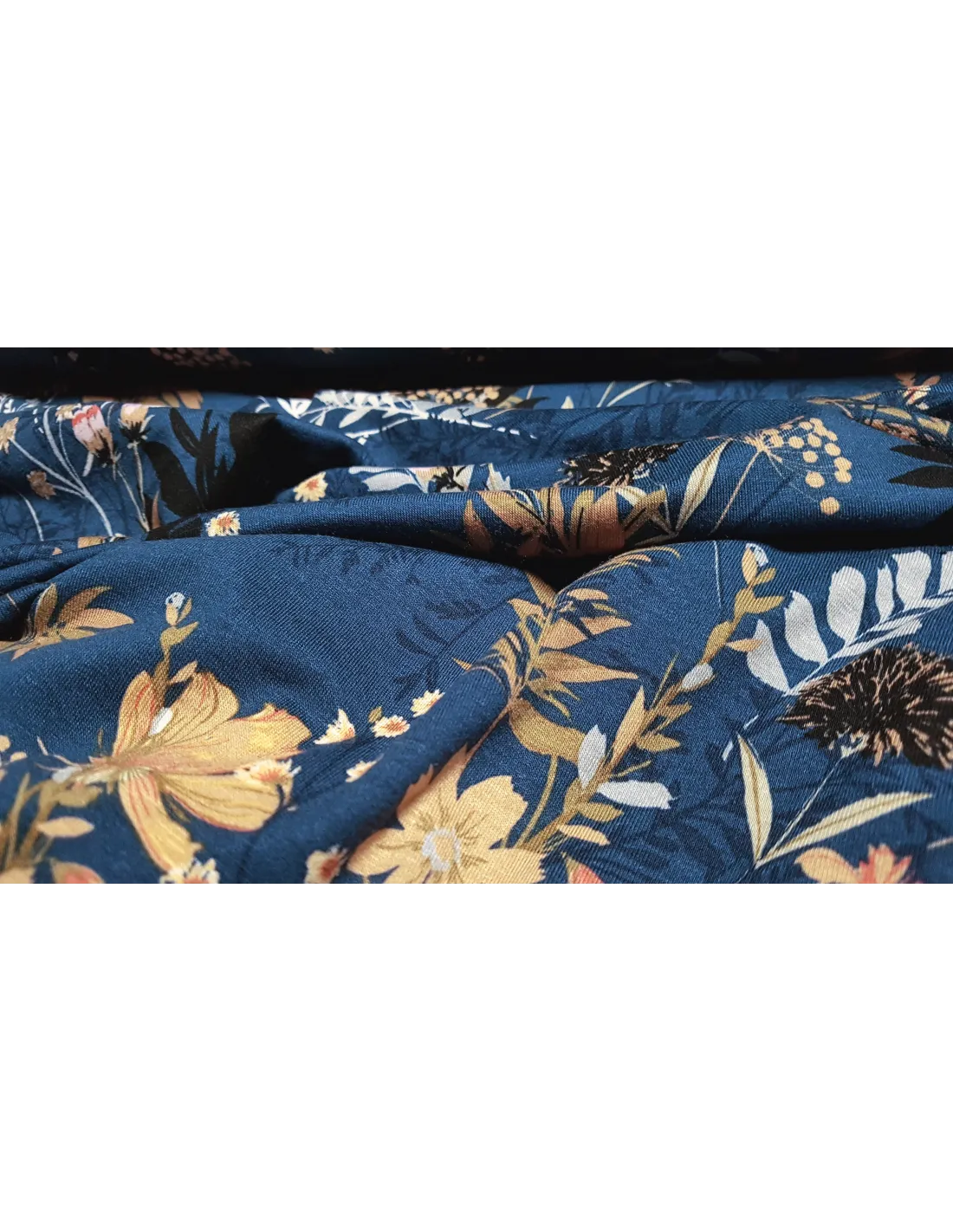 Jersey viscose feuilles et fleurs sur un fond bleu. Superbe pour faire un t-shirt, une robe ou tout ce qui vous plaira !