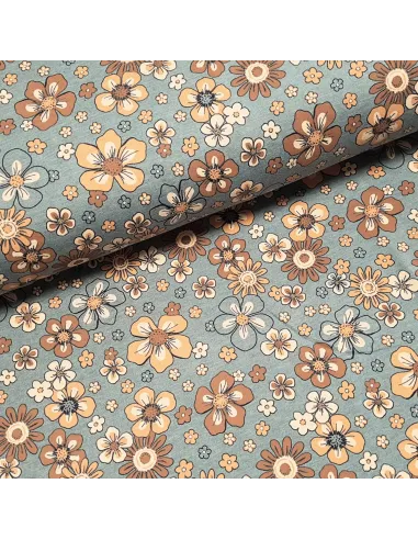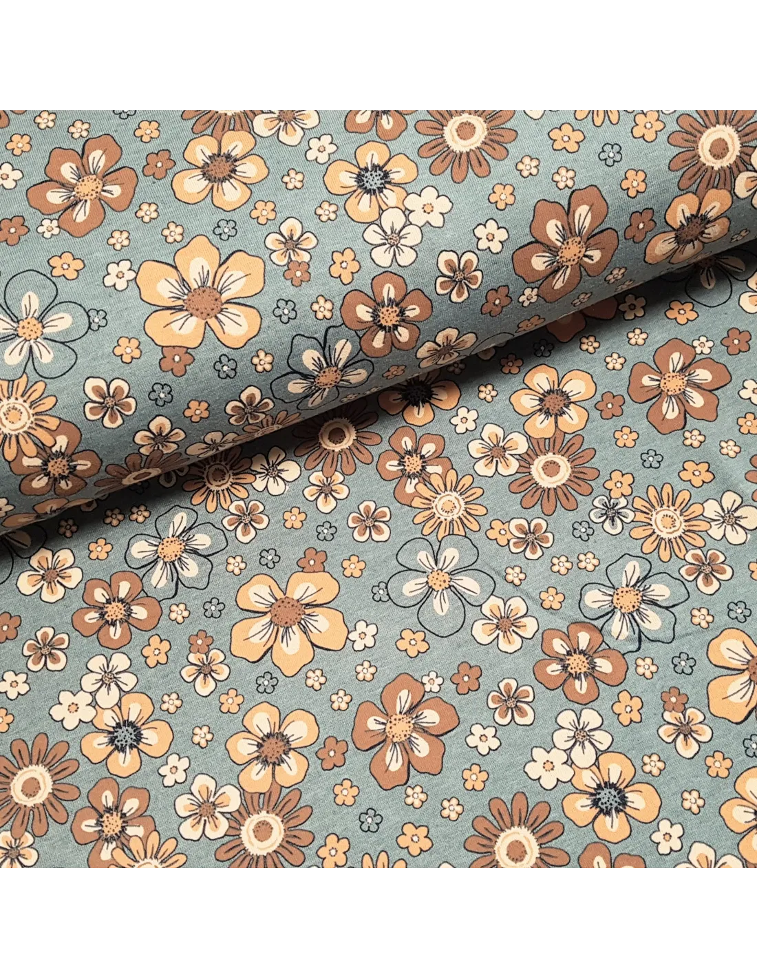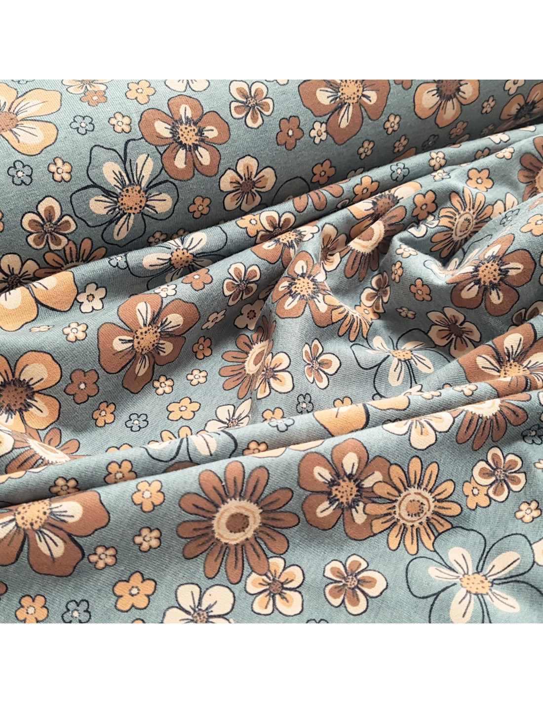 Jersey de coton imprimé fleurs sur fond bleu chiné. Superbe pour faire un t-shirt, une robe ou tout ce qui vous plaira !