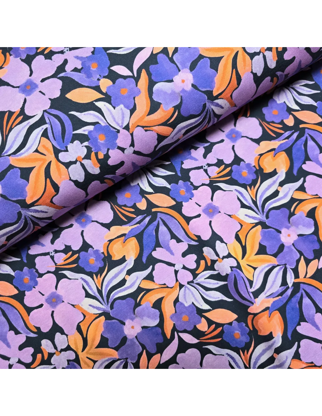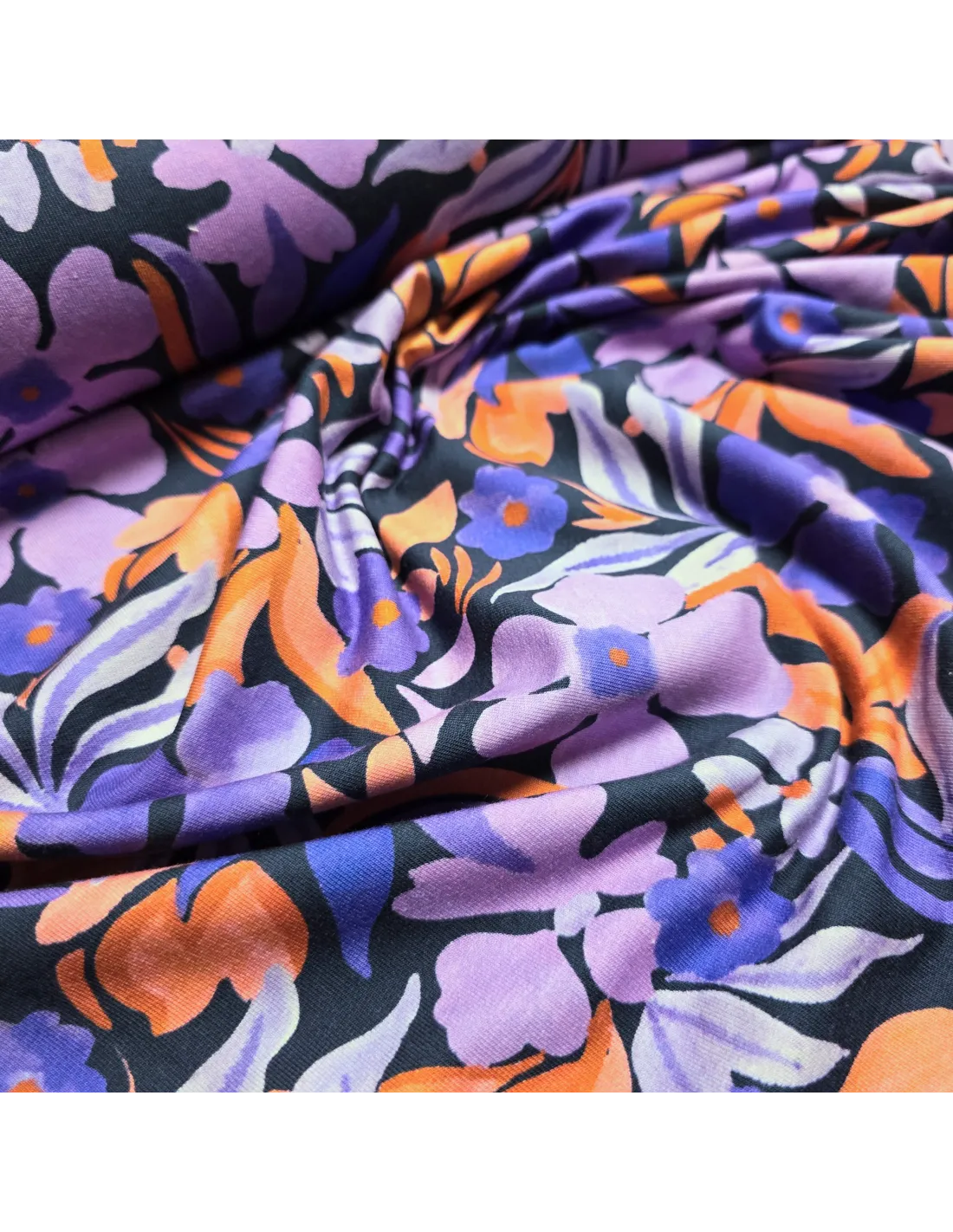 French terry coton, impression digitale, fleurs sur fond marine. Un peu plus épais qu'un jersey de coton simple. Superbe pour faire un t-shirt, une robe ou tout ce qui vous plaira !