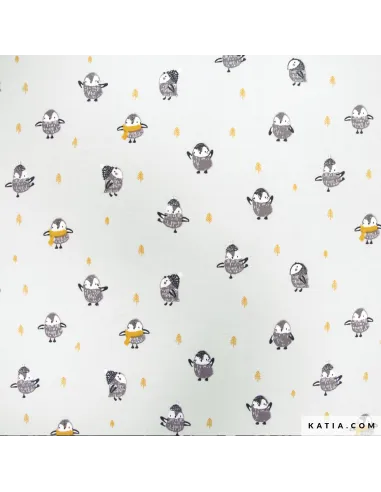 Tissu pour sweat épais pour l'hiver à l'intérieur molletonné, à la fois très chaud et doux. Avec un motif de pingouins dansant sur une fond gris clair. Le tissu pour sweatshirt d'hiver Sweat Penguins Dance de Katia Fabrics est idéal pour la confection de vêtements : des sweatshirts, des blousons ou même des pyjamas bien chauds pour toute la famille.