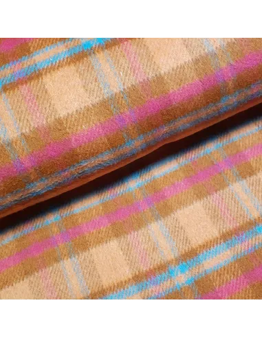 Lainage aux motifs carreaux, dans les tons orange, roses et bleus. Parfait pour la confection d'un manteau, d'une veste ou tout simplement d'une couverture. Doux au toucher. Envers carreaux.